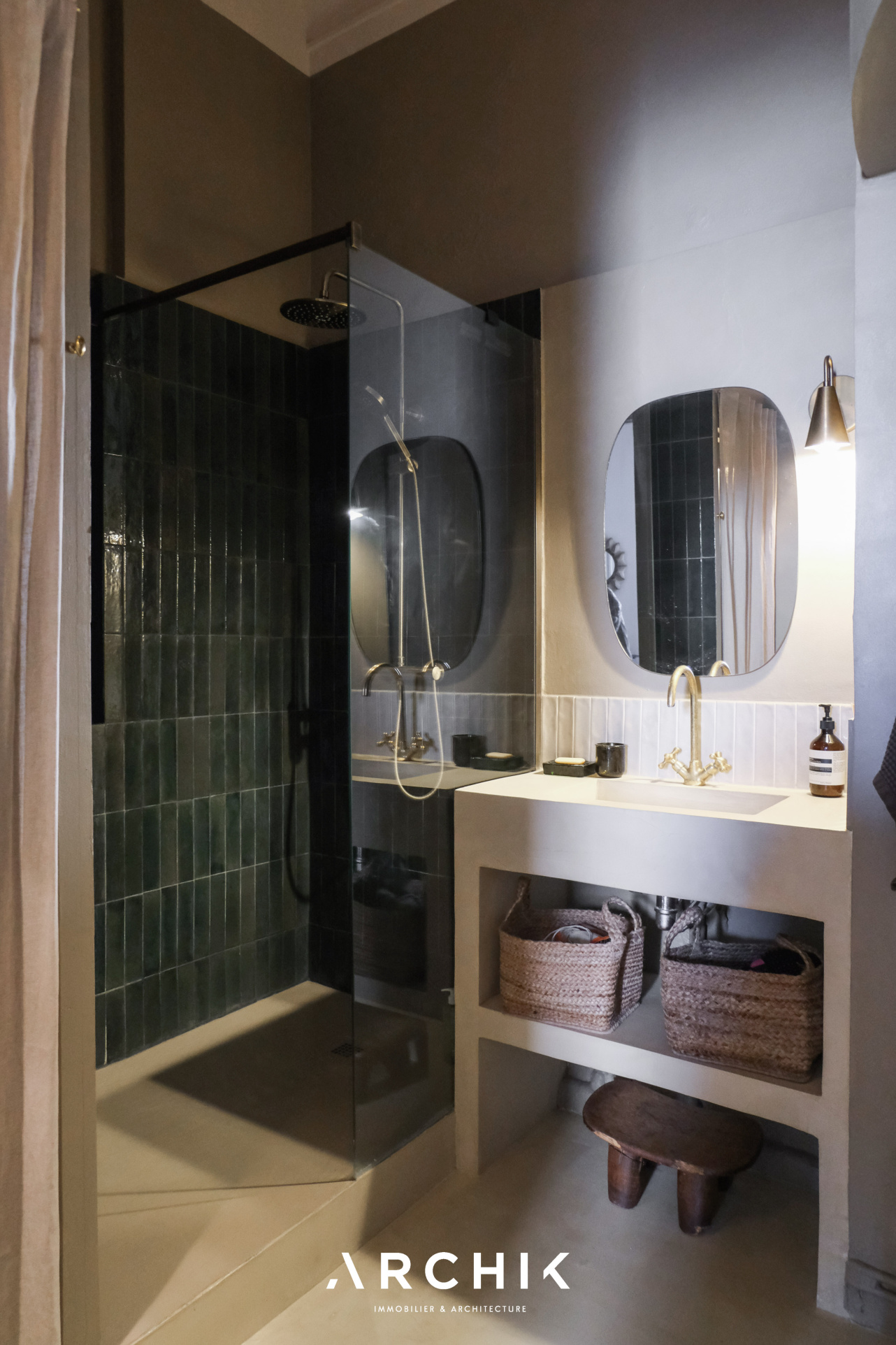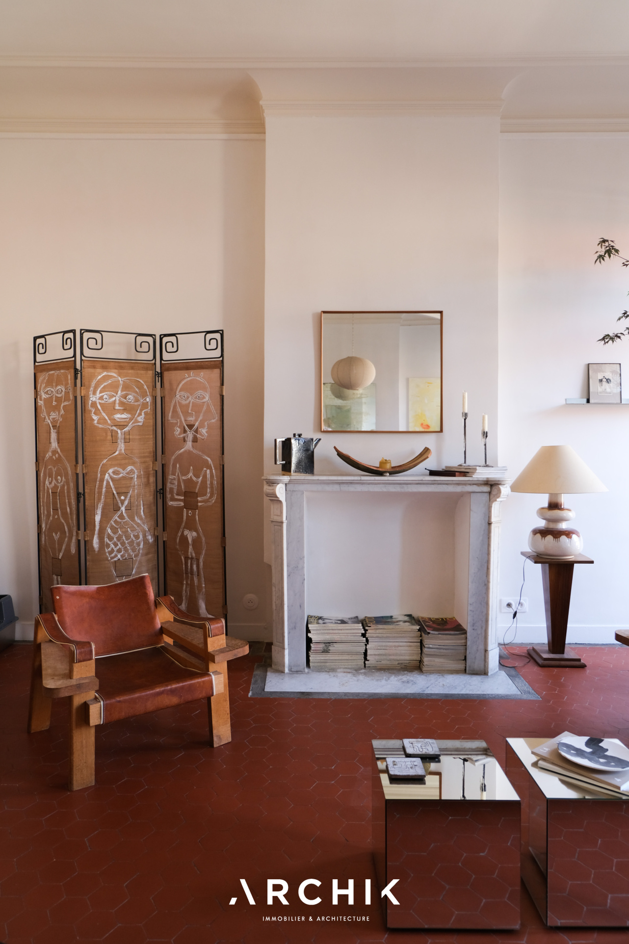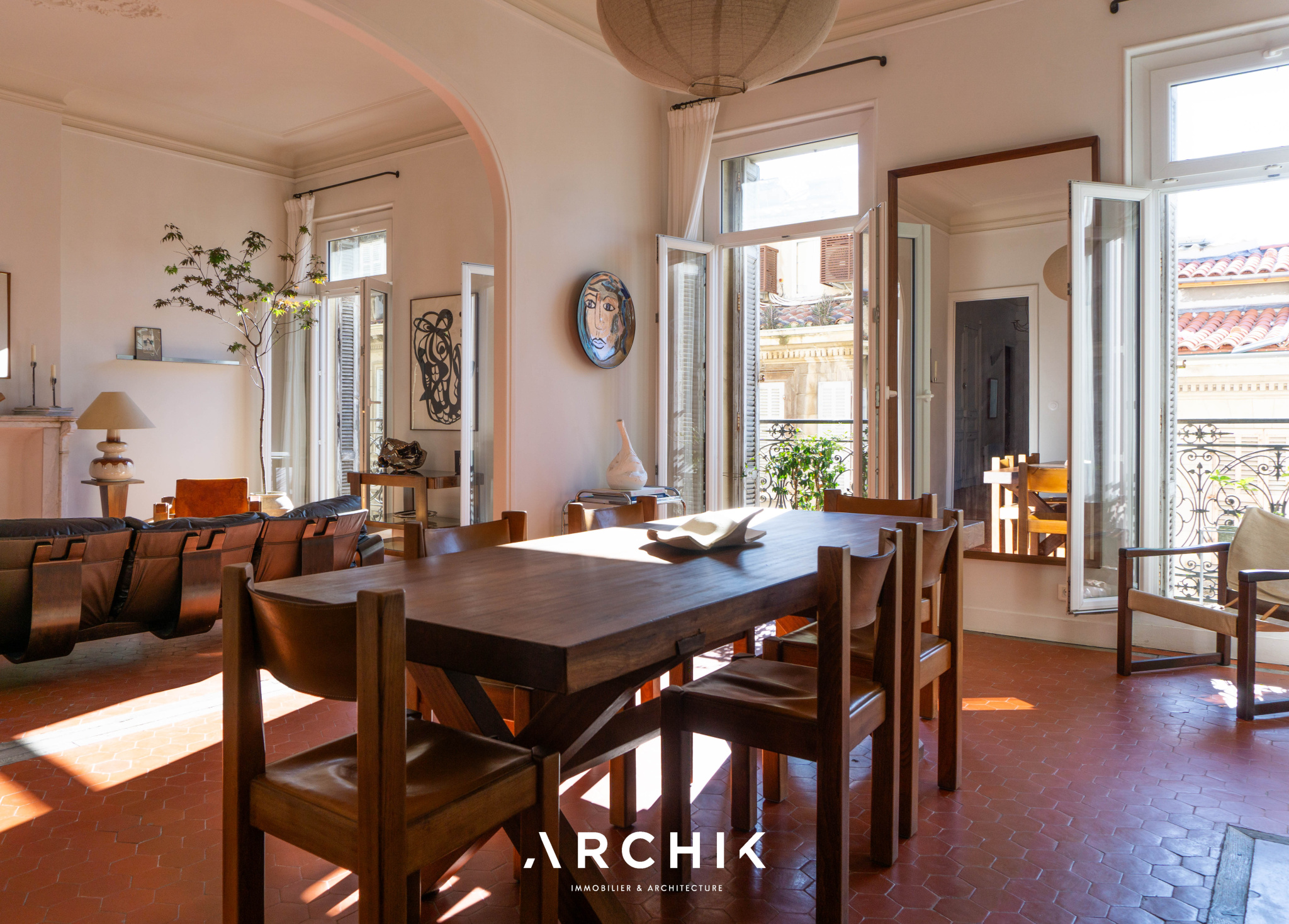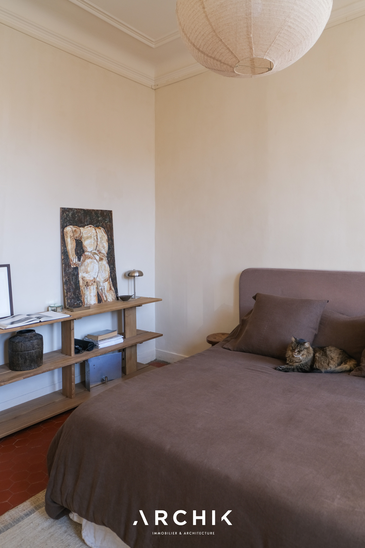 + DE DETAILS JEMA MARSEILLE 1ER | Thiers 550 000 € Type de bien Appartement Surface 116 m2 Chambre(s) 2 Extérieur Balcon Courant Art Nouveau Architecture À vivre Réference OP1780 ON AIMELa rénovation sans faute Le travail des matières Le balcon filant au calme sur courNOUS CONTACTER Architecture des années 1900, cet immeuble marseillais accueille en son troisième étage sans ascenseur un appartement de 116 m2 à la facture parfaite, situé dans une rue calme derrière le Conservatoire, dominant les toits.Repensé par le cabinet d'architecture d'intérieur Uname Studio et sublimé par la décoration de Jema Collective, le lieu séduit par l'alliance subtile des matériaux, l'équilibre des volumes et une palette chromatique inspirée des nuances autour de la terre d'ombre. À l'Ouest, l'appartement s'ouvre sur un lumineux et spacieux double séjour. La salle à manger, pensée pour accueillir de grandes tablées, communique avec le salon au travers d'une élégante arche. Les éléments d'époque, moulures et cheminées en marbre dialoguent avec un parti pris contemporain où dominent bois, inox et mobilier chiné avec soin. Les tomettes d'origine parcourent tout l'appartement, conférant une chaleur intemporelle à cet écrin singulier. La cuisine dinatoire en inox, réhaussée d'une crédence beige en Zelliges, s'ouvre sur un balcon filant ensoleillé. Une verrière striée relie l'une des chambres aux pièces de vie, permettant de moduler les espaces selon les besoins. La seconde chambre, confortable, profite de deux grandes fenêtres. Une salle de bain en Zelliges clairs ainsi qu'une salle d'eau en Zelliges verts viennent parfaire le confort du lieu. Une chambre de service aménagée et décorée au goût de l'appartement ainsi qu'une cave complètent l'ensemble. Singulier & précis. LE QUARTIER Thiers Artistique et populaire, ce quartier est situé au bas du cours Julien. VOTRE CONTACT Manon VANDENHOECK 06 70 21 52 38 manon.vandenhoeck@archik.fr DIAGNOSTICTRANSPORTSM2 NOAILLES I BUS 81PARTAGERDétail du diagnostic Diagnostic de performance énergétique 191 KWh/m².an 6* kg CO2/m².an Logement économeABCDEFGLogement énergivore DPE vierge Consommations non exploitables Non soumis au diagnostic * Dont émissions de gaz à effet de serreFaible émission de GESABCDEFGForte émission de GES 6 KgéqCO2 / m².an GES vierge Consommations non exploitables Montant estimé des dépenses annuelles d'énergie pour un usage standard : entre 1700 et 2340 € TTC/an . Date de référence des prix de l'énergie pour établie cette estimation : 01/01/2025 Les informations sur les risques auxquels ce bien est exposé sont disponibles sur le site Géorisques : www.georisques.gouv.fr Vous souhaitez avoir plus d'informations ? Remplissez le formulaire ou contactez directement la personne en charge de ce bien. NOM* PRÉNOM* EMAIL* TÉLÉPHONE* MESSAGE Je souhaite recevoir la Newsletter ARCHIK VOTRE CONTACT Manon VANDENHOECK 06 70 21 52 38 manon.vandenhoeck@archik.fr Découvrez aussi ...VENDRENos biens en venteNOS BIENS VENDUS