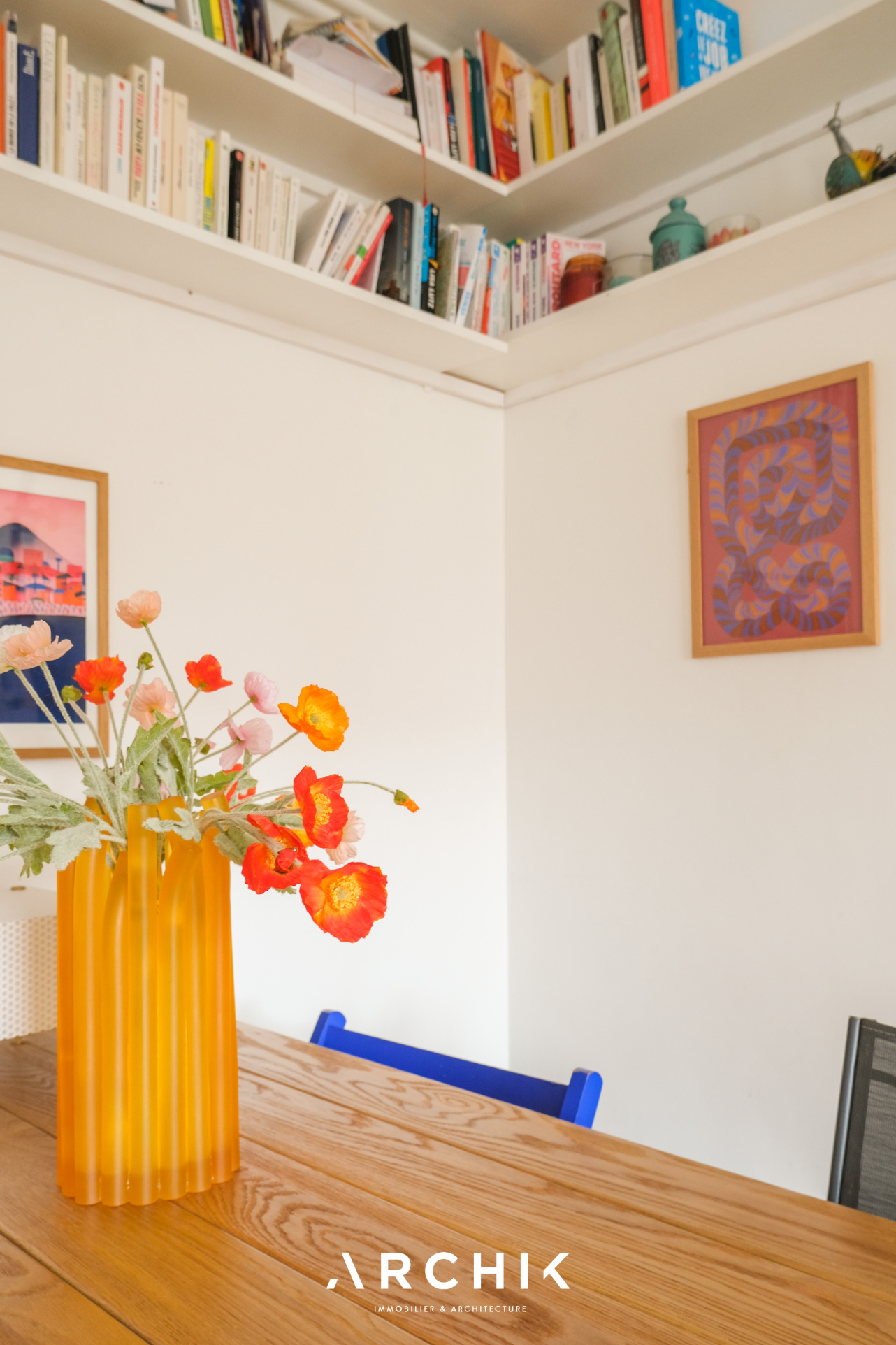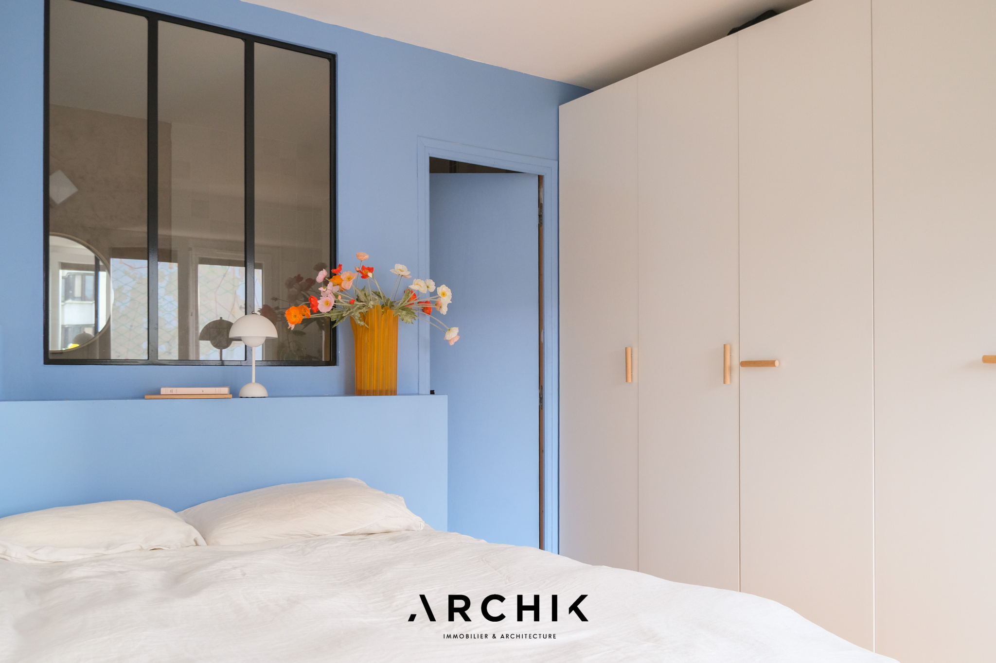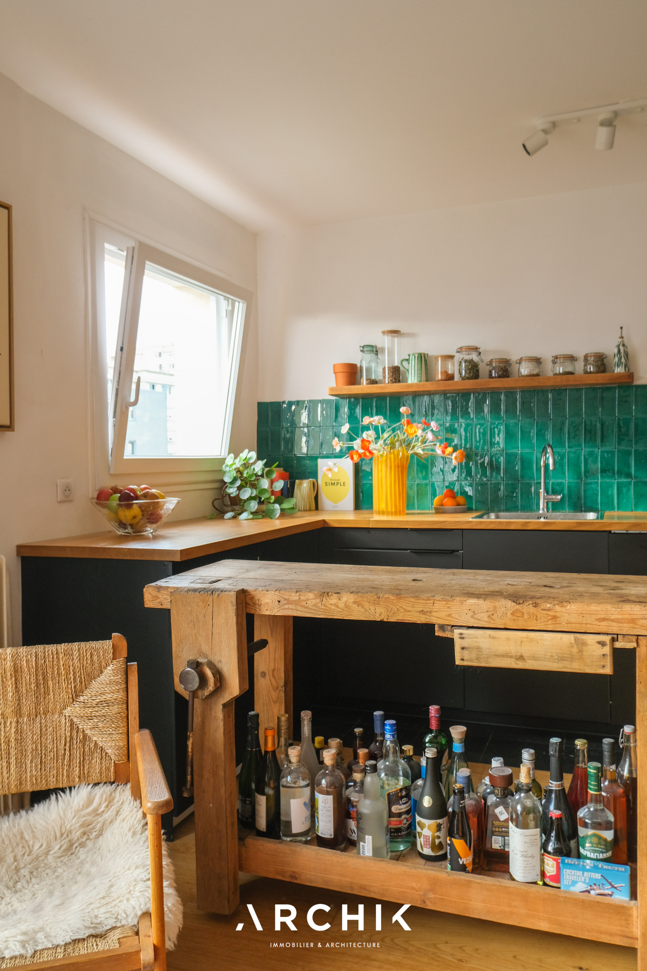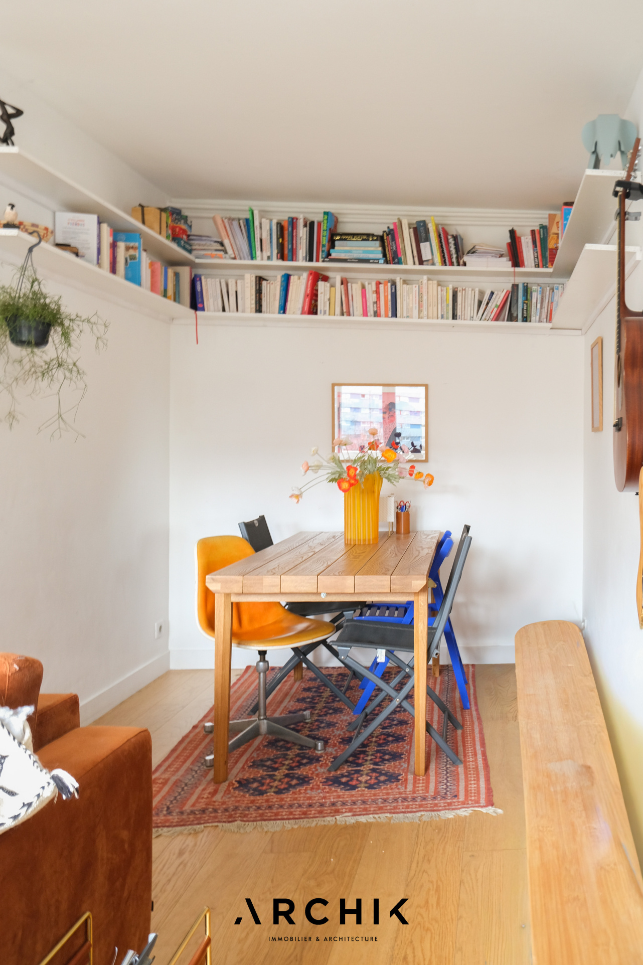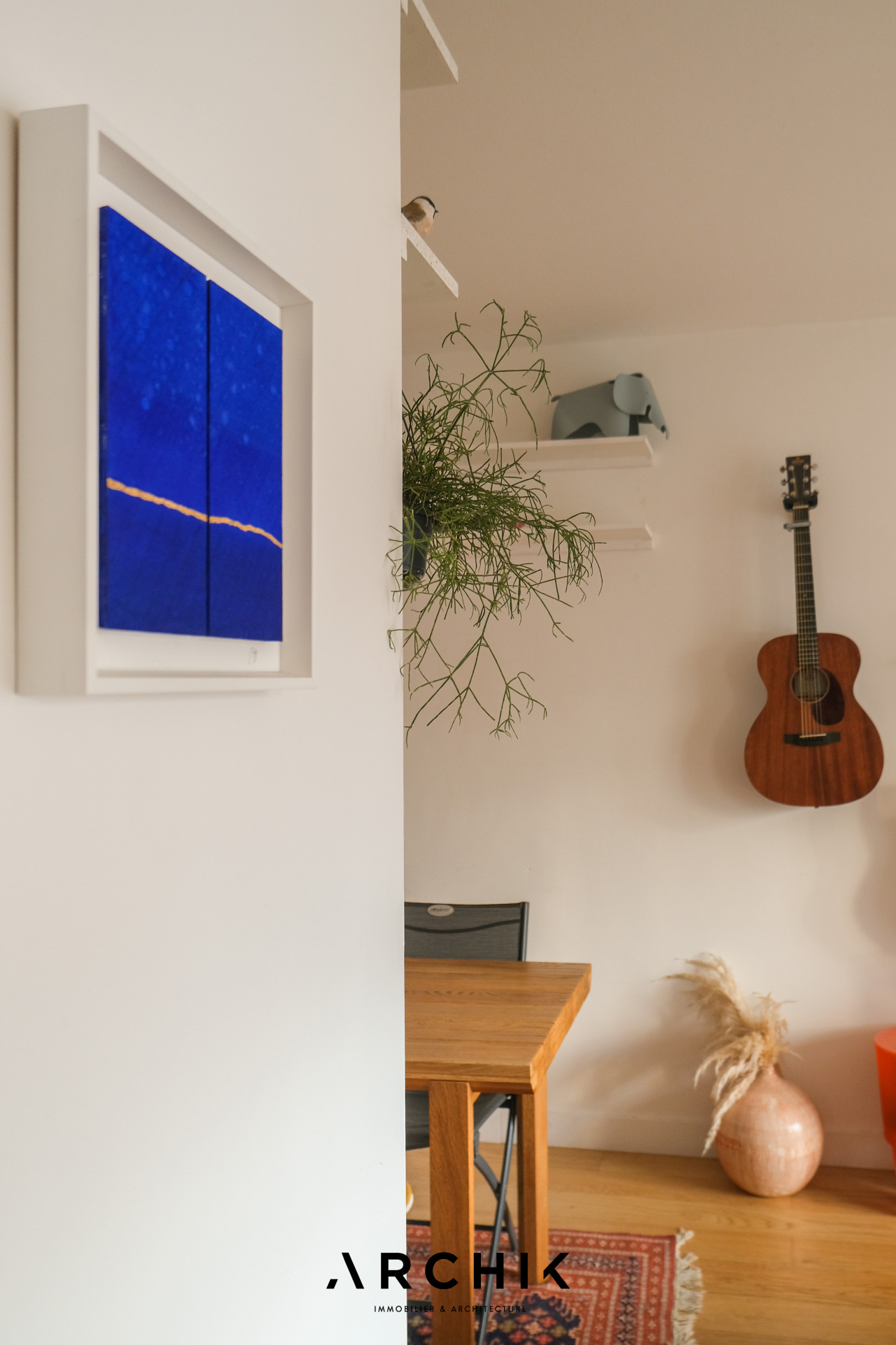 Réaménagé en 2022 par l'architecte Paola SABOURIN, le bien de 47,4 m2, a fait l'objet d'une restructuration complète. Le plan a été redessiné pour fluidifier la circulation et ouvrir les perspectives. L'architecte a également pensé l'ensemble du mobilier qui a été dessiné sur mesure. Fidèle à son écriture, elle compose ici un intérieur aux lignes nettes et aux volumes lisibles, où la fonctionnalité devient un parti pris esthétique.