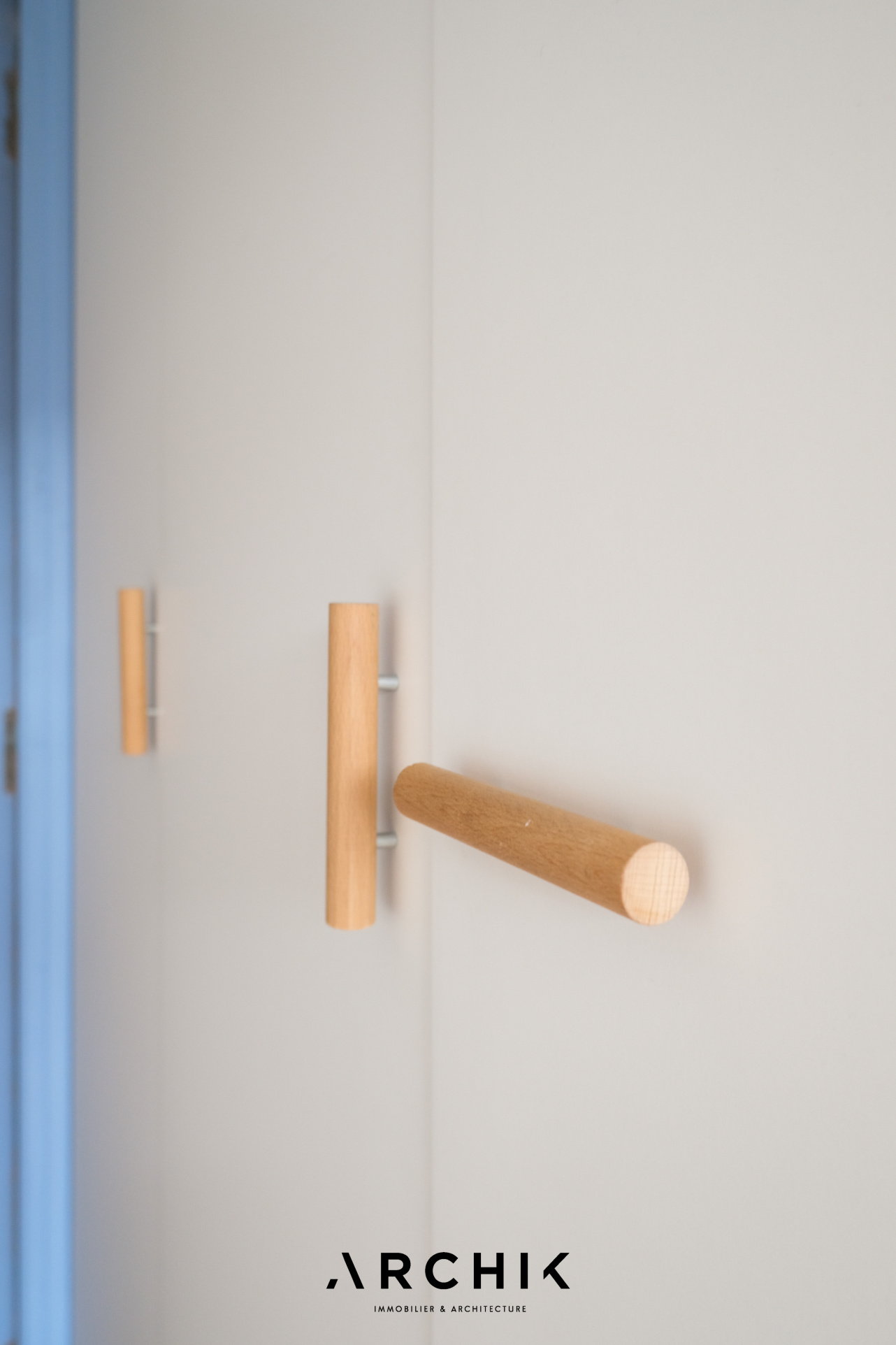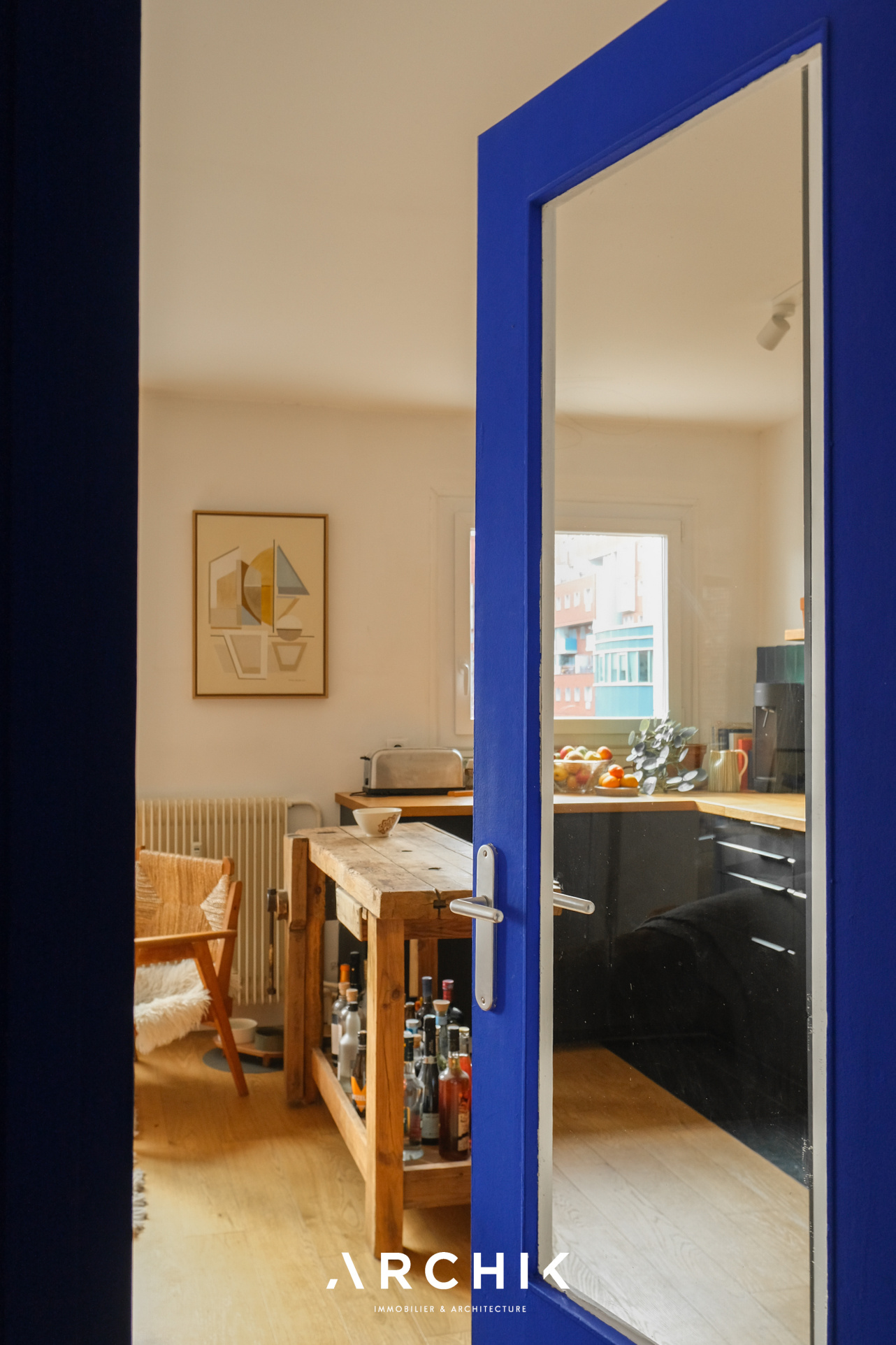 Dès l'entrée, le ton est donné : habillée d'un profond bleu Klein, elle créé un contraste subtil avec les matières naturelles du reste de l'appartement. Les rangements toute hauteur y sont intégrés avec discrétion, prolongeant la ligne architecturale. D'une part la pièce de vie accueille un séjour lumineux prolongé par une cuisine ouverte et sobre aux lignes épurées. Un second espace pouvant faire office de coin bureau ou salle à manger, permet de conjuguer télétravail et art de vivre sans compromettre l'harmonie des volumes. De l'autre une chambre, pensée comme un espace intime et apaisant, se distingue par un mur enveloppé d'un bleu profond qui berce la pièce dans une ambiance cosy et feutrée. Elle dispose de sa salle de bain attenante, traitée dans des matériaux sobres et intemporels.