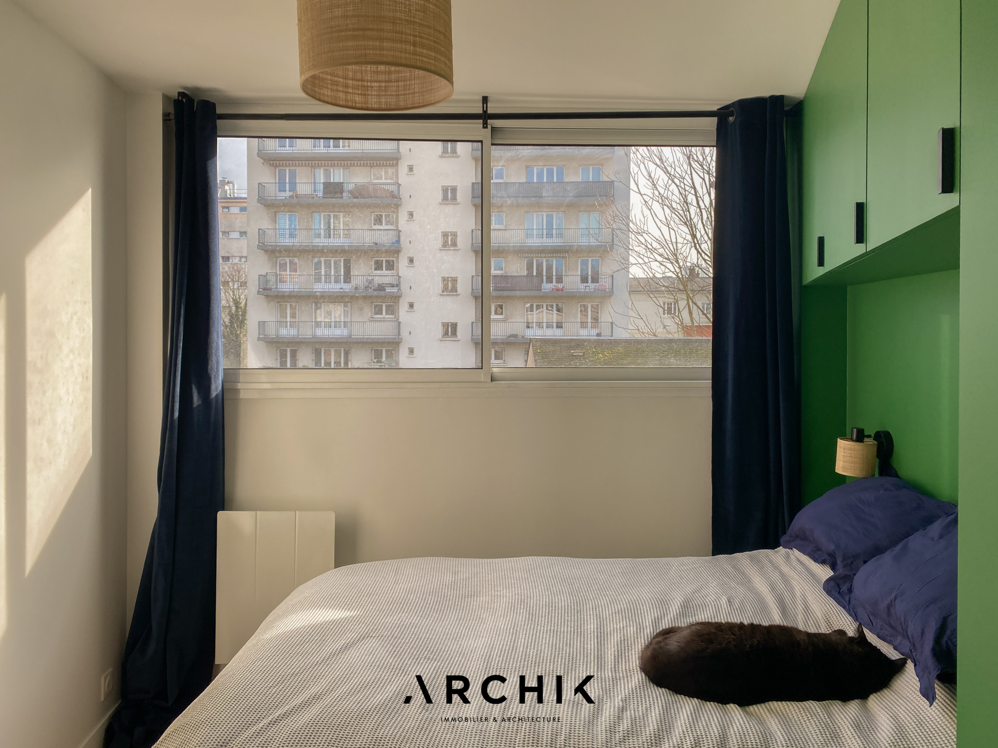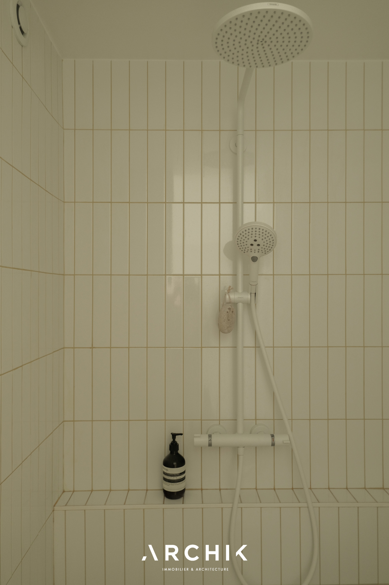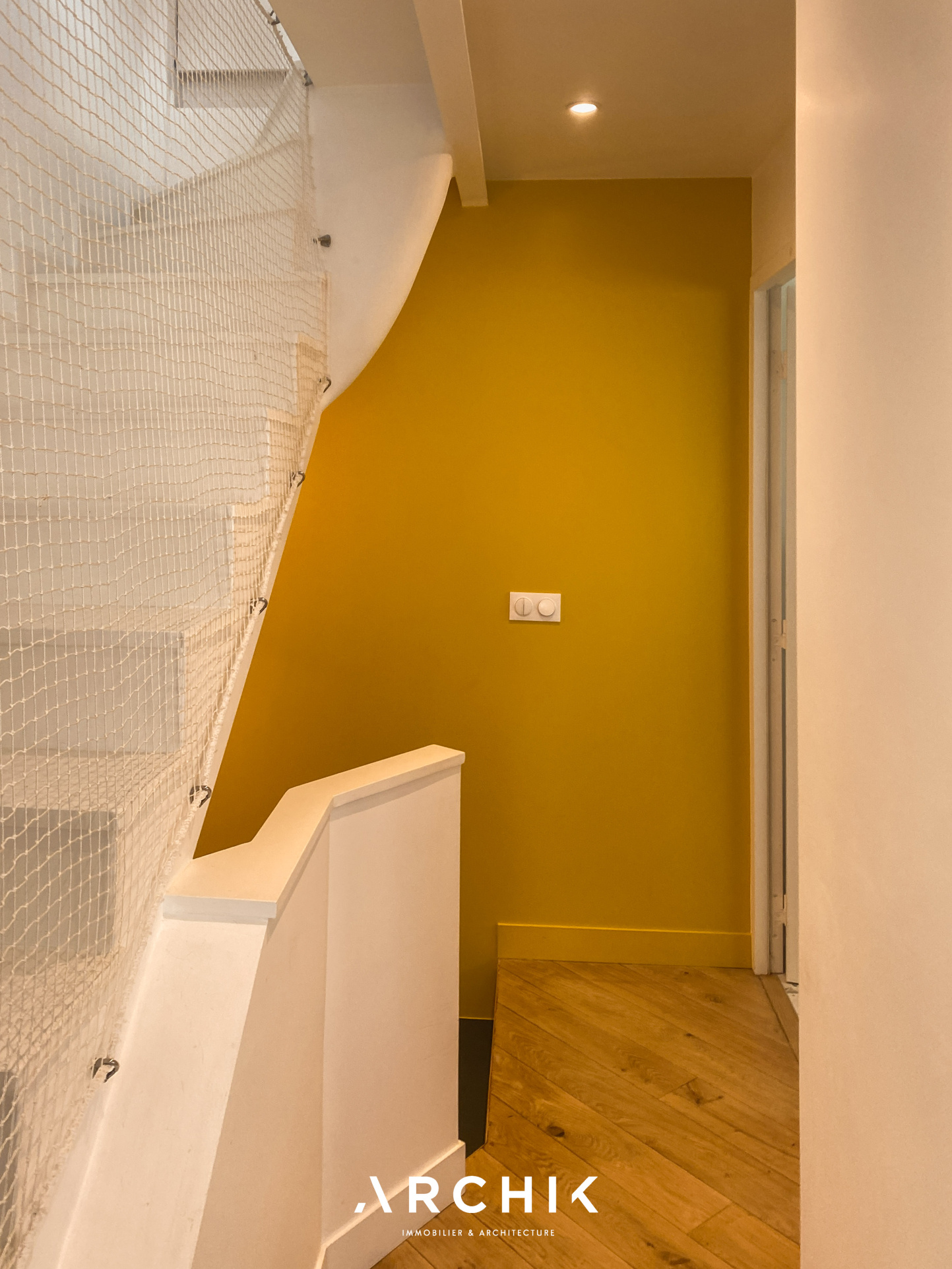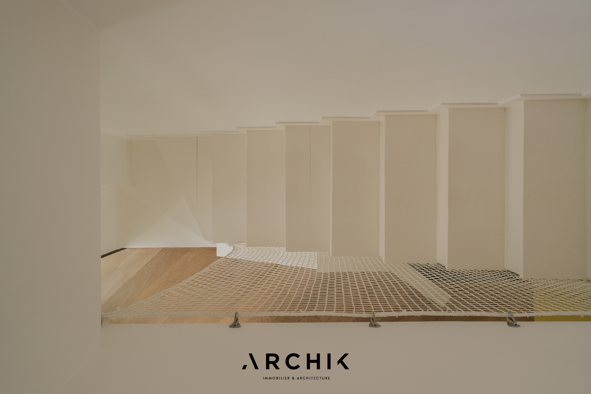 Dès l'entrée, la verticalité du lieu se révèle à travers un escalier sculptural orné d'un filet suspendu dialoguant avec la lumière naturelle. Au premier niveau, une chambre parentale avec rangements tout hauteur profite dès le matin de la lumière de l'Est. Une chambre d'enfant attenante offre également de beaux volumes. Les deux pièces se partagent une salle d'eau aux accents seventies et aux notes jaune pop, intégrant un espace buanderie.