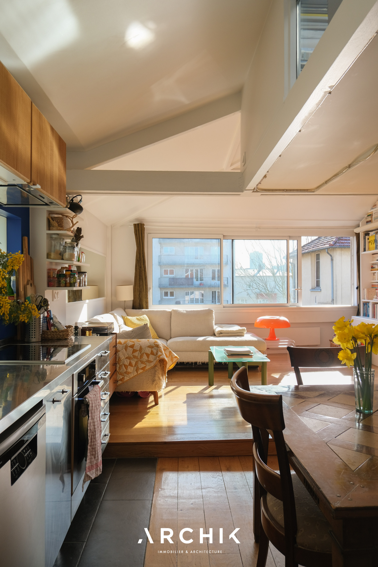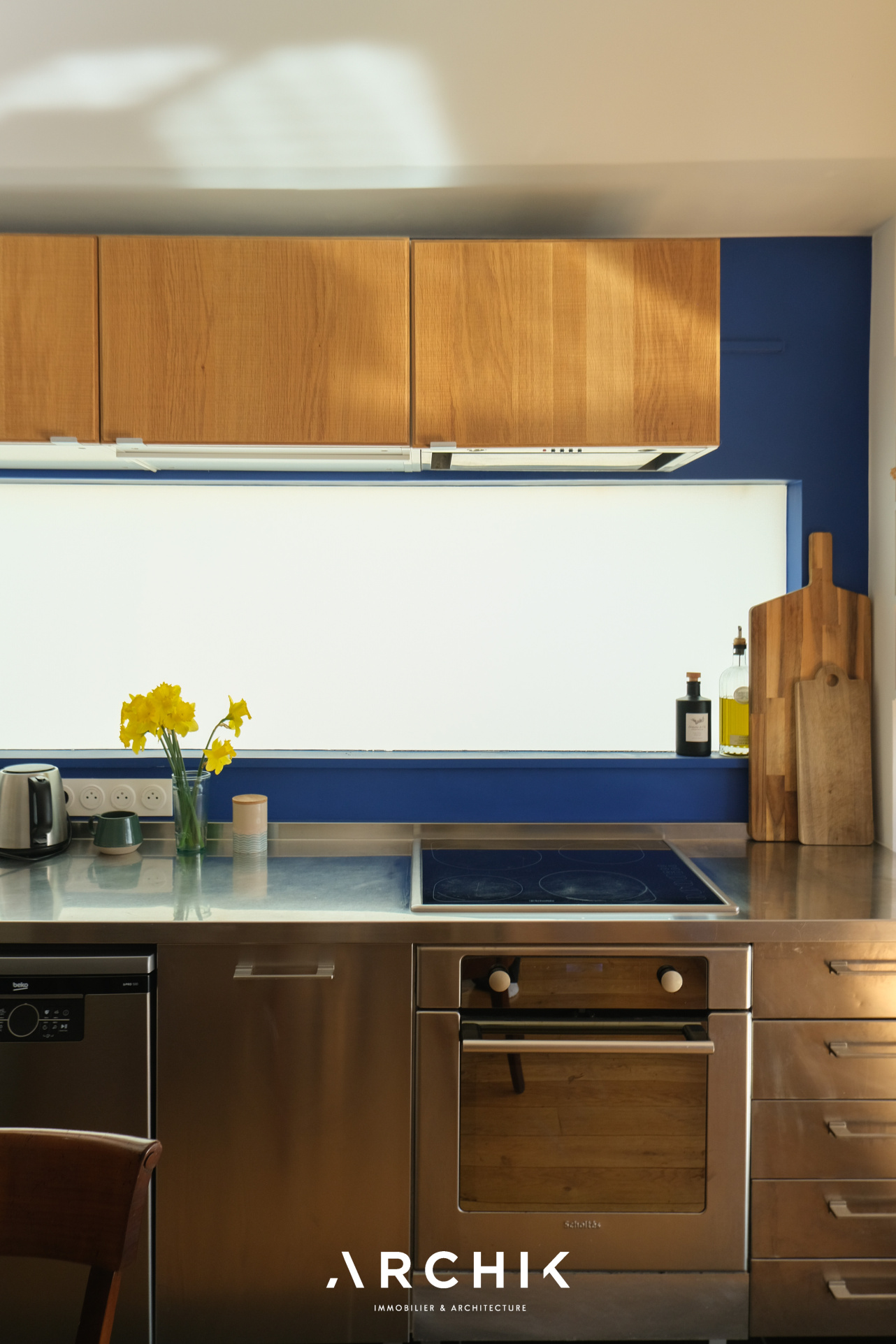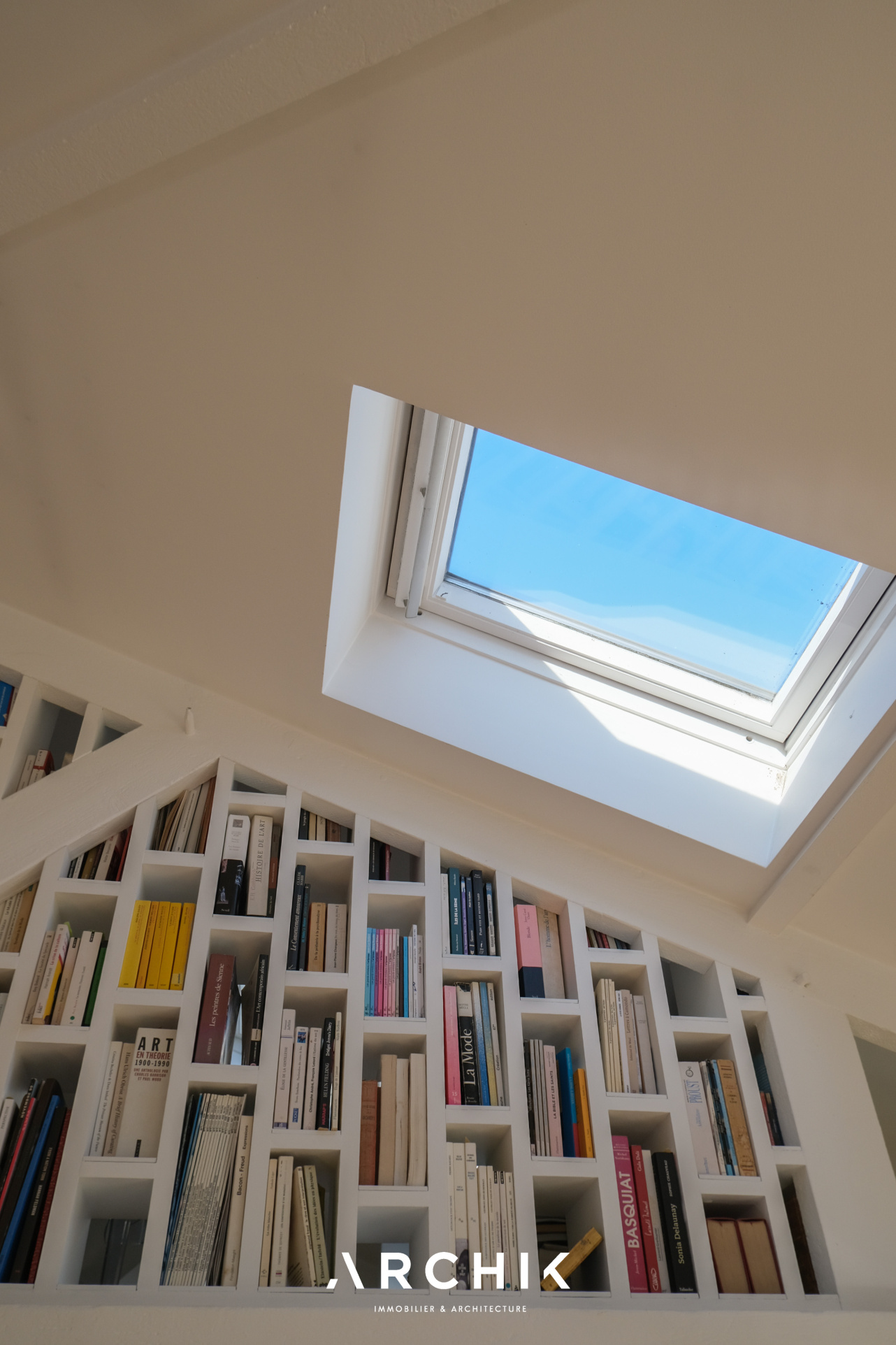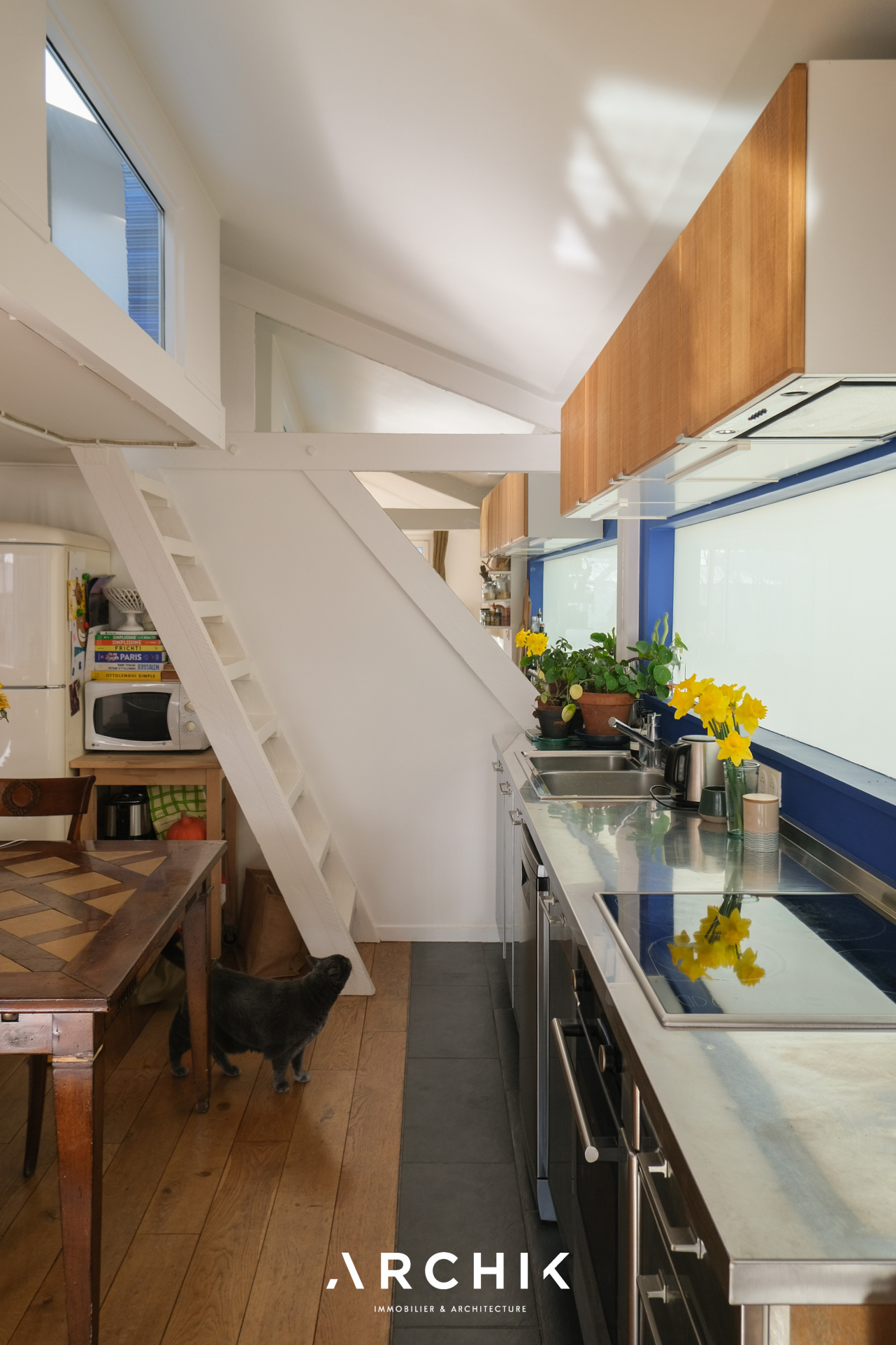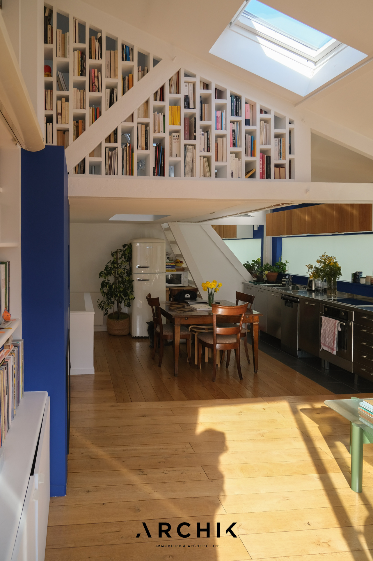 La cuisine en inox et l'espace repas prennent place sous la mezzanine, ponctués de jeux de vitrages qui maintiennent une continuité visuelle et lumineuse entre les niveaux. La bibliothèque ajourée en bord de mezzanine fait office de claustra, laissant passer la lumière tout en structurant l'ensemble.