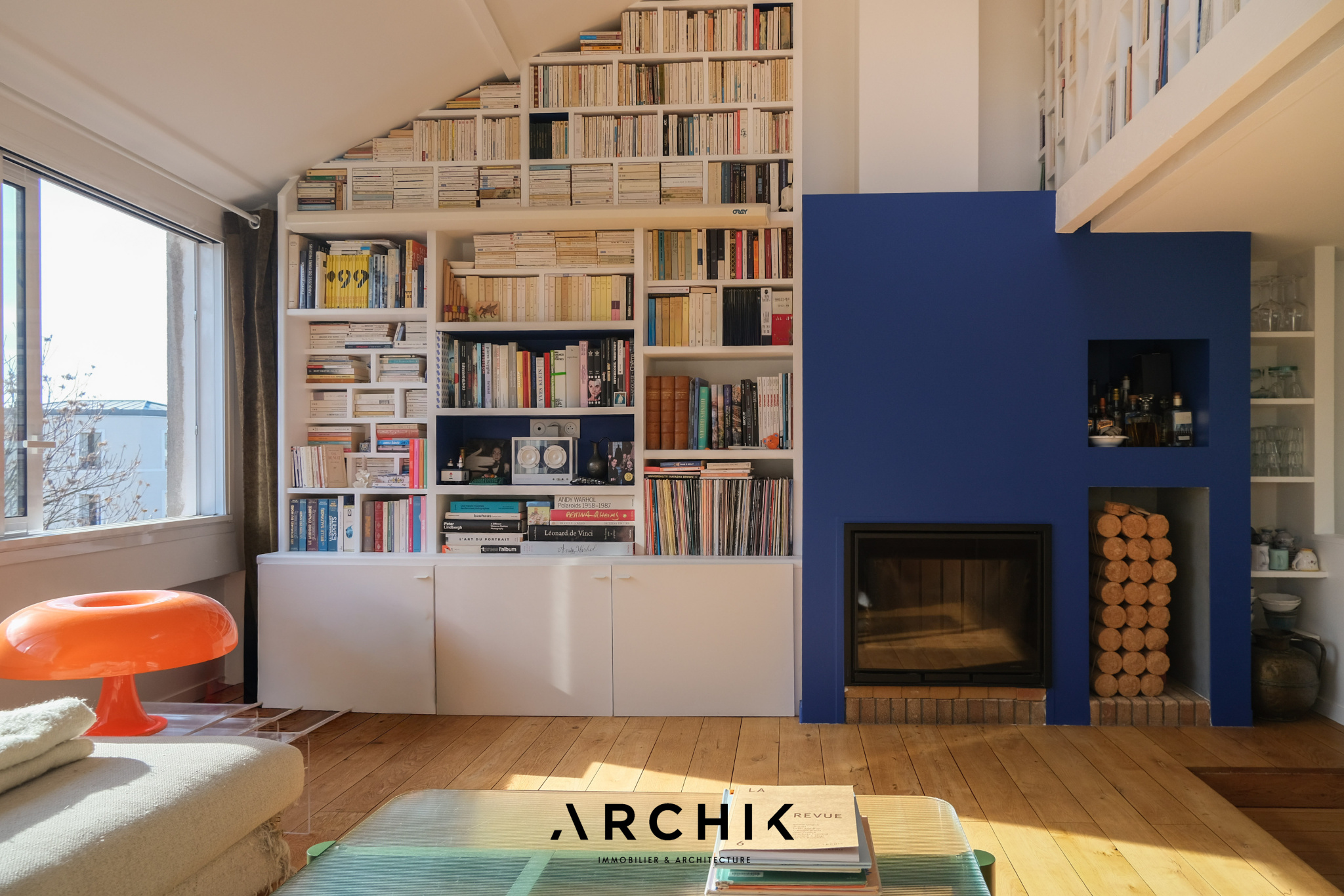 Au deuxième niveau, la pièce de vie principale s'organise en plateau ouvert, où le parquet en bois massif unifie l'ensemble et diffuse une atmosphère douce et enveloppante. Véritable coeur de la maison, le volume central est structuré autour d'un élément architectural fort : un noyau habillé d'un bleu profond, intégrant cheminée fonctionnelle, niches et rangements. Le séjour, ouvert sur une large baie horizontale, profite d'une lumière régulière. Le salon s'organise naturellement autour de la cheminée, tandis qu'une bibliothèque sur mesure accompagne la hauteur sous plafond jusqu'à la mezzanine. Celle-ci forme un espace supplémentaire, pouvant accueillir un bureau ou un coin jeux, éclairé par une fenêtre de toit.