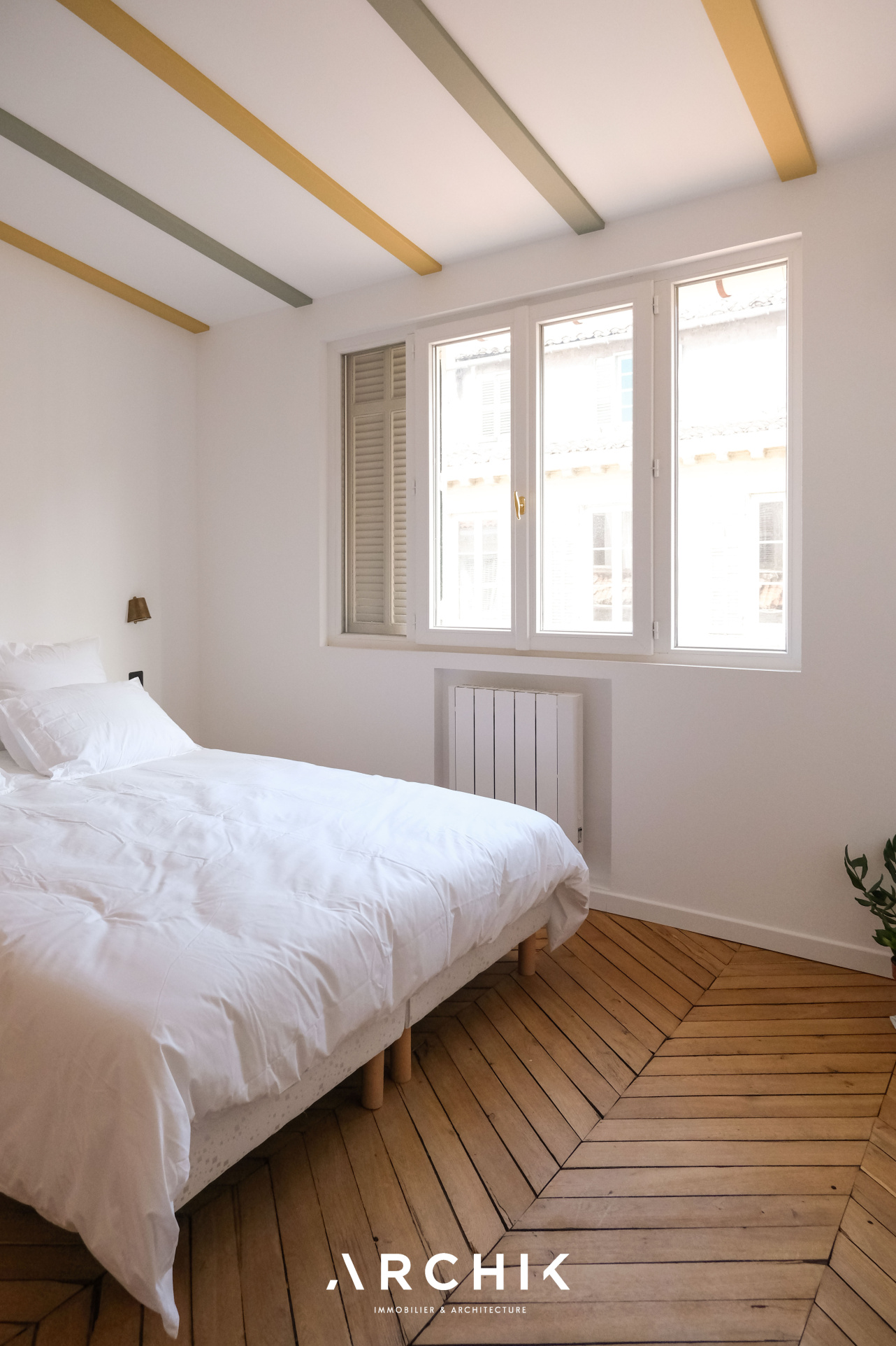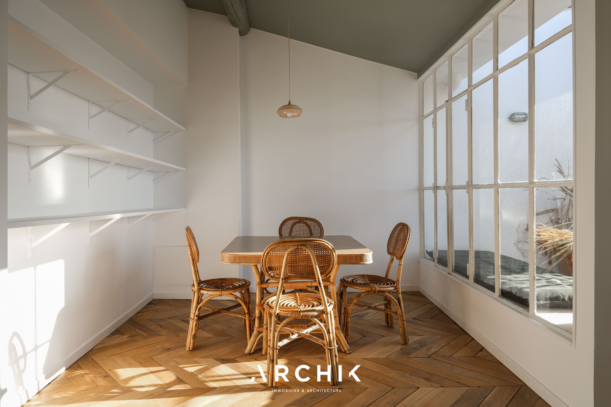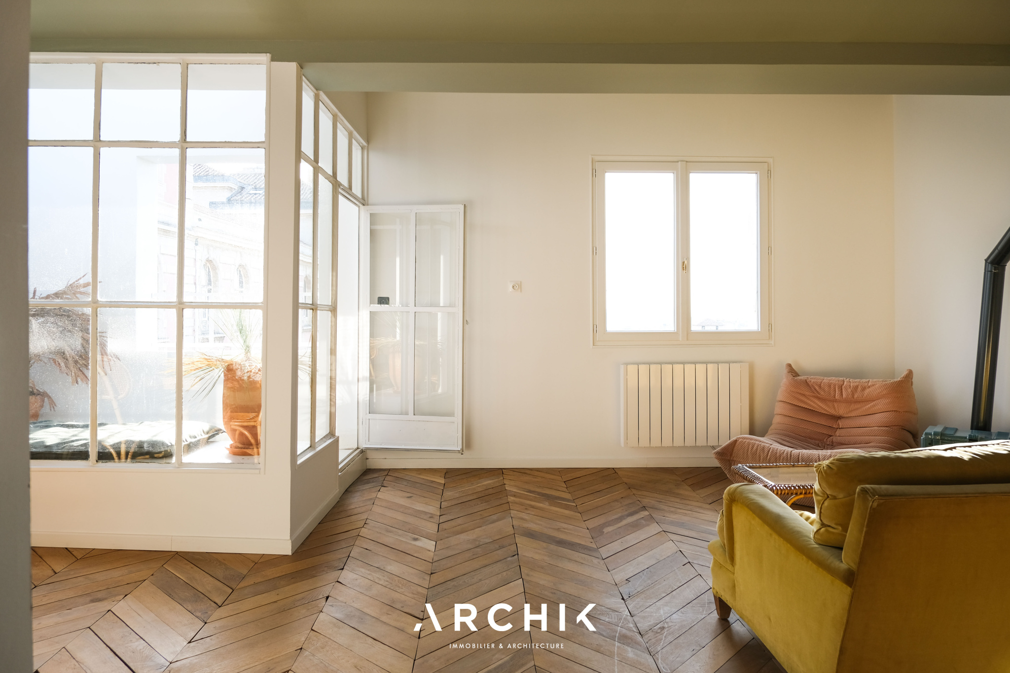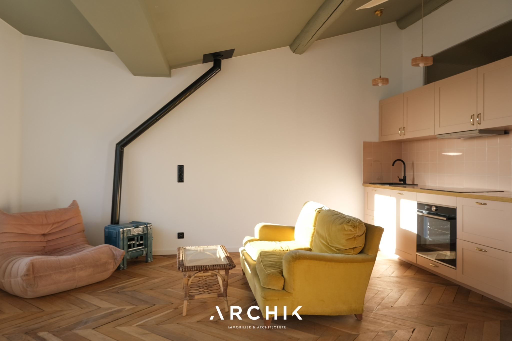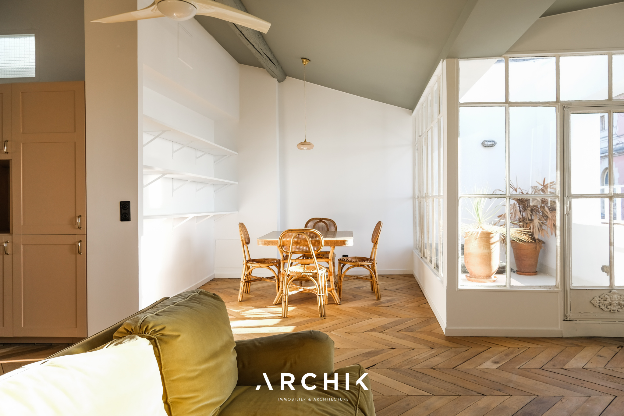 Entièrement restructuré par l'architecte d'intérieur Elodie Nectoux, l'appartement est singulier par son mélange de matériaux, son volume et l'harmonie de ses couleurs autour du rose et du vert olive, emblématique de la Provence. L'appartement se dévoile à l'Ouest par un grand séjour prolongé par une terrasse immaculée de 6 m2 qui se vit comme un patio avec ses verrières. La vue est imprenable sur les toits en tuile, la mer, les îles du Frioul au loin, le Clocher des Accoules, la Major, et la Vieille Charité. Dedans, le poêle à bois chiné en porcelaine fait apparaitre la belle hauteur sous plafond soulignée par le plafond peint. Le travail de la couleur est savamment décliné dans la cuisine avec un carrelage rose poudré souligné par du laiton brossé. L'appartement est entièrement vêtu d'un parquet en point de Hongrie, travaillé de façon brute et rappelant les ateliers d'artiste. Coté Est, deux généreuses chambres dotées de grands dressings offrent des vues dégagées. Au plafond, les poutres ont été peintes dans un jeu de jaune et de vert rappelant les couleurs du salon. La salle de bains reste harmonieusement dans les mêmes tonalités, sa douche à l'italienne s'habille d'une verrière au teintes fumées.