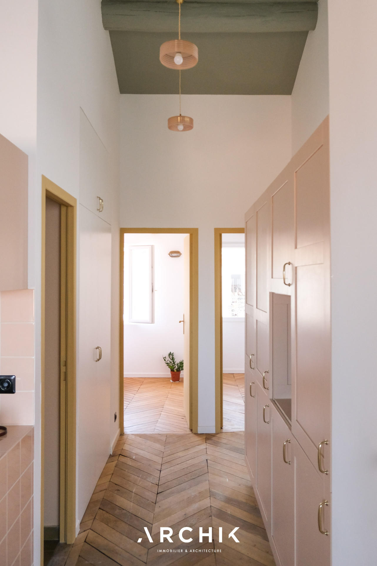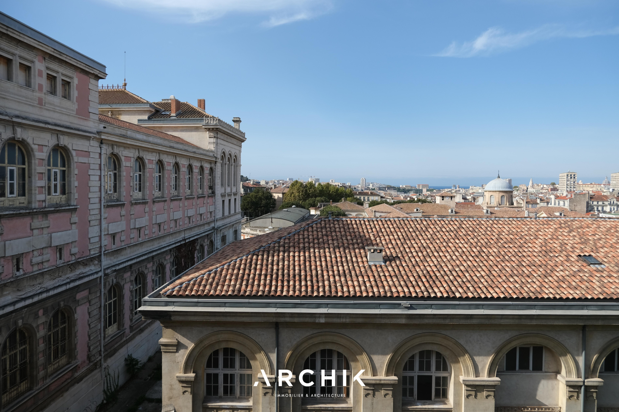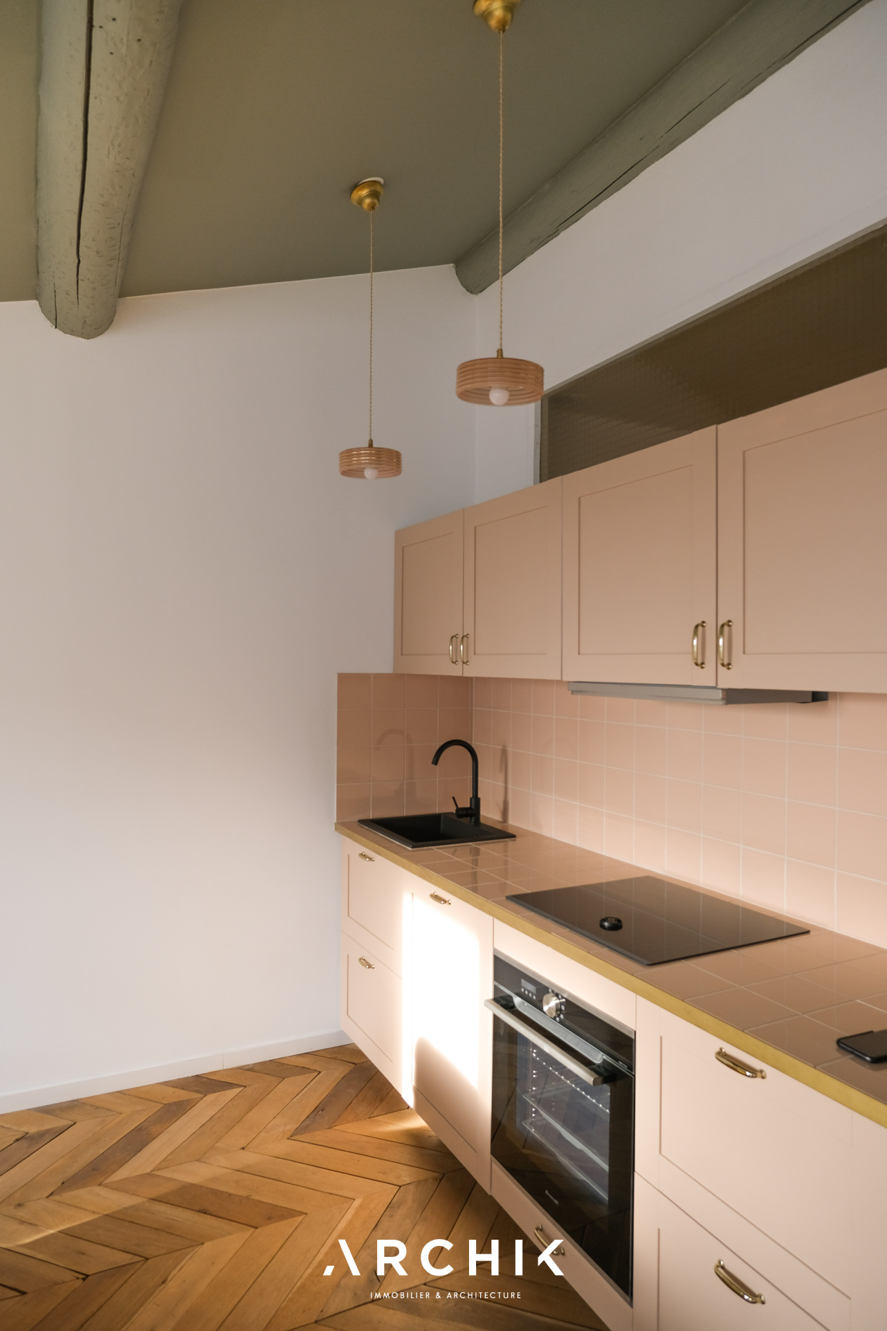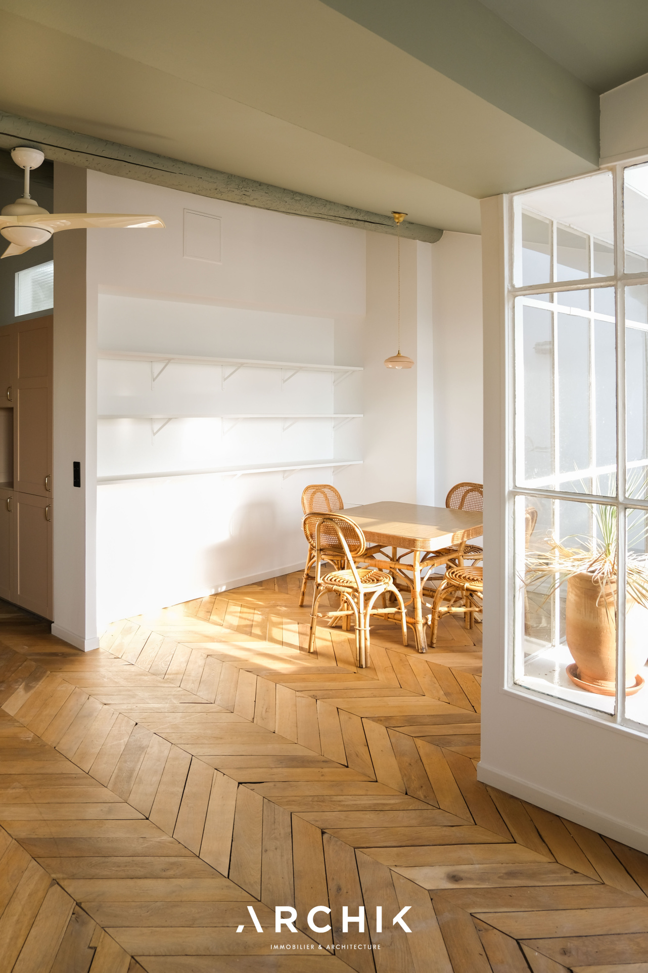 Entièrement restructuré par l'architecte d'intérieur Elodie Nectoux, l'appartement est singulier par son mélange de matériaux, son volume et l'harmonie de ses couleurs autour du rose et du vert olive, emblématique de la Provence. L'appartement se dévoile à l'Ouest par un grand séjour prolongé par une terrasse immaculée de 6 m2 qui se vit comme un patio avec ses verrières. La vue est imprenable sur les toits en tuile, la mer, les îles du Frioul au loin, le Clocher des Accoules, la Major, et la Vieille Charité. Dedans, le poêle à bois chiné en porcelaine fait apparaitre la belle hauteur sous plafond soulignée par le plafond peint. Le travail de la couleur est savamment décliné dans la cuisine avec un carrelage rose poudré souligné par du laiton brossé. L'appartement est entièrement vêtu d'un parquet en point de Hongrie, travaillé de façon brute et rappelant les ateliers d'artiste. Coté Est, deux généreuses chambres dotées de grands dressings offrent des vues dégagées. Au plafond, les poutres ont été peintes dans un jeu de jaune et de vert rappelant les couleurs du salon. La salle de bains reste harmonieusement dans les mêmes tonalités, sa douche à l'italienne s'habille d'une verrière au teintes fumées.