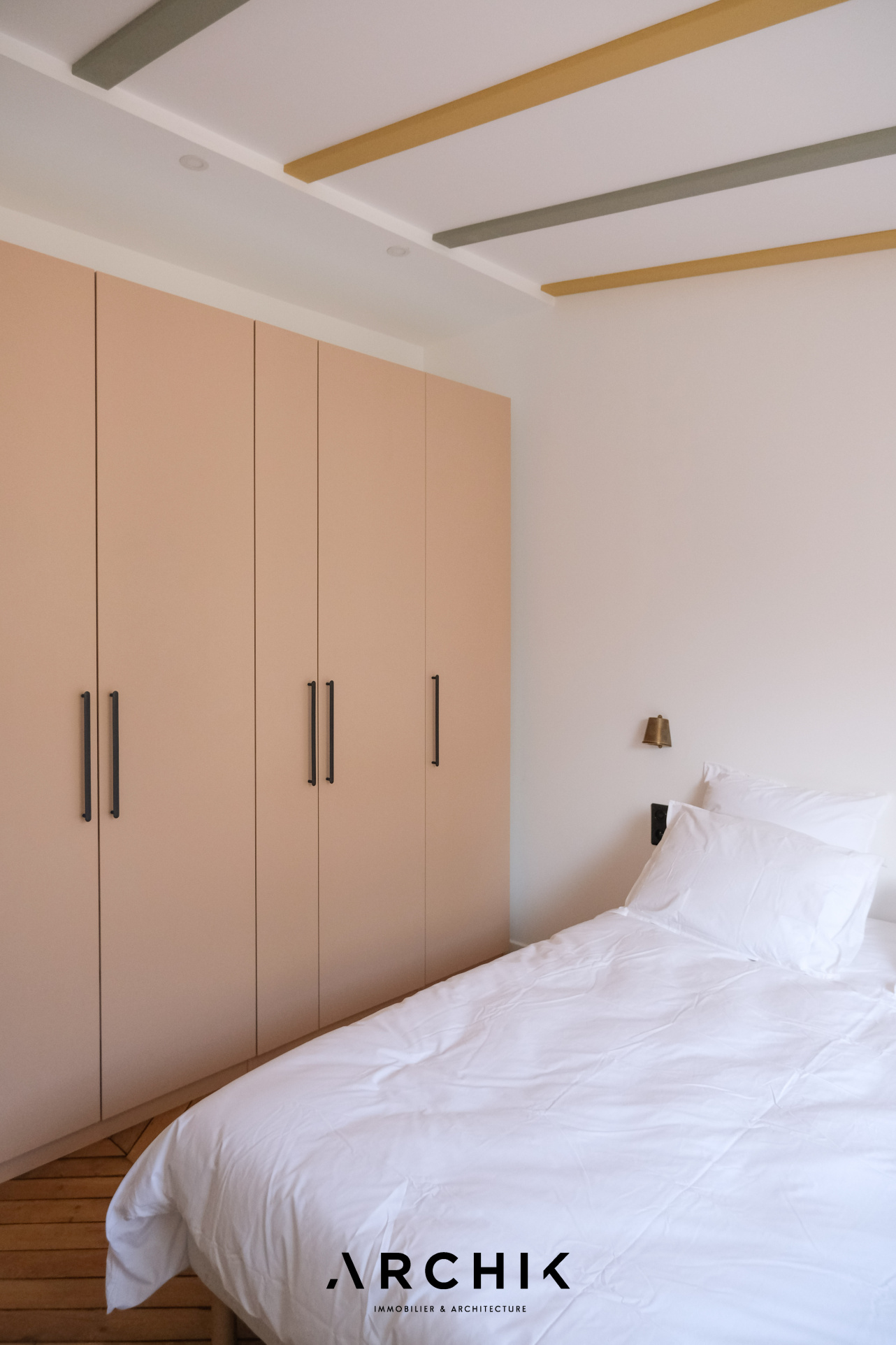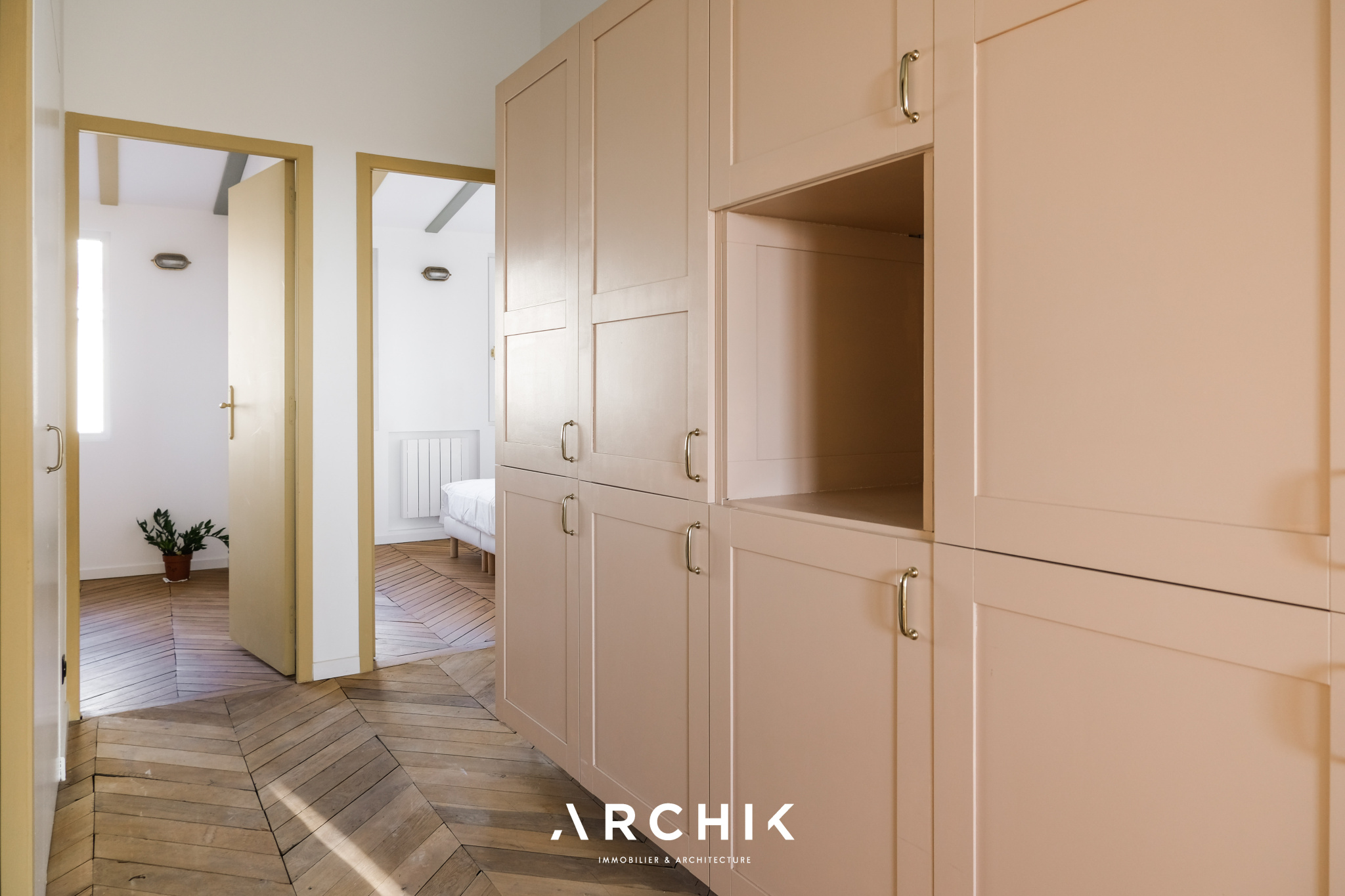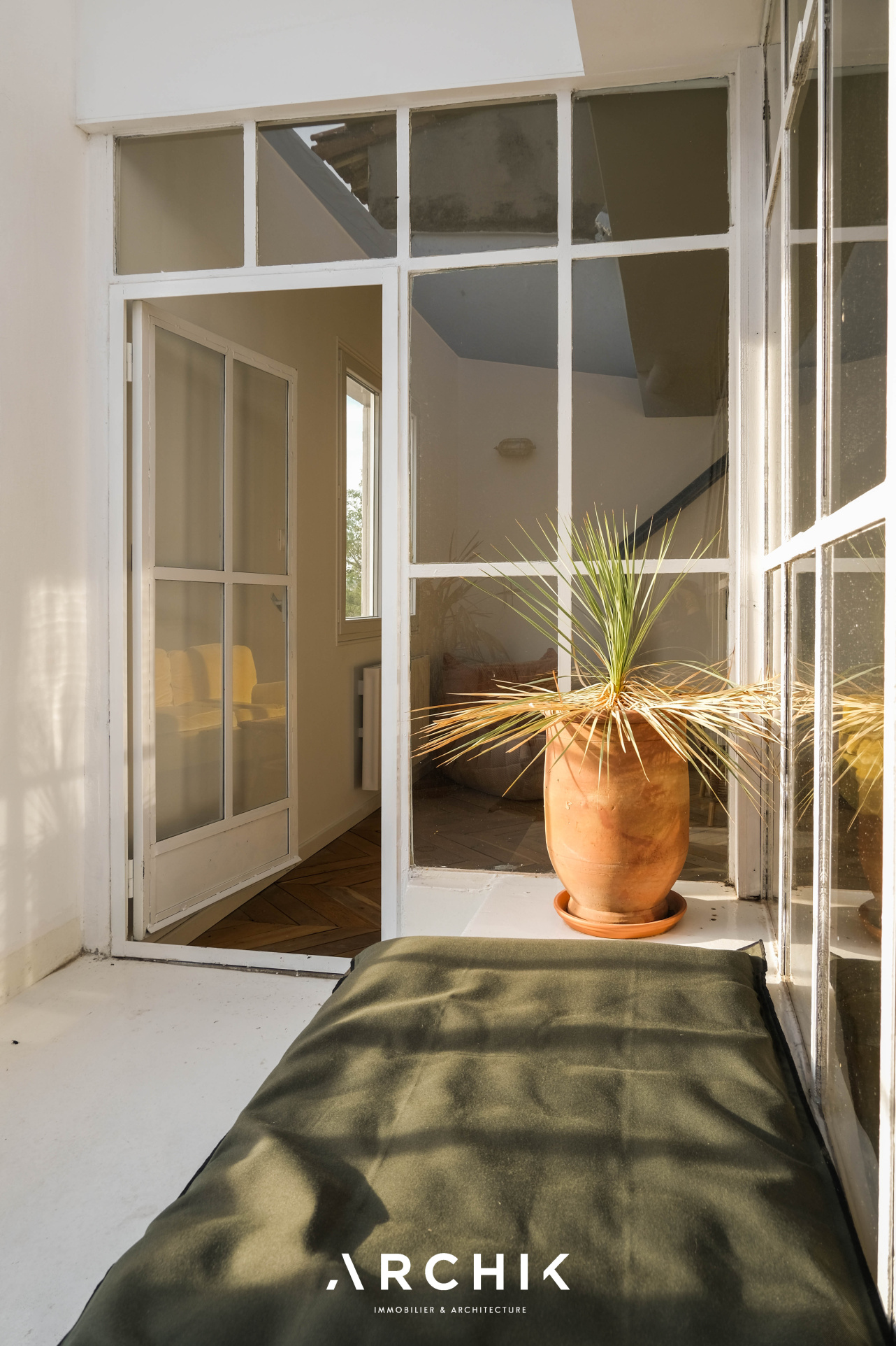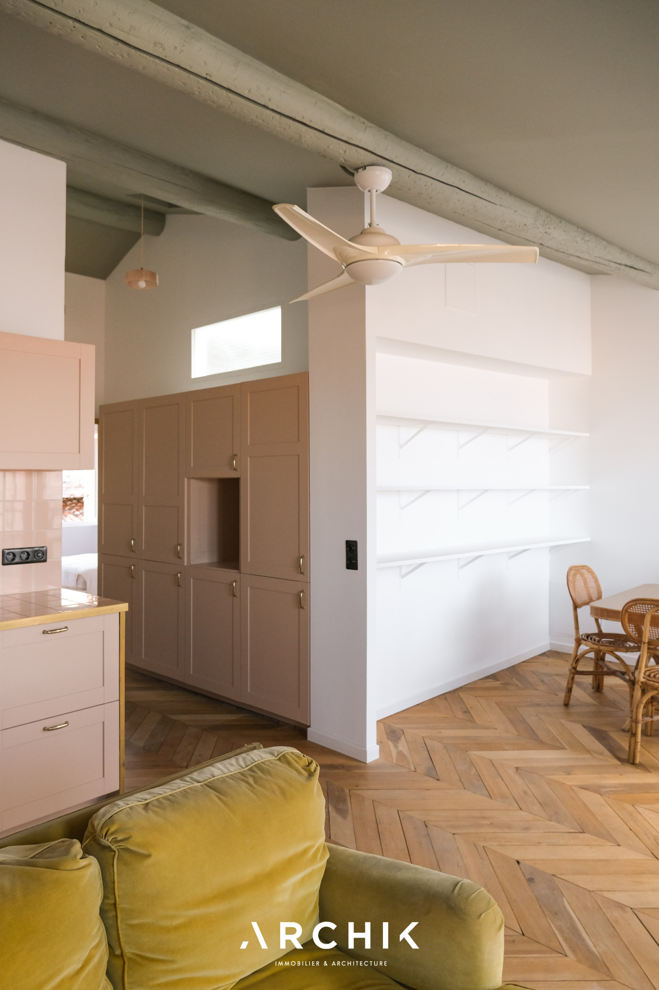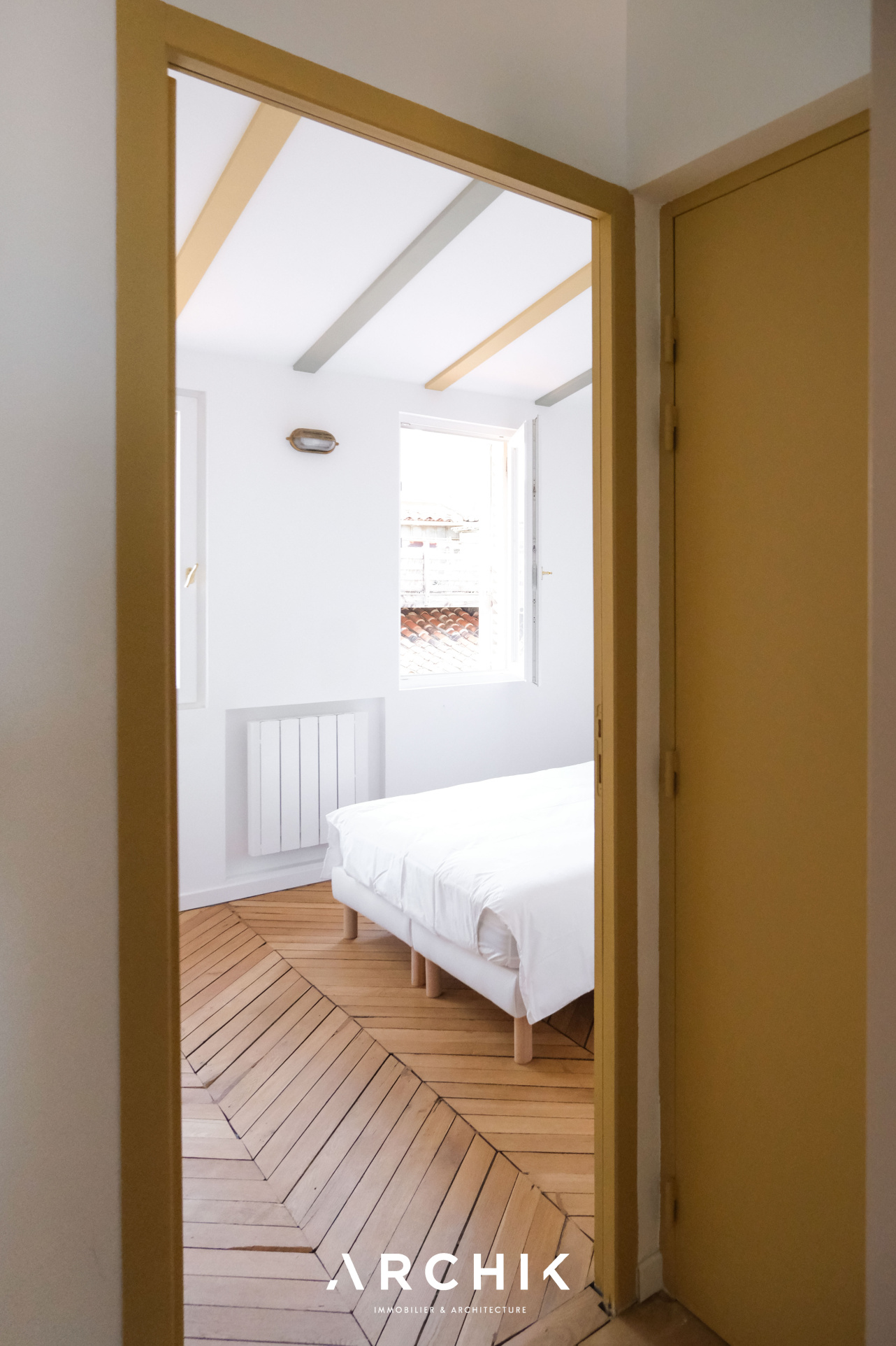 Entièrement restructuré par l'architecte d'intérieur Elodie Nectoux, l'appartement est singulier par son mélange de matériaux, son volume et l'harmonie de ses couleurs autour du rose et du vert olive, emblématique de la Provence. L'appartement se dévoile à l'Ouest par un grand séjour prolongé par une terrasse immaculée de 6 m2 qui se vit comme un patio avec ses verrières. La vue est imprenable sur les toits en tuile, la mer, les îles du Frioul au loin, le Clocher des Accoules, la Major, et la Vieille Charité. Dedans, le poêle à bois chiné en porcelaine fait apparaitre la belle hauteur sous plafond soulignée par le plafond peint. Le travail de la couleur est savamment décliné dans la cuisine avec un carrelage rose poudré souligné par du laiton brossé. L'appartement est entièrement vêtu d'un parquet en point de Hongrie, travaillé de façon brute et rappelant les ateliers d'artiste. Coté Est, deux généreuses chambres dotées de grands dressings offrent des vues dégagées. Au plafond, les poutres ont été peintes dans un jeu de jaune et de vert rappelant les couleurs du salon. La salle de bains reste harmonieusement dans les mêmes tonalités, sa douche à l'italienne s'habille d'une verrière au teintes fumées.