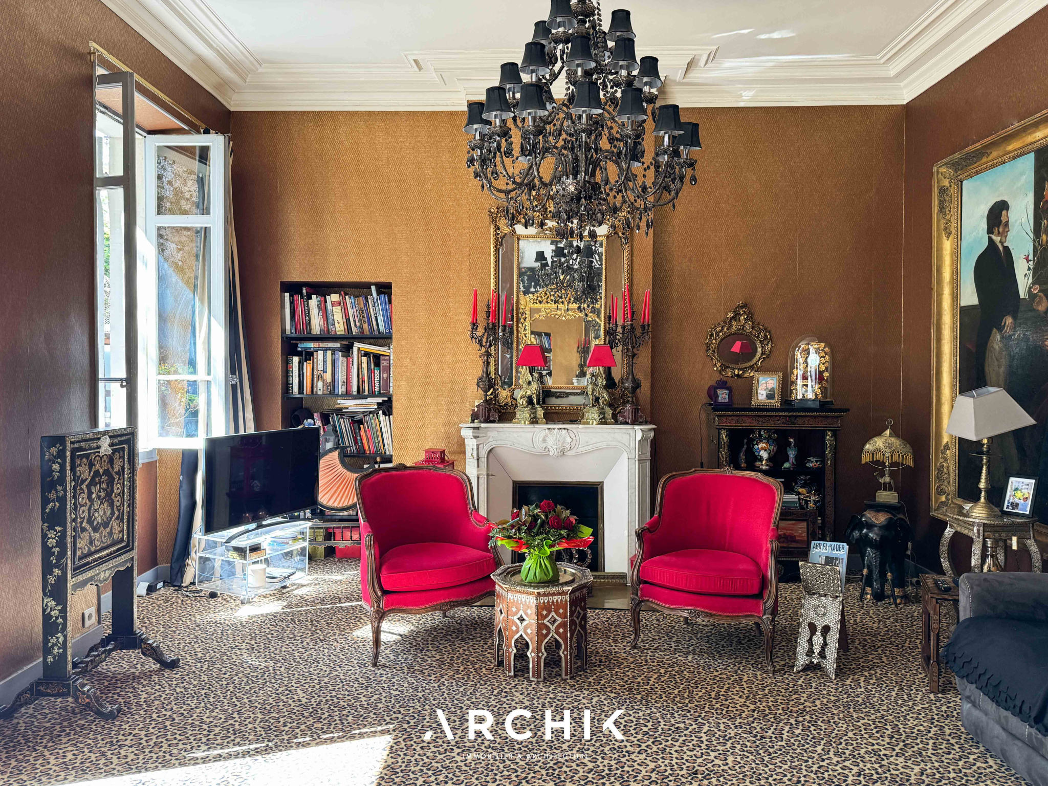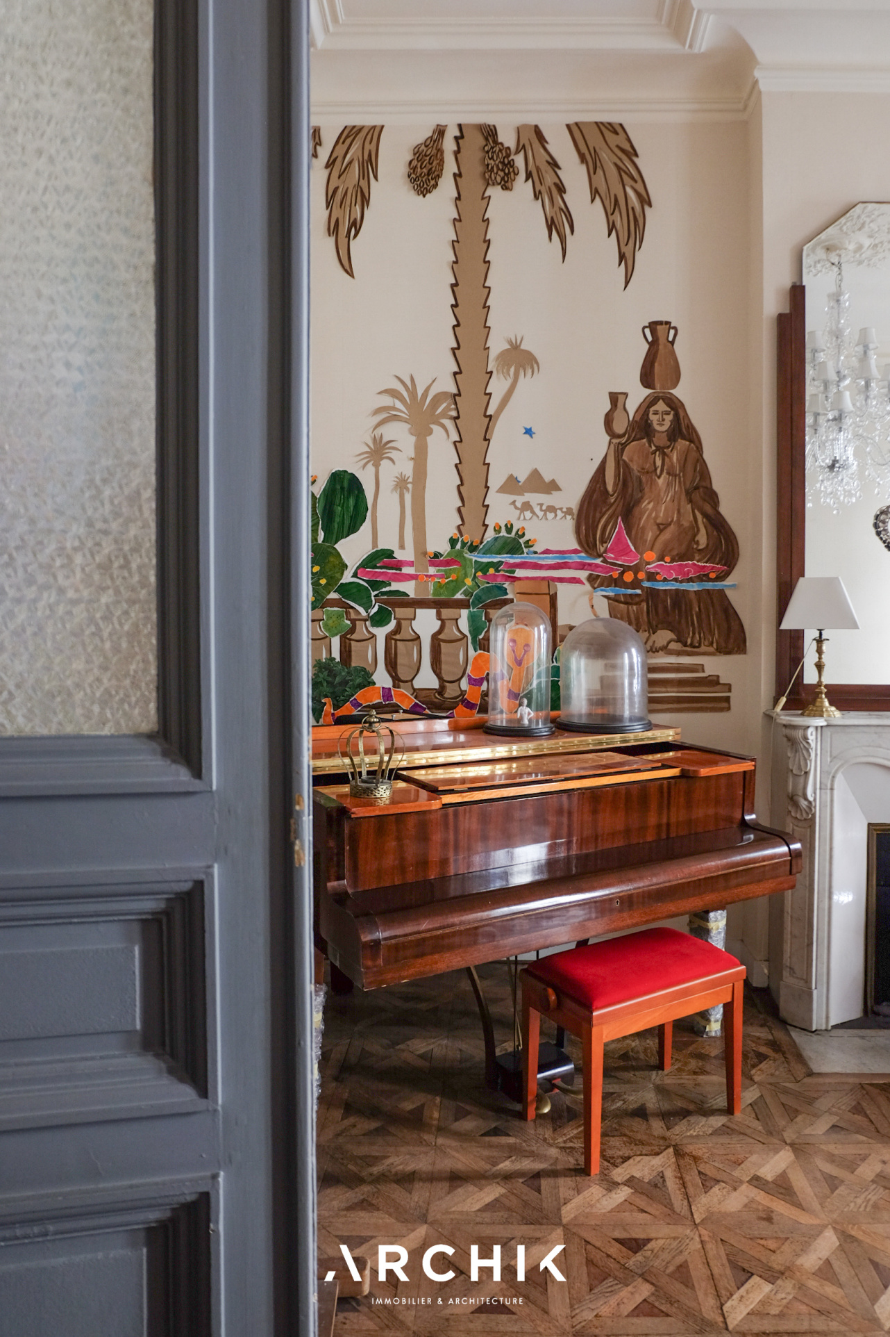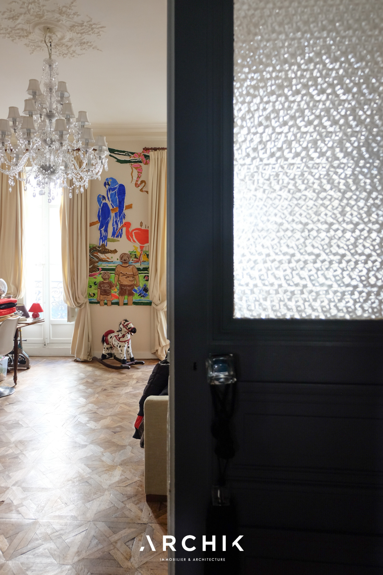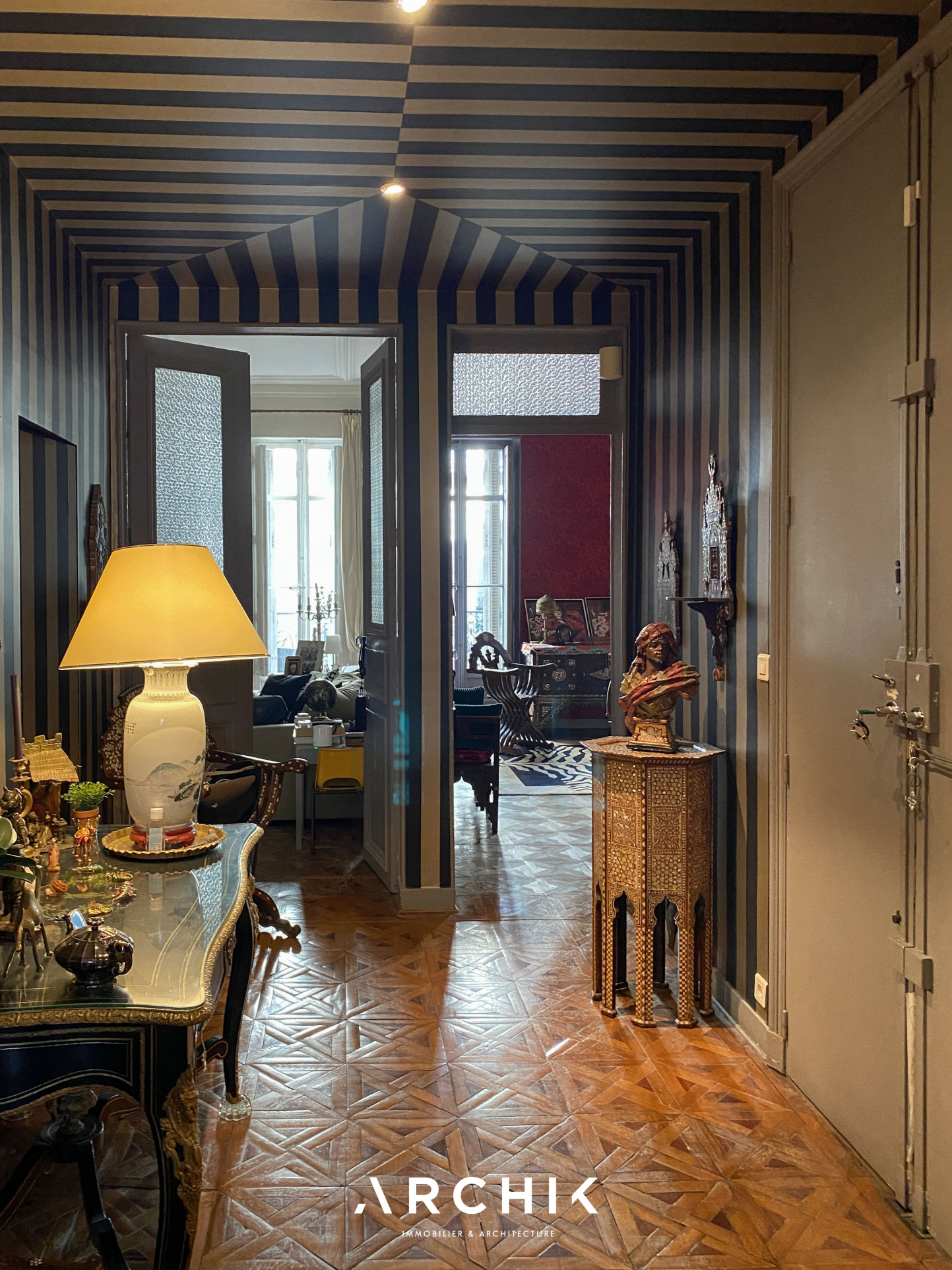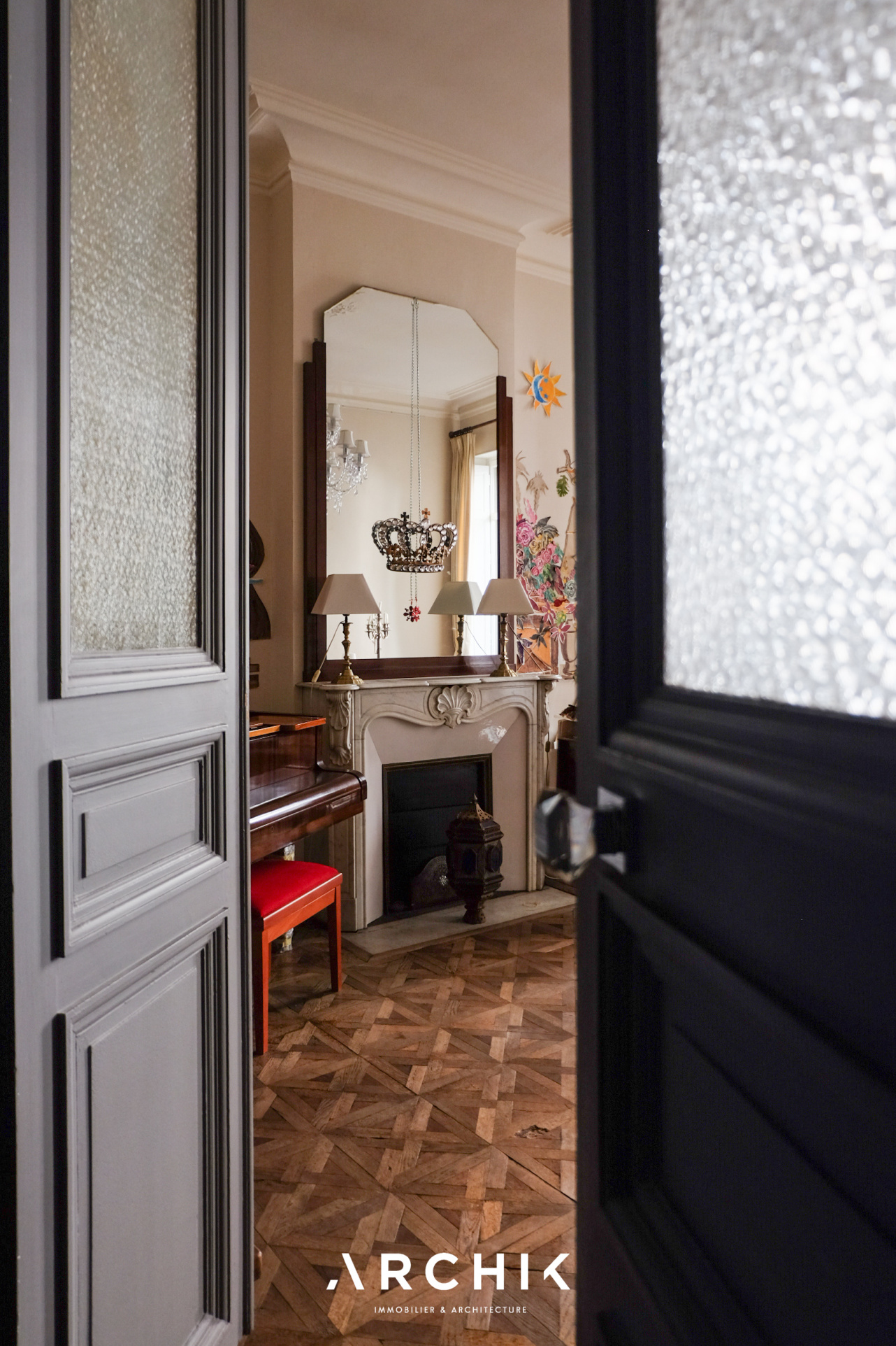 Signée de l'architecte Alain AGAZAR en 2011, la rénovation au parti pris marqué est une oeuvre complète, où le moindre détail a été pensé, créant un intérieur à la personnalité forte. Les éléments d'origine comme les cheminées en marbre, les volets intérieurs en bois, les portes et les moulures ont été révélés, et sont superbement accompagnés par un parquet massif à motif issu du musée Grobet-Labadié.
