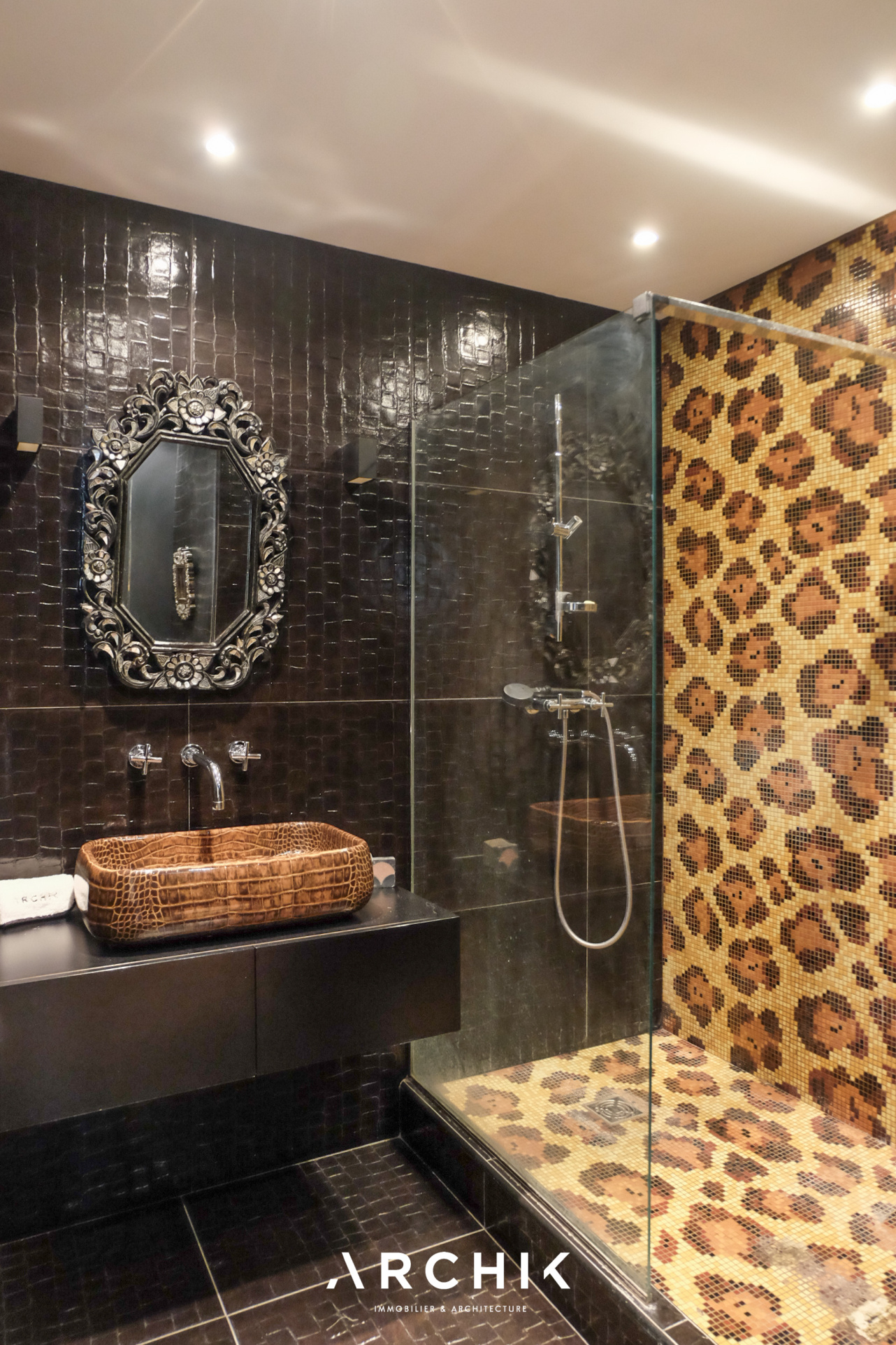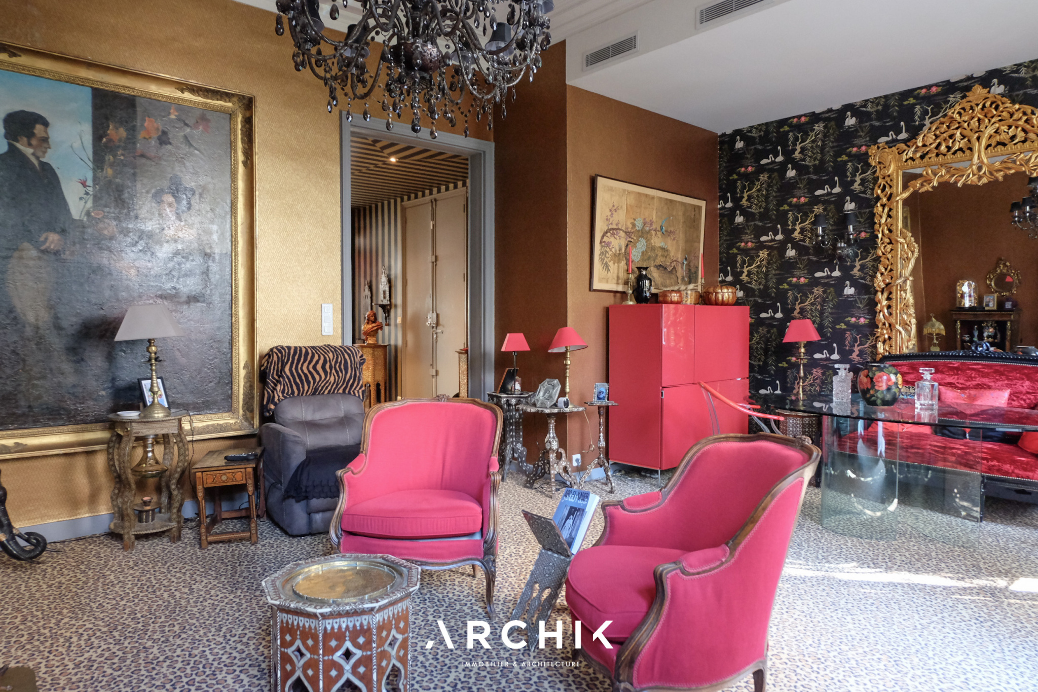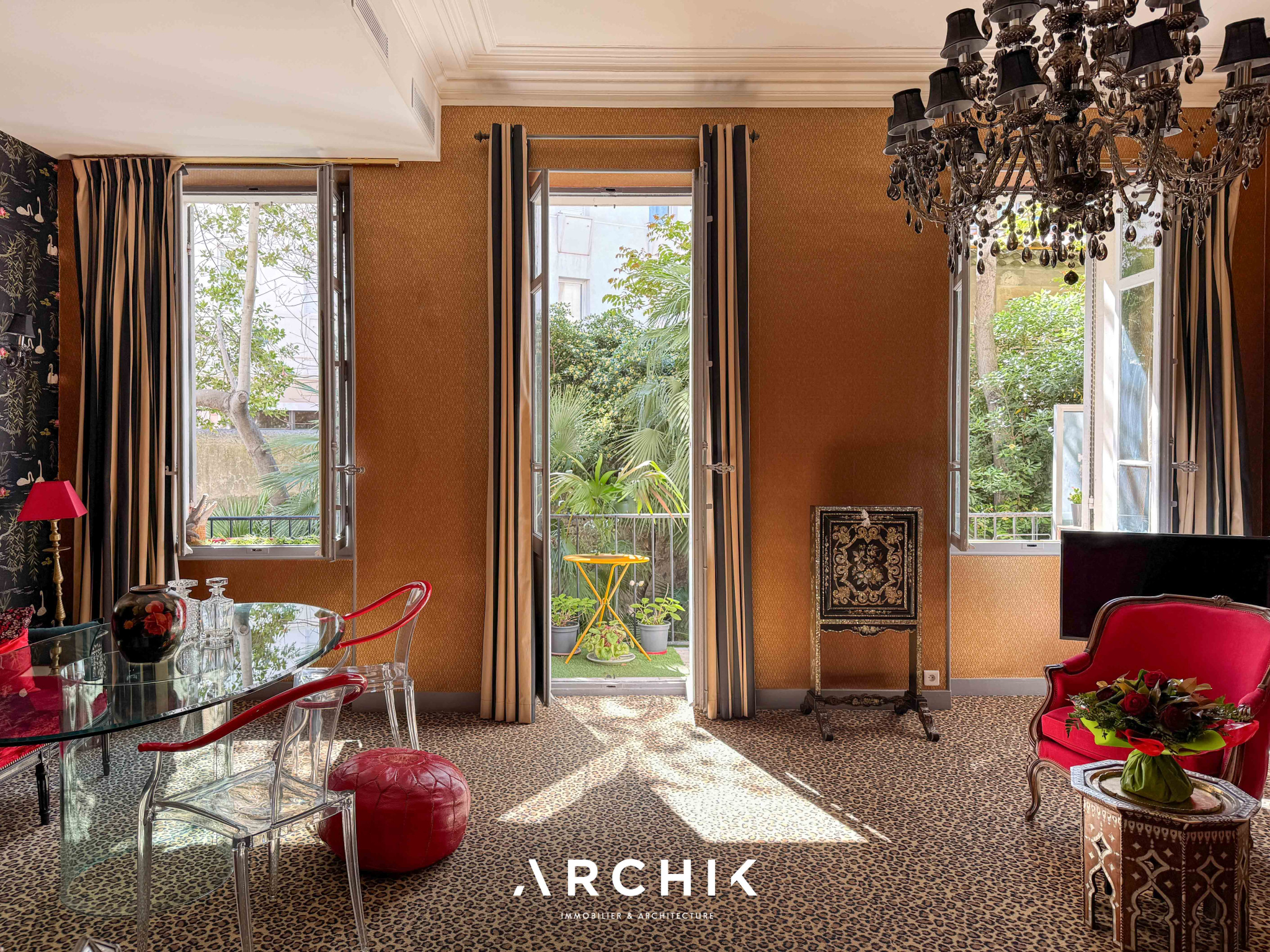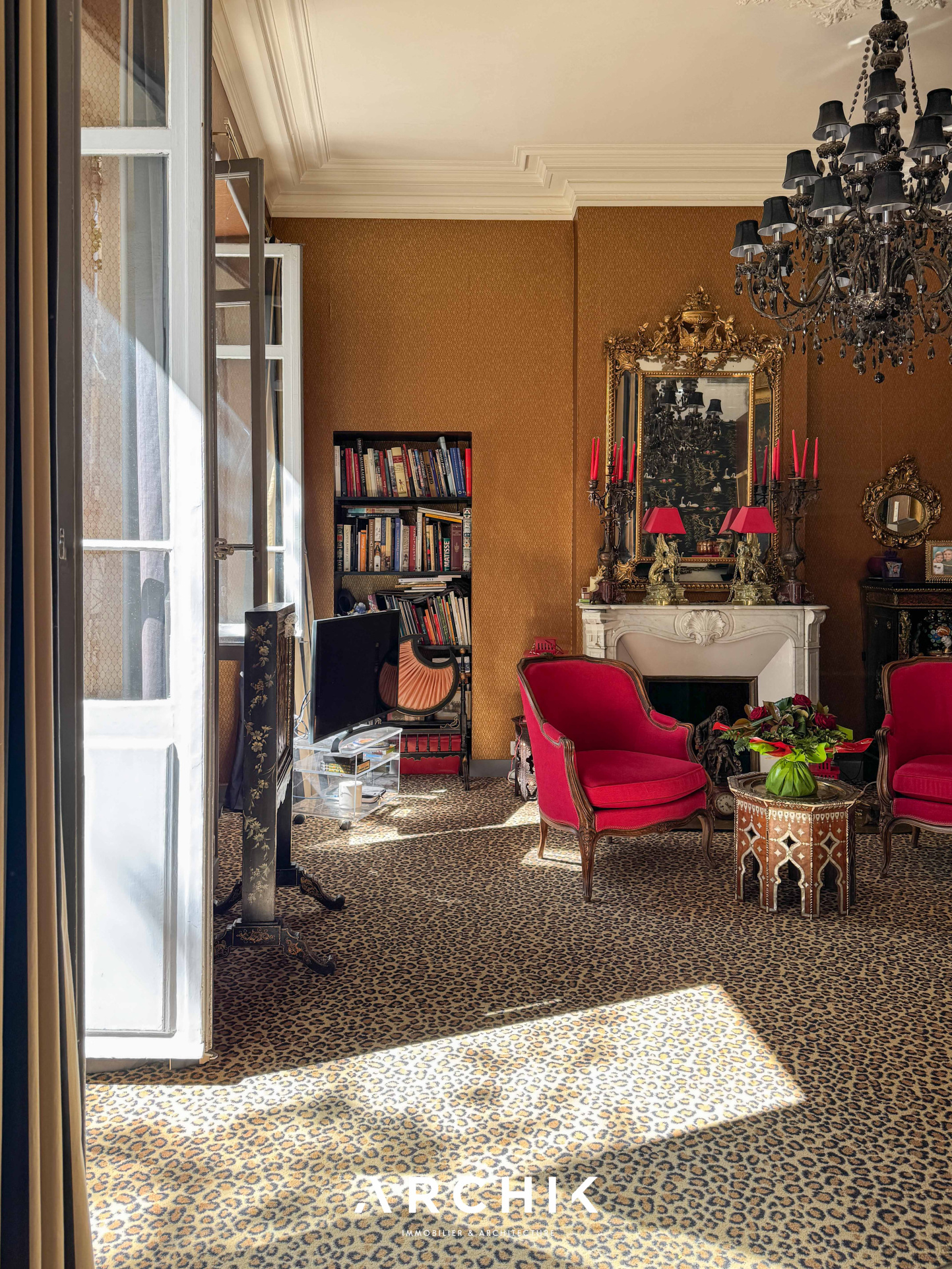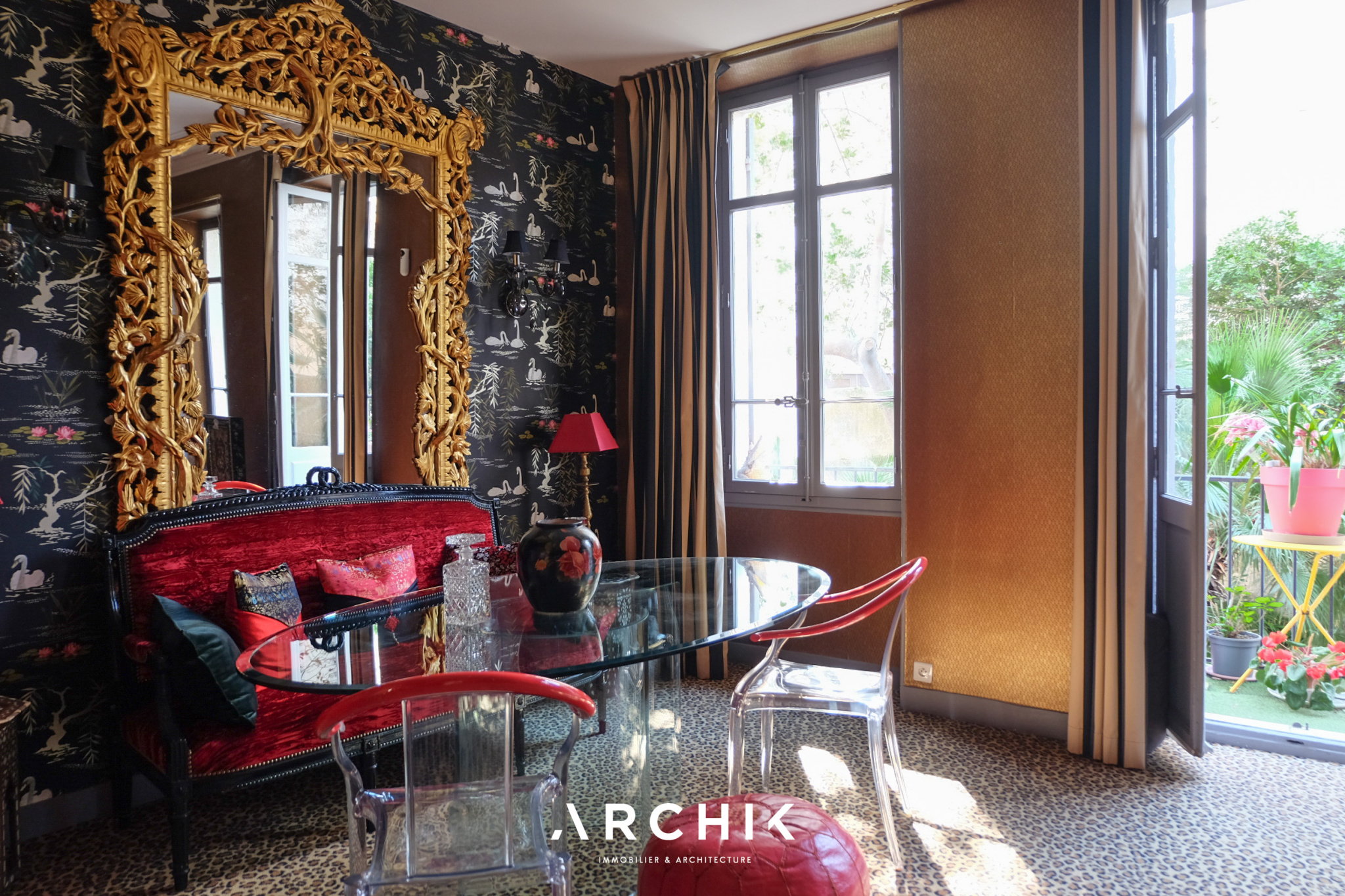 Traversant, l'appartement ponctué d'oeuvres d'art grand format surprend dès l'entrée avec son papier peint aux allures de tente berbère. La pièce de vie, bien que baignée par la lumière de l'Ouest, offre une atmosphère feutrée par ses papiers peints et sa moquette léopard. Elle ouvre sur un balcon filant par une porte fenêtre offrant une vue sur les jardins alentours. La cuisine séparée à la crédence en verre ouvre également sur le balcon.