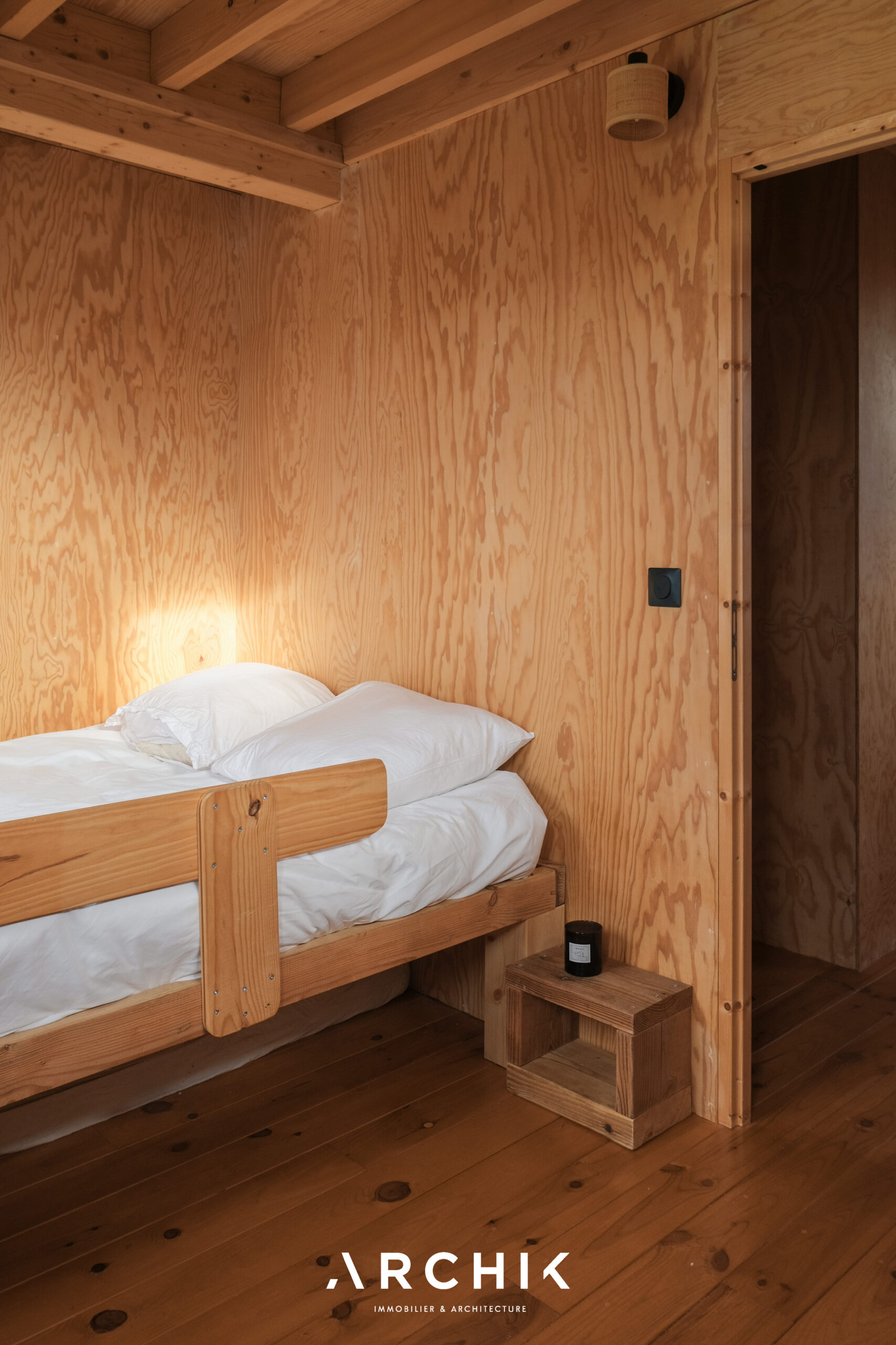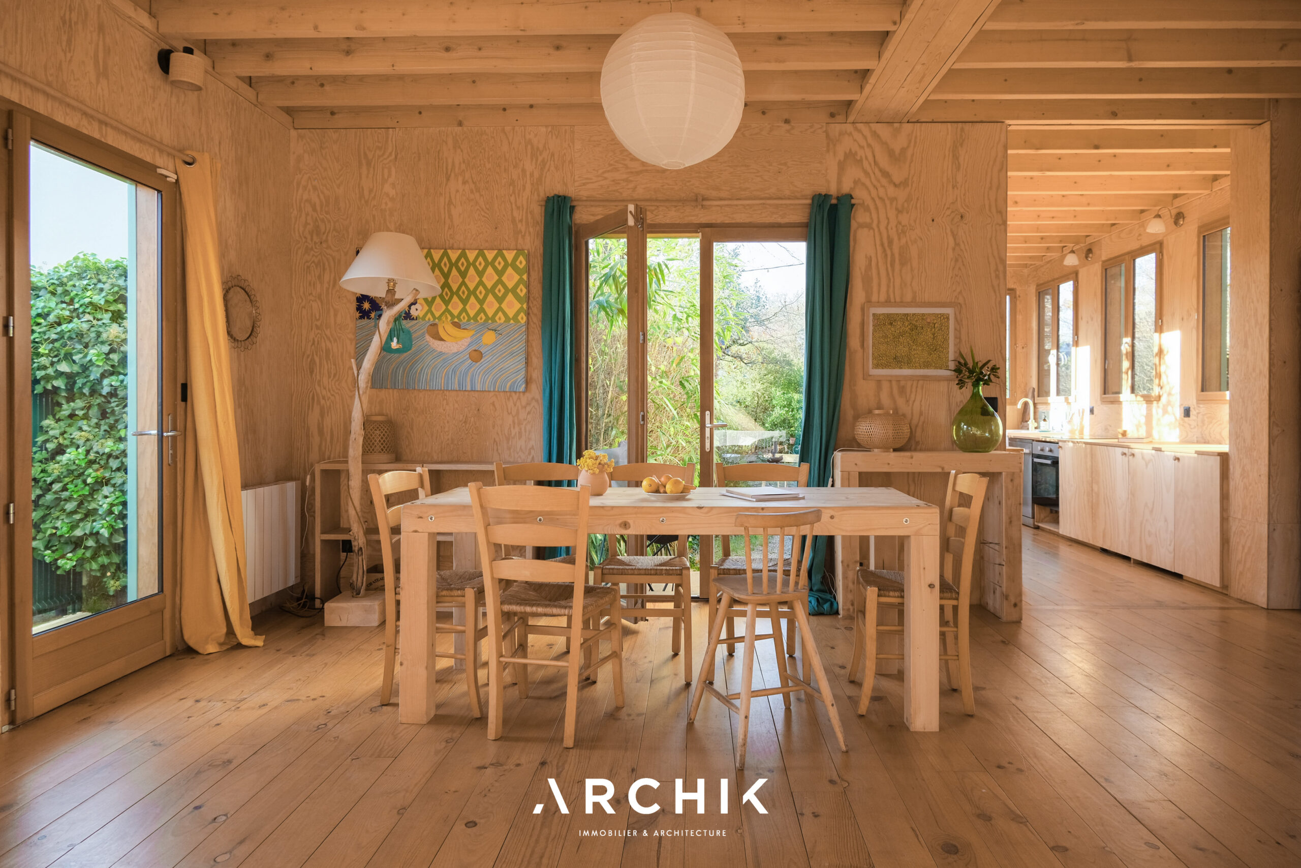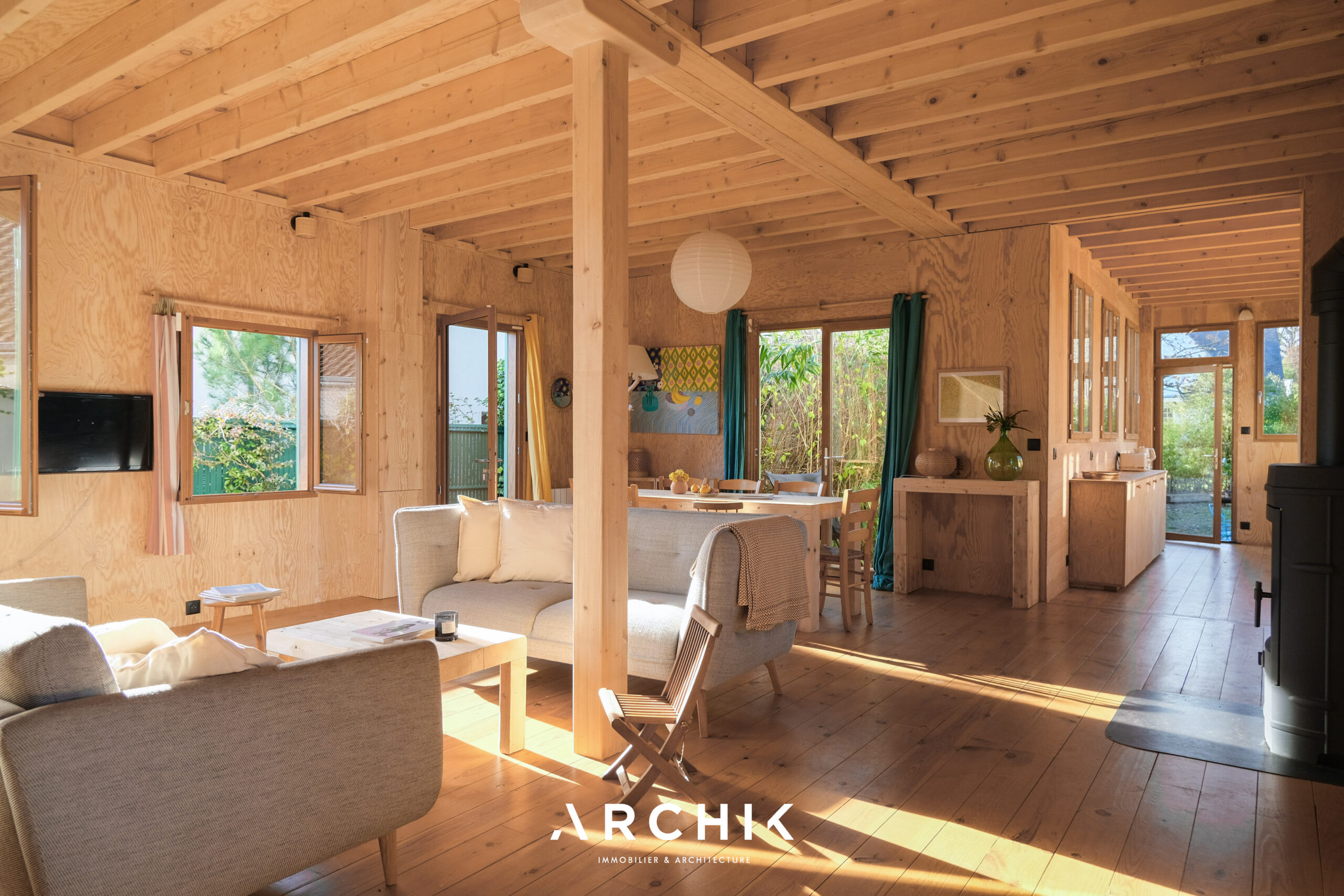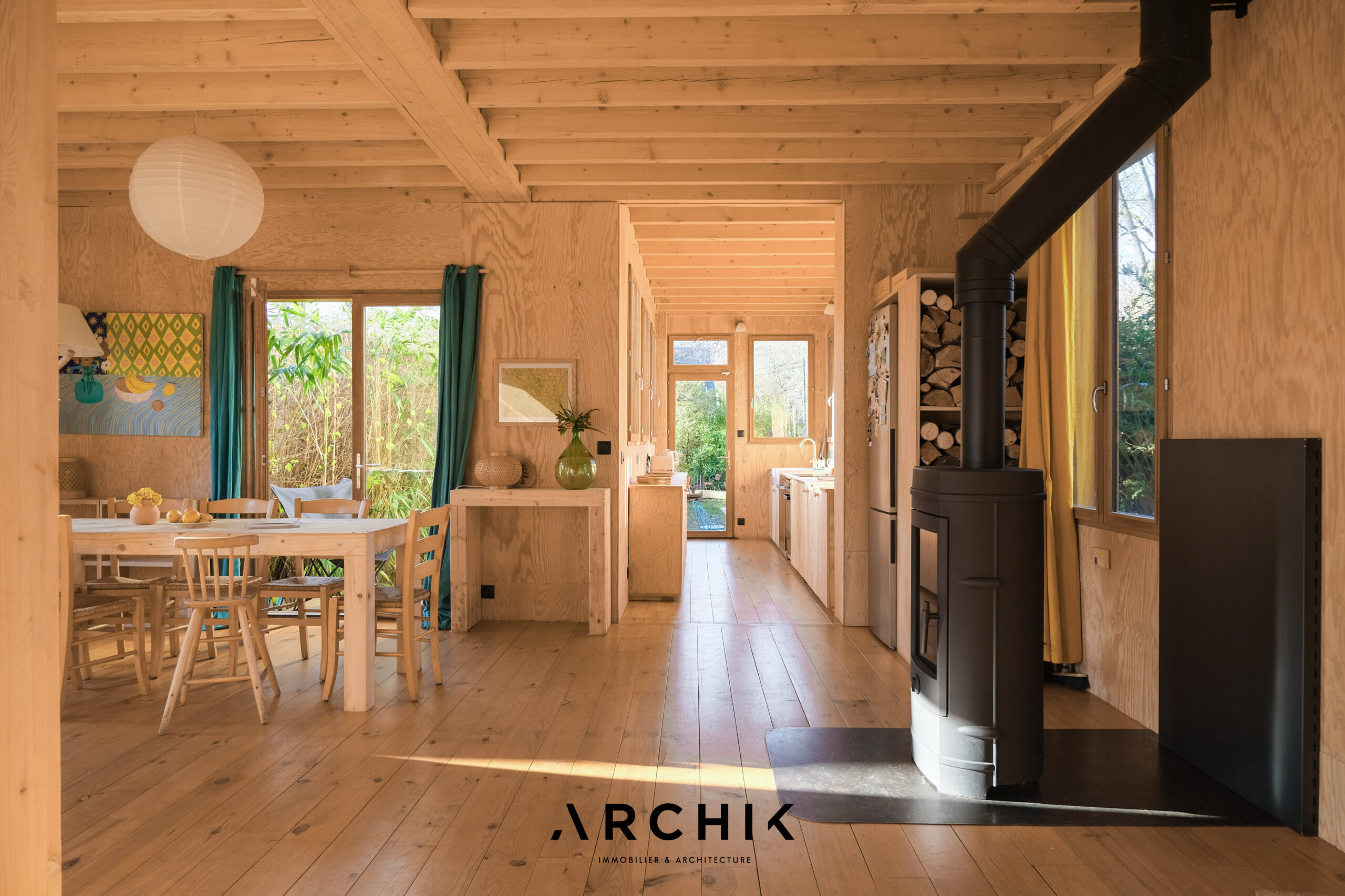 Dès l'entrée, l'espace de vie chaleureux se dévoile, avec sa lumière omniprésente mettant en valeur les éléments choisis de cet espace aux volumes confortables et enveloppants à la fois : plancher en madriers de pin scandinaves, parements en pin maritime, poêle à bois ... autant d'éléments architecturaux parfaits été comme hiver.