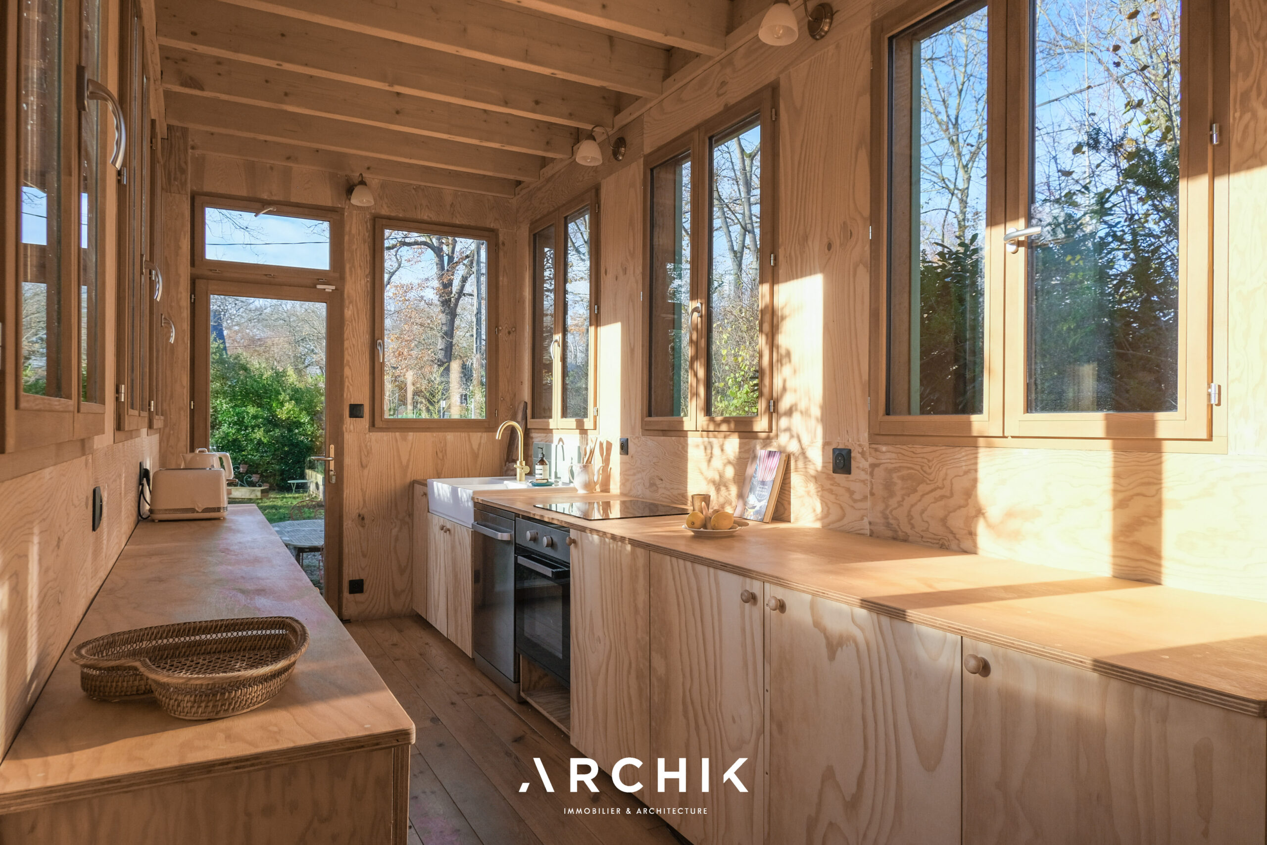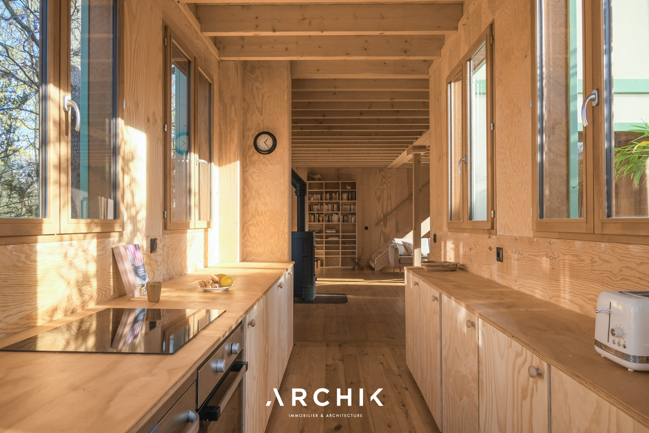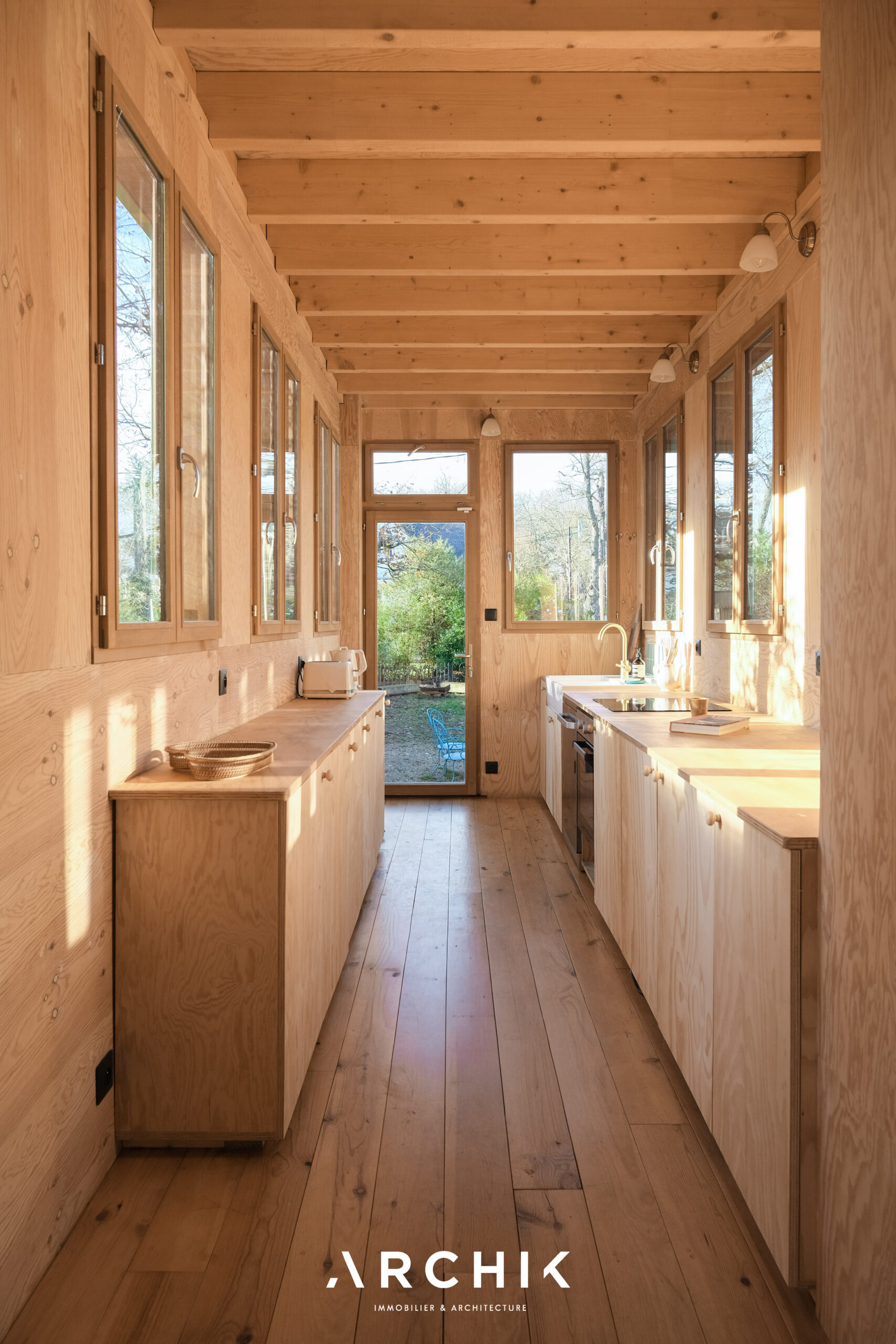 Baignée de lumière d'Est en Ouest grâce à ses nombreuses fenêtres, la cuisine, non sans rappeler les codes des chalets scandinaves, vient prolonger cet espace avec brio.