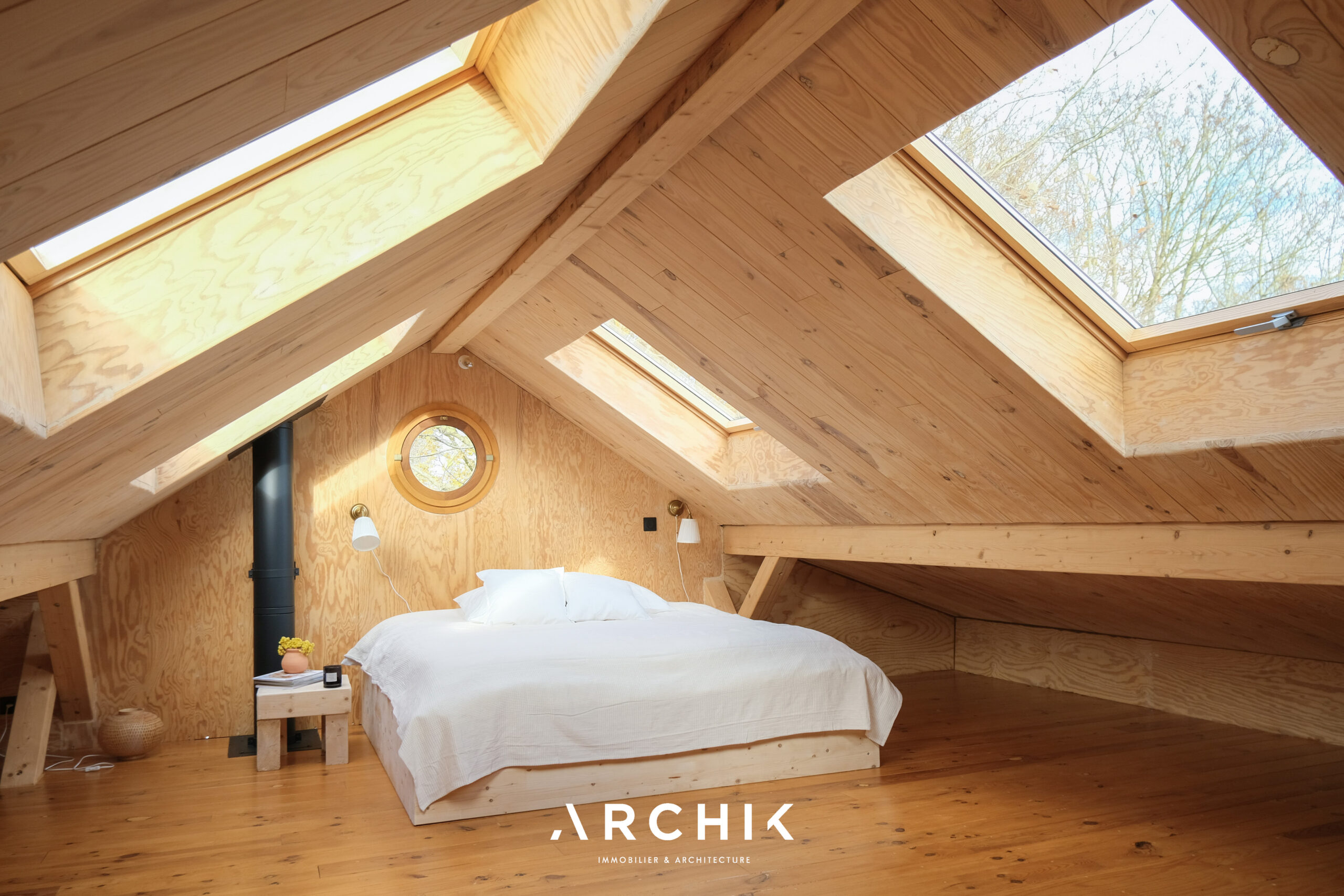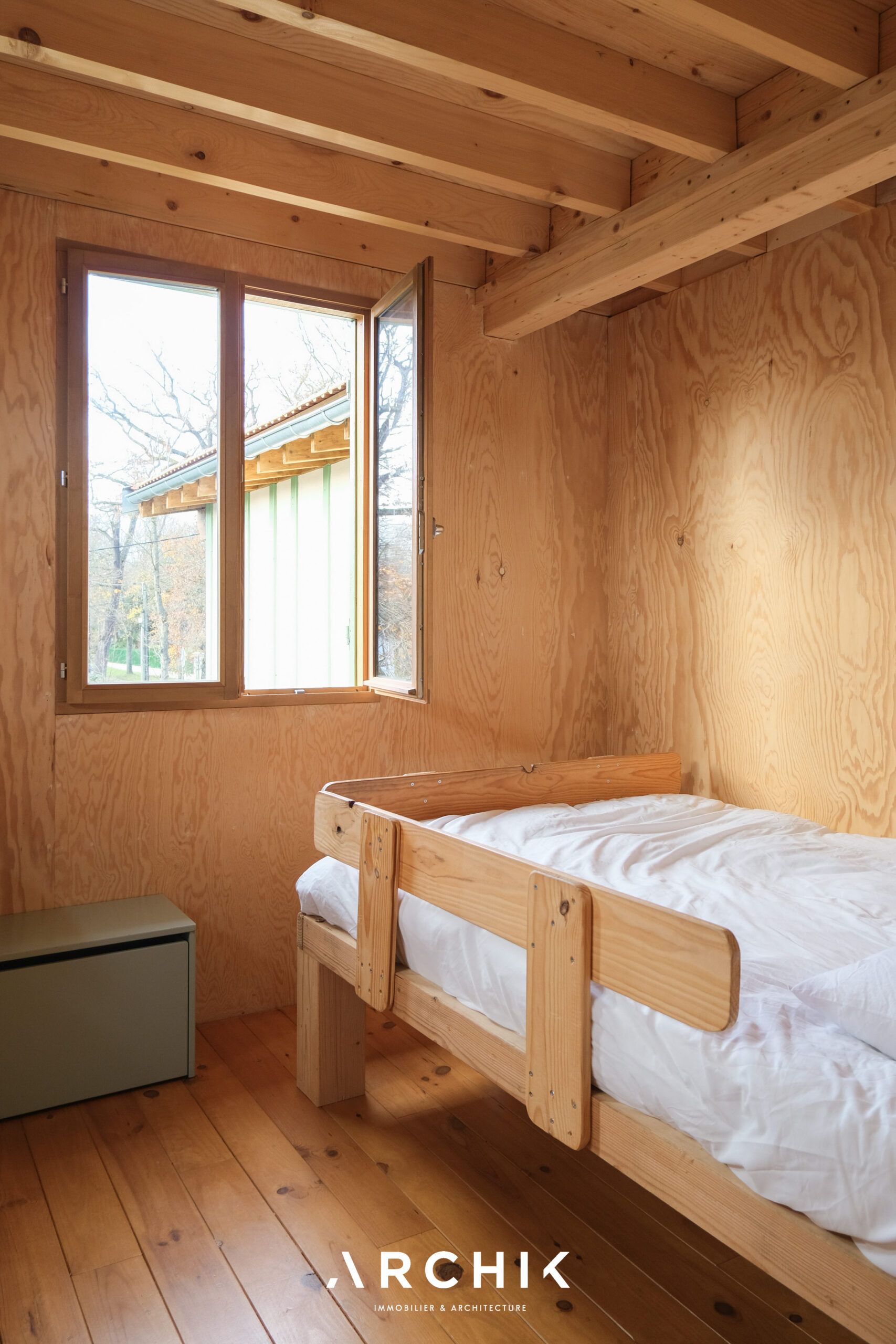 A l'étage, se dévoile les espaces nuits avec trois chambres tournées vers la nature environnante ainsi qu'un espace polyvalent de 37 m2 sous les combles pouvant prendre tant l'apparat d'un dortoir, d'une chambre parentale, d'une salle de jeu ou d'une chambre d'amis sous les toits. Une salle d'eau à la simplicité délicate permet de ne pas faire d'ombre à la canopée se dévoilant au travers de sa fenêtre.