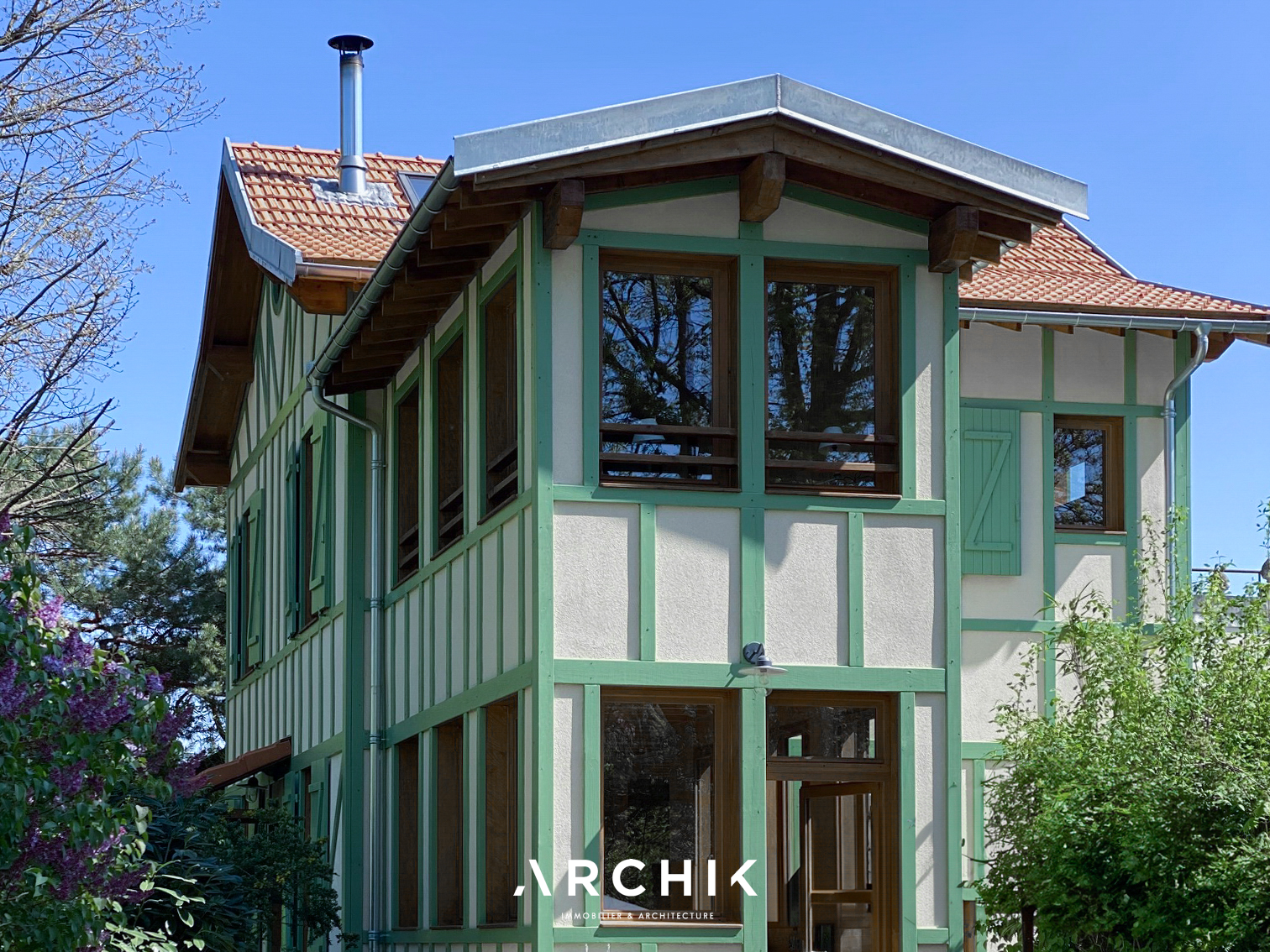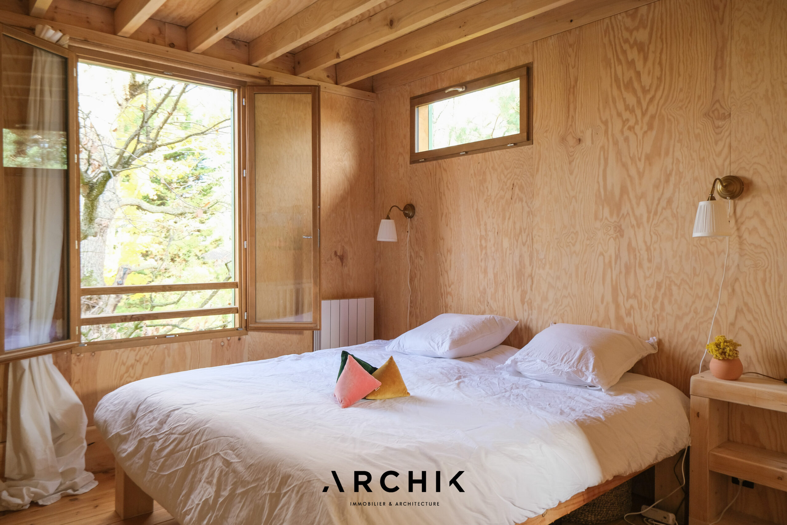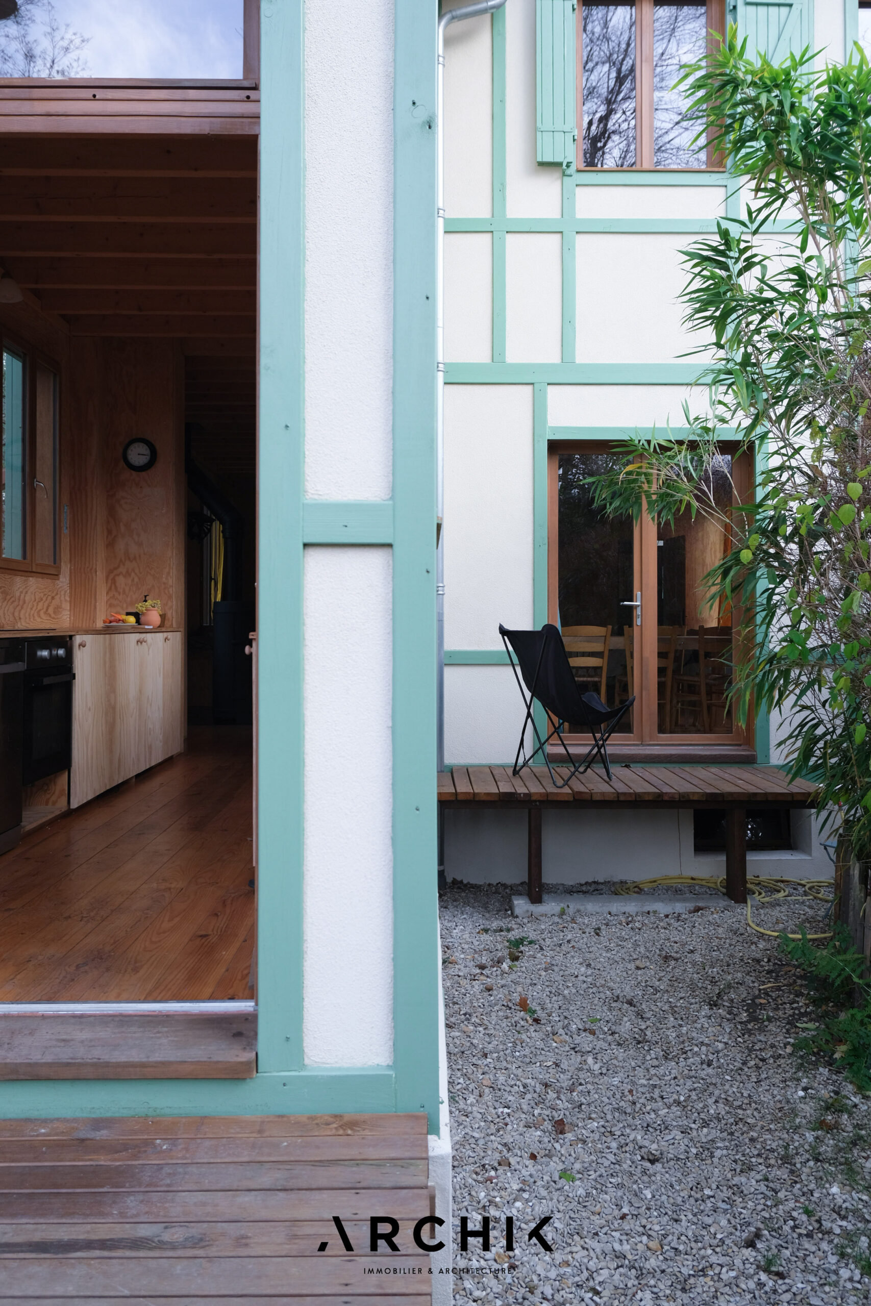 Fruit de la collaboration entre l'architecte Thomas Gauvrit et les actuels propriétaires la maison se niche sur un terrain arboré de 518 m2, au milieu des chênes, en dialogue permanent avec le paysage. La maison célébrant le bois et ses multiples usages vient se fondre dans l'environnement boisé alentour.