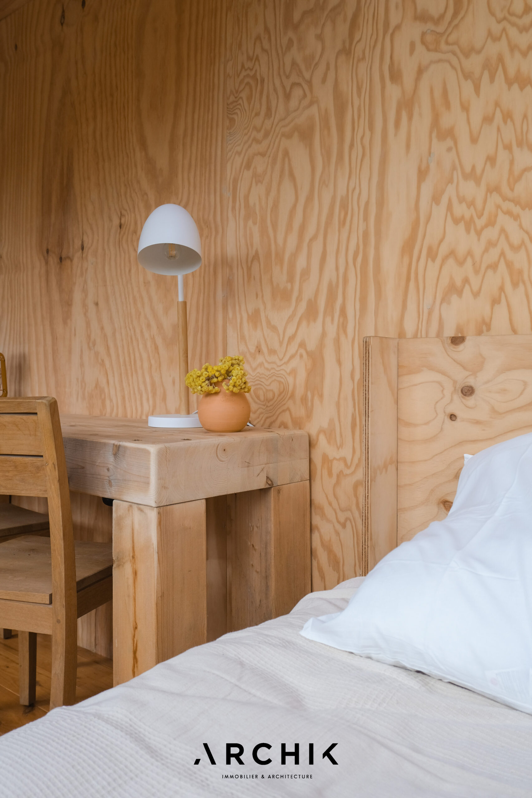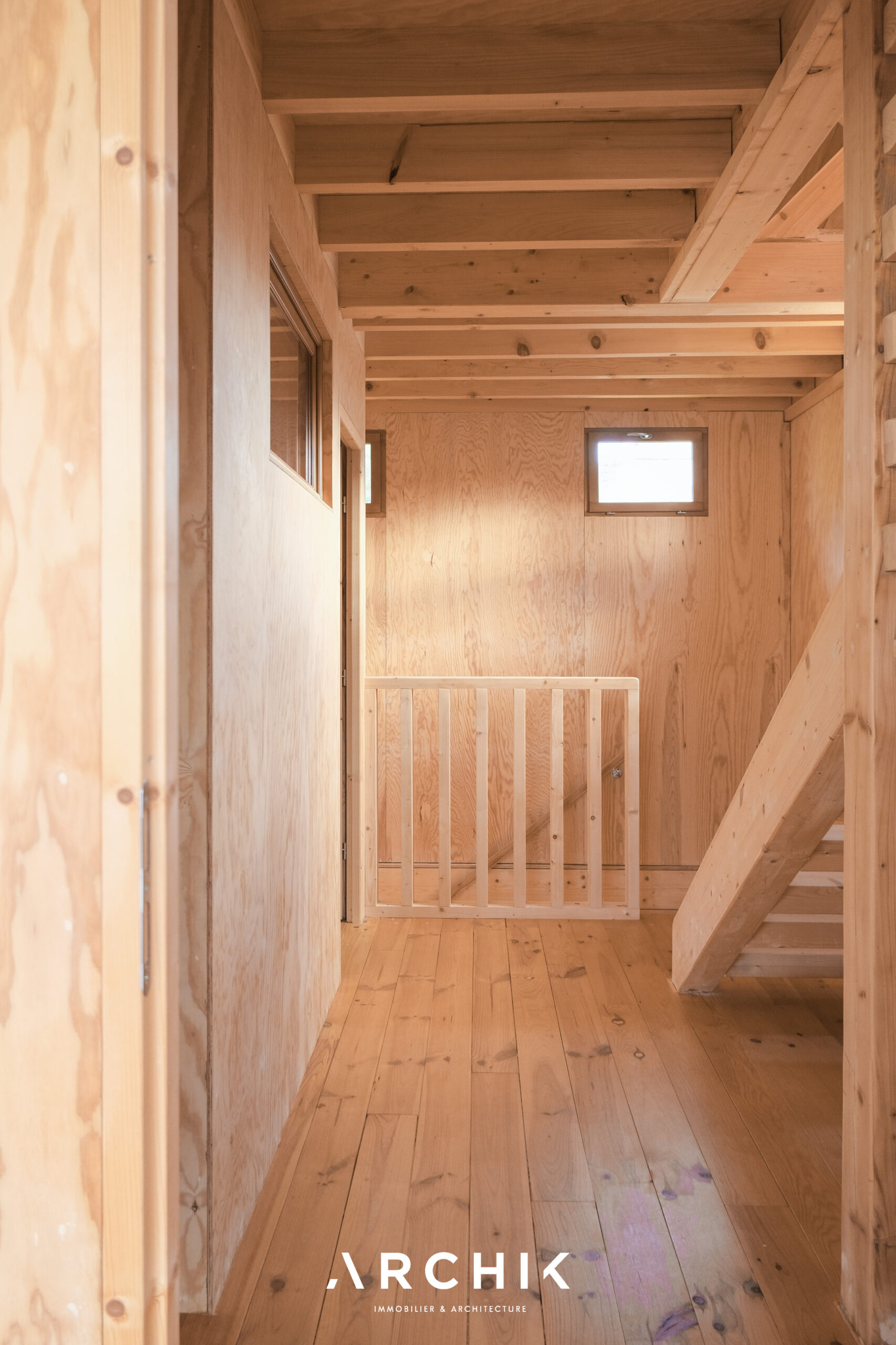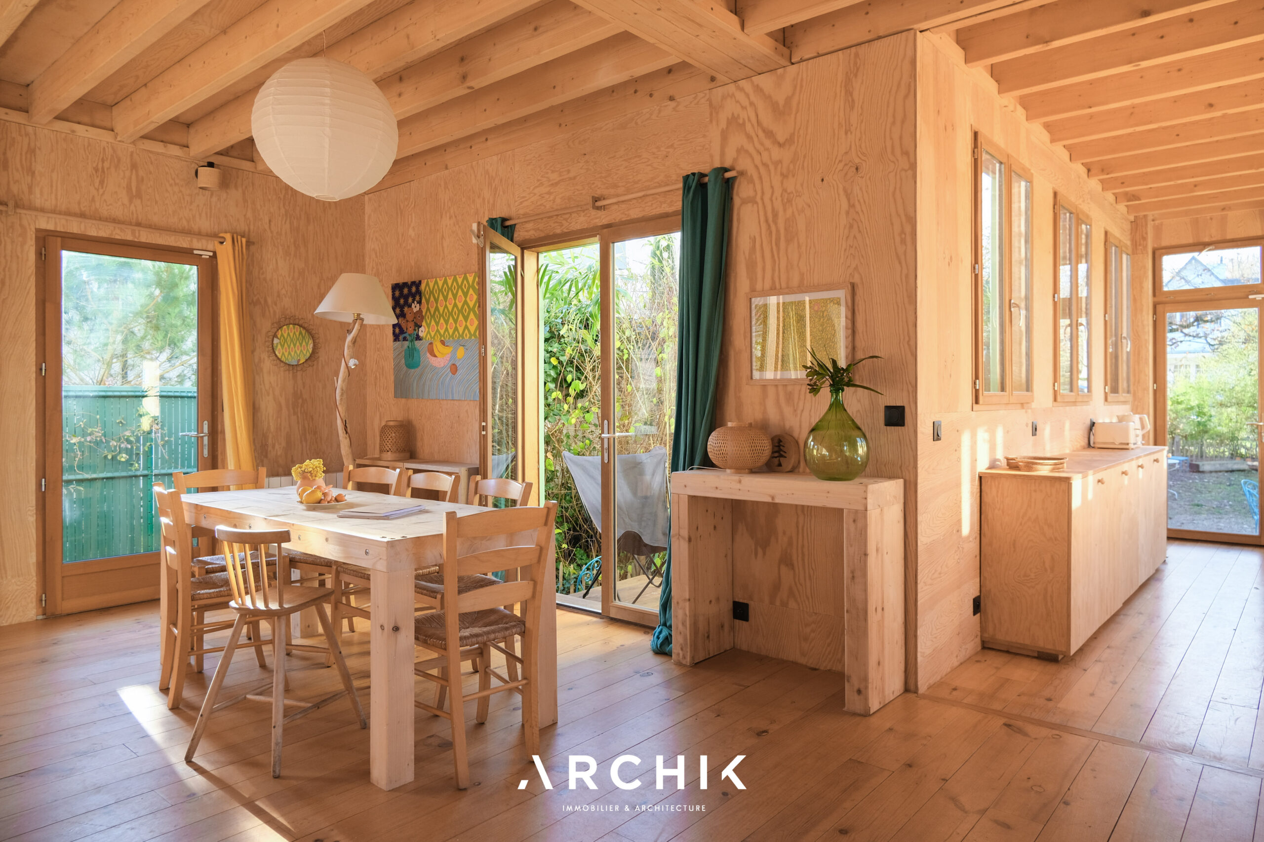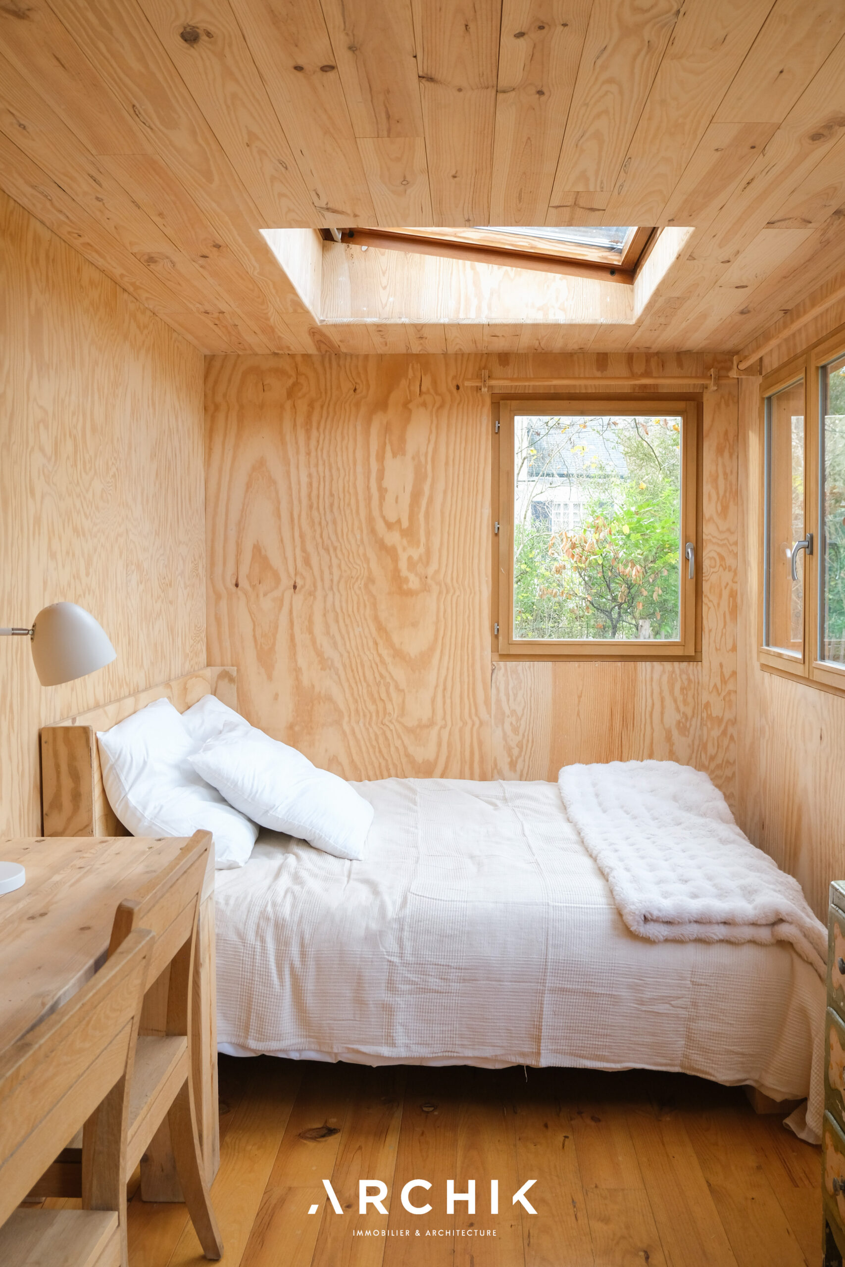Fruit de la collaboration entre l'architecte Thomas Gauvrit et les actuels propriétaires la maison se niche sur un terrain arboré de 518 m2, au milieu des chênes, en dialogue permanent avec le paysage. La maison célébrant le bois et ses multiples usages vient se fondre dans l'environnement boisé alentour.