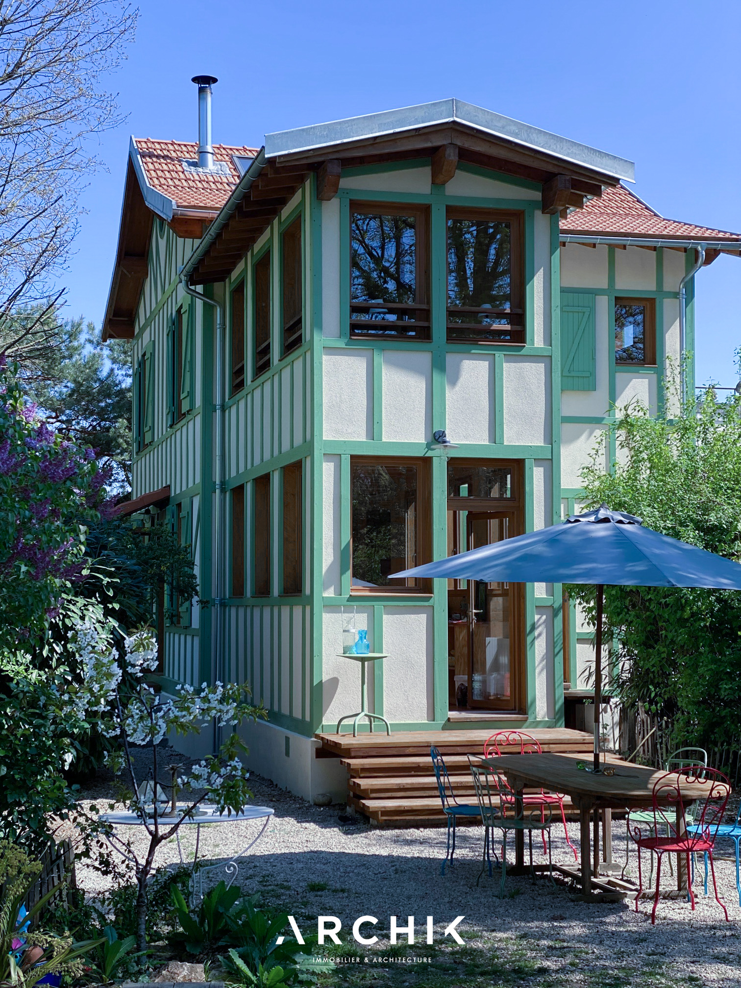 Architecture d'inspiration anglo-normande revisitée, cette maison de 191 m2 habitables en ossature bois et en plein coeur du parc de Maisons-Laffite se distingue par son ambiance chaleureuse, durable tout en respectant l'âme architecturale de la 'Cité du Cheval ».