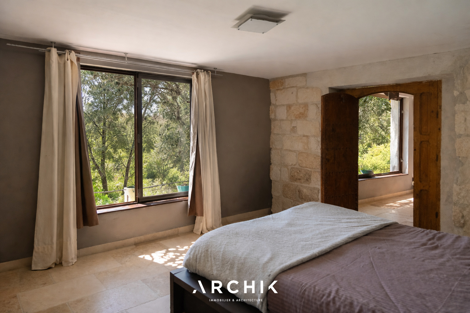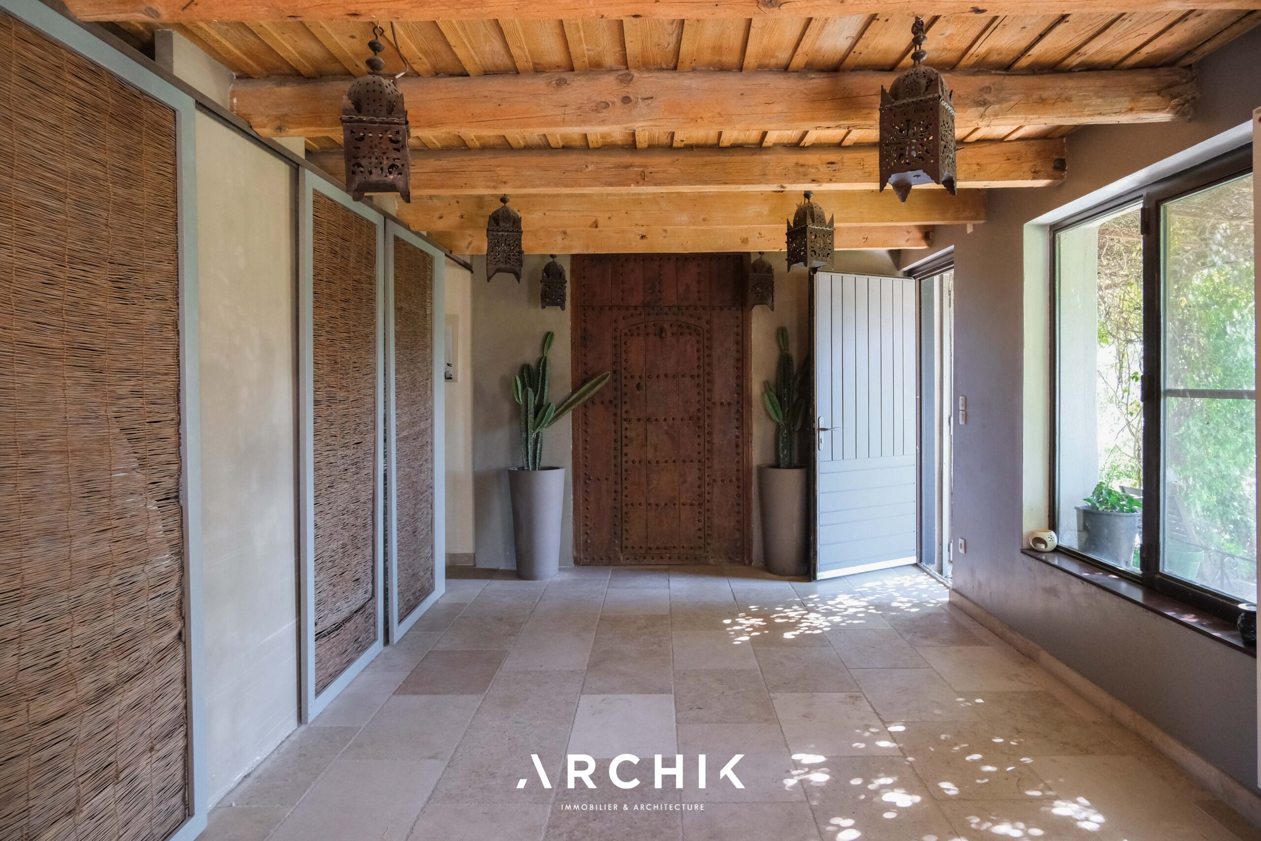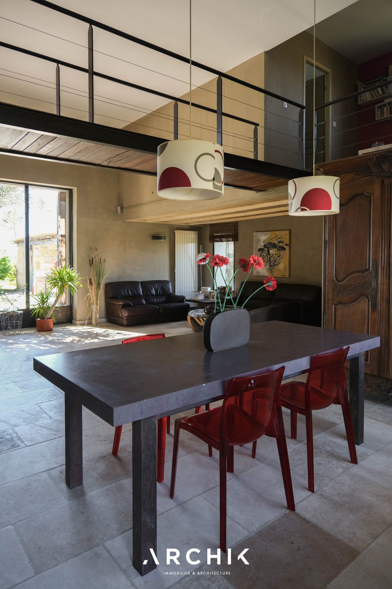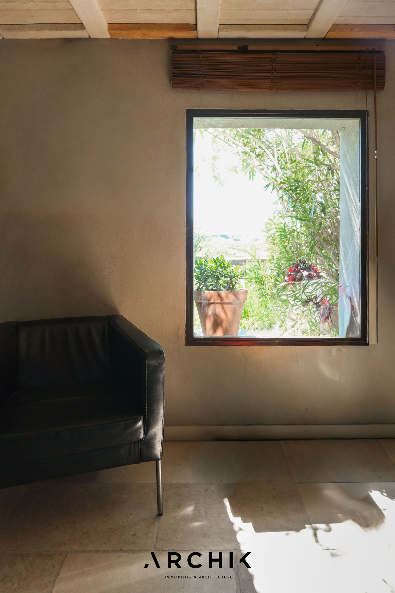 Entièrement rénové en 2005, le mas s'articule autour d'un vaste salon cathédrale baigné de lumière, largement ouvert par une baie à galandage sur le jardin et le bassin à l'ancienne en béton. La circulation fluide et les volumes ouverts signent la rénovation contemporaine du mas. Dès l'entrée, un mur en tadelakt rouge capte le regard, une teinte reprise par touches dans toute la maison, affirmant le caractère singulier des lieux. Les nombreuses ouvertures sur le paysage prolongent naturellement les espaces de vie vers l'extérieur