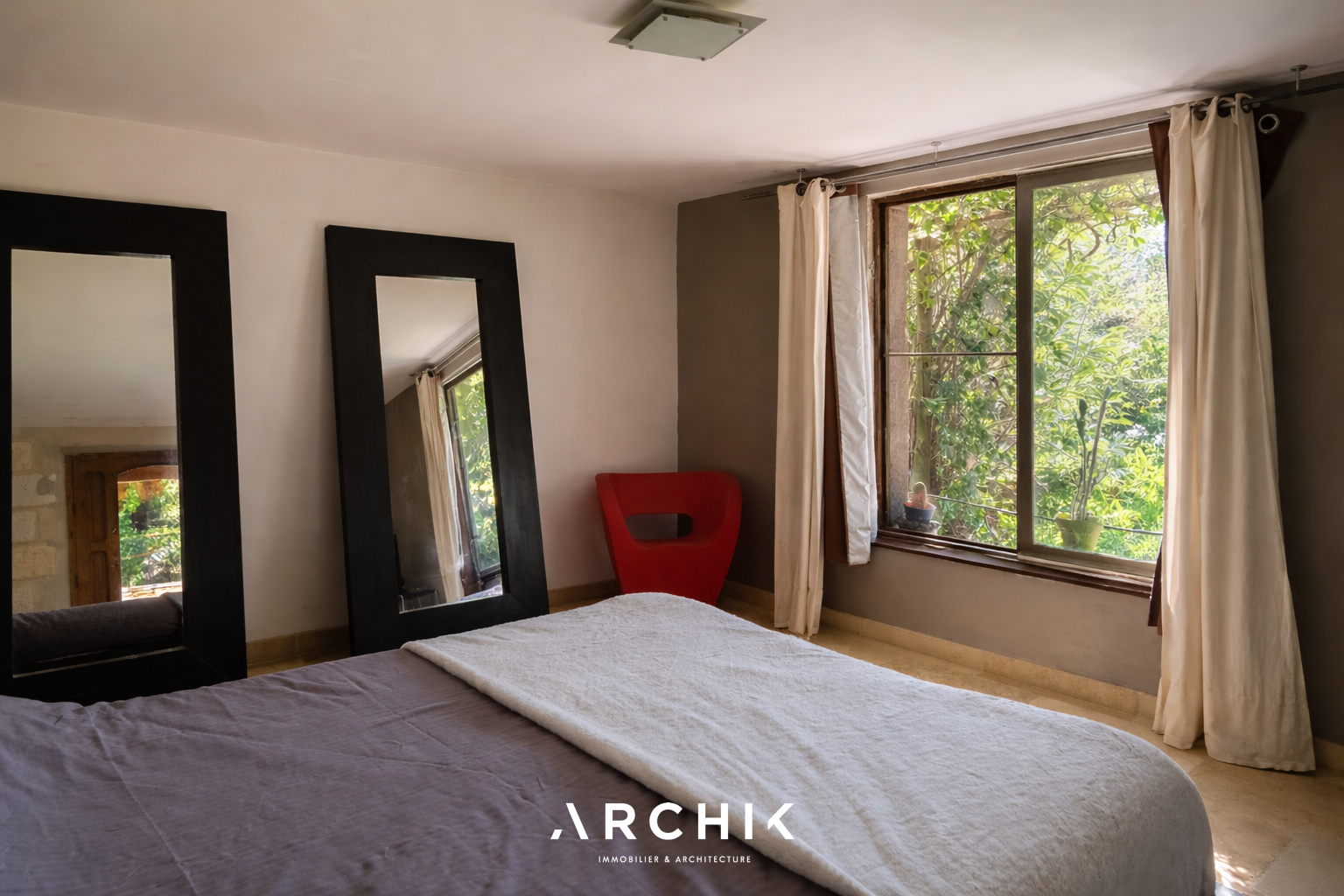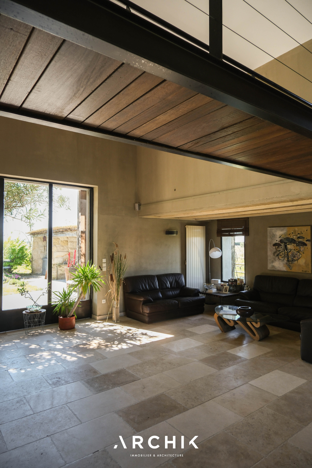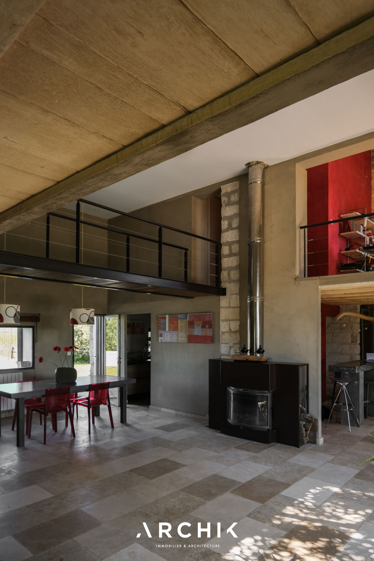 Entièrement rénové en 2005, le mas s'articule autour d'un vaste salon cathédrale baigné de lumière, largement ouvert par une baie à galandage sur le jardin et le bassin à l'ancienne en béton. La circulation fluide et les volumes ouverts signent la rénovation contemporaine du mas. Dès l'entrée, un mur en tadelakt rouge capte le regard, une teinte reprise par touches dans toute la maison, affirmant le caractère singulier des lieux. Les nombreuses ouvertures sur le paysage prolongent naturellement les espaces de vie vers l'extérieur