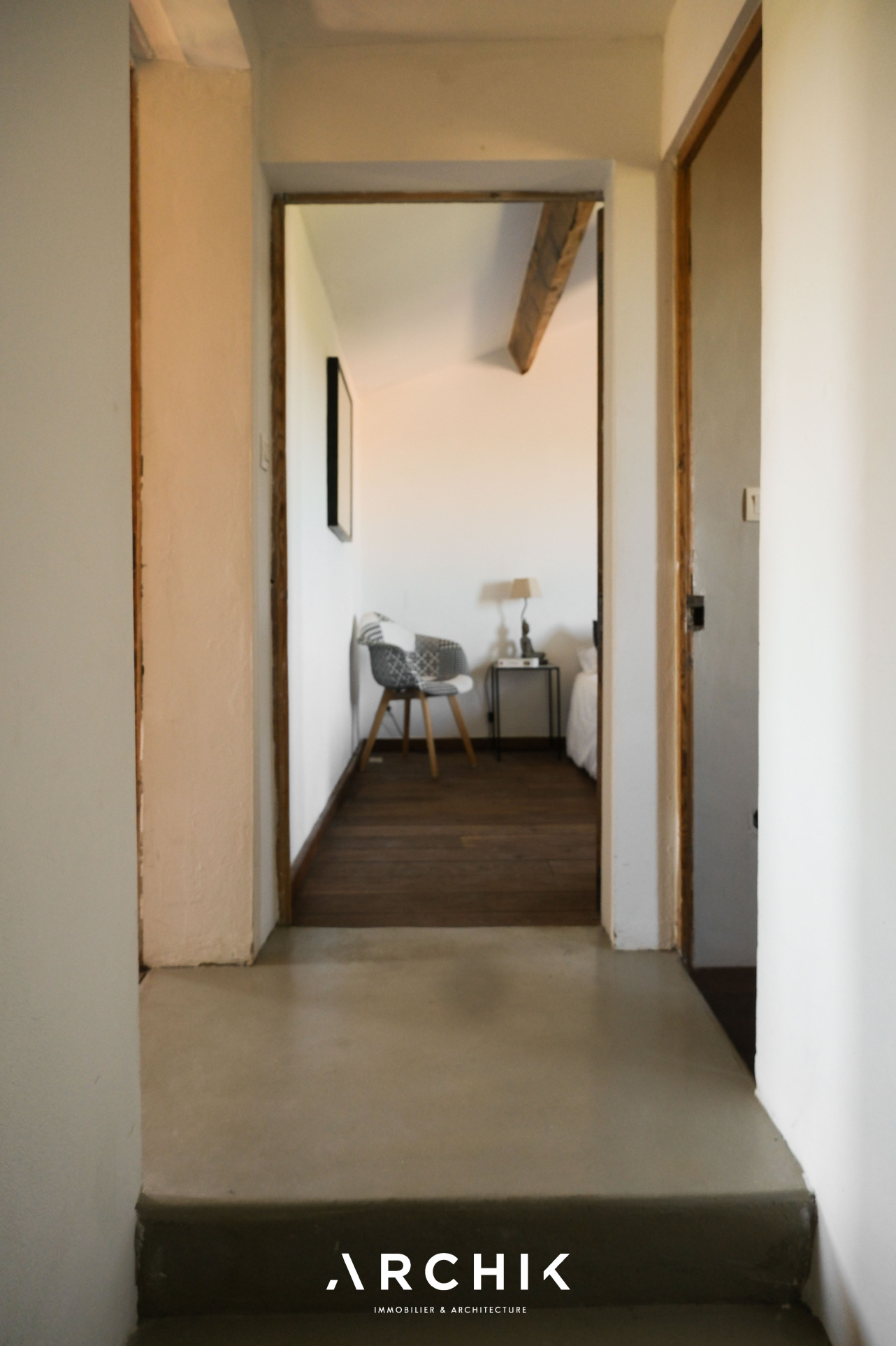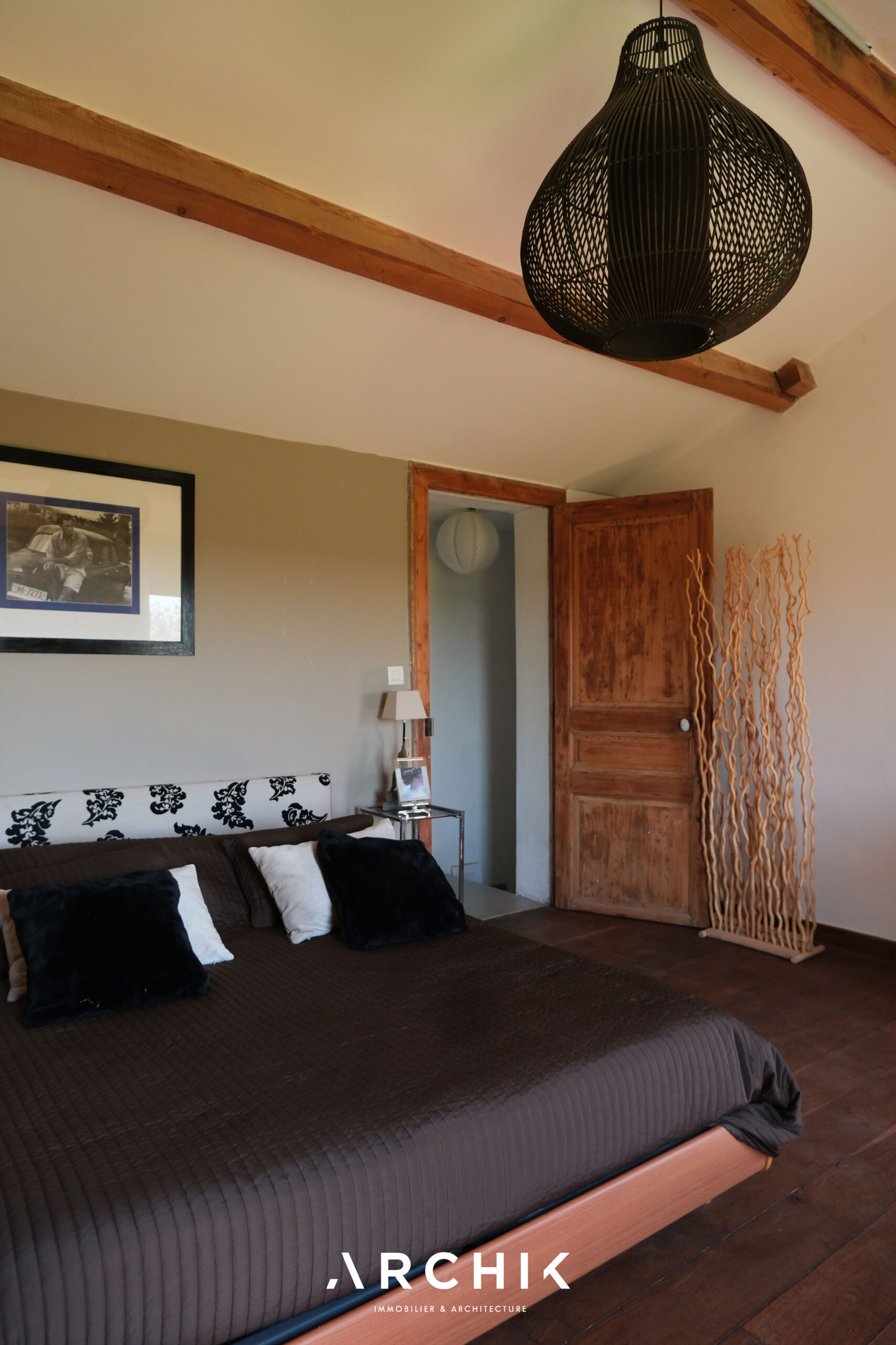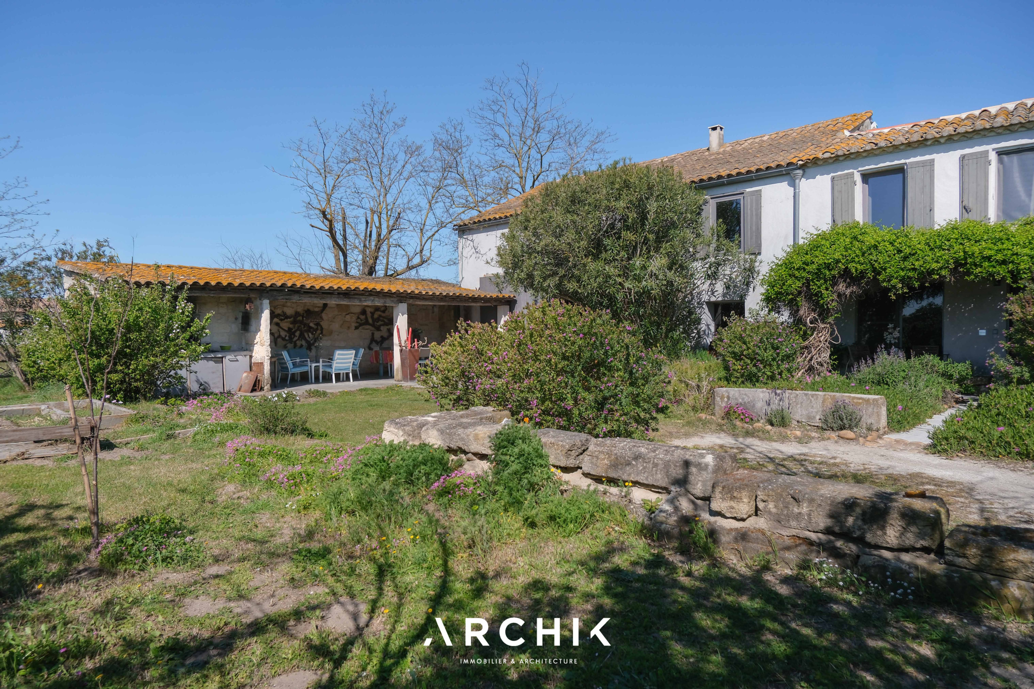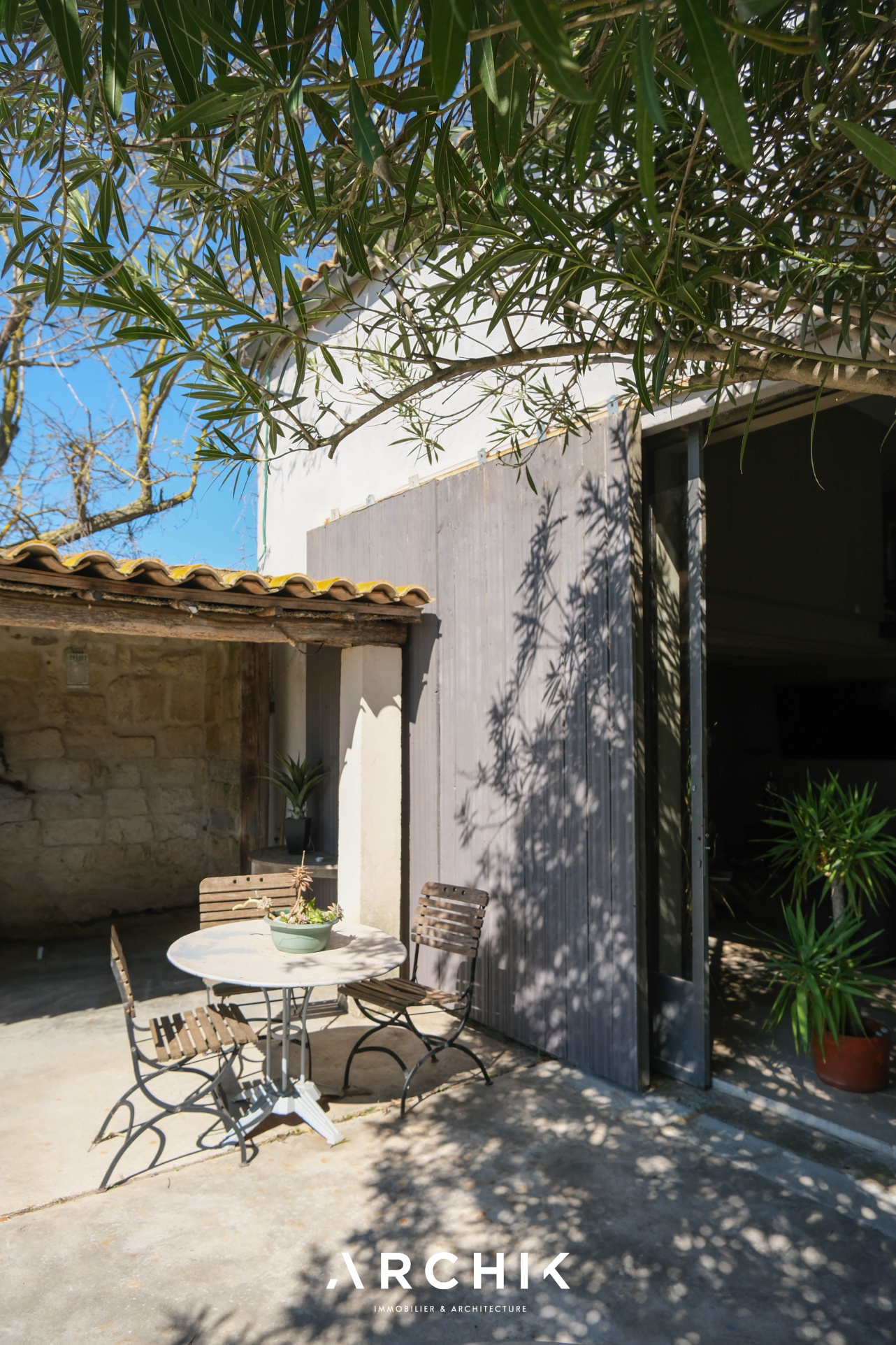 Entièrement rénové en 2005, le mas s'articule autour d'un vaste salon cathédrale baigné de lumière, largement ouvert par une baie à galandage sur le jardin et le bassin à l'ancienne en béton. La circulation fluide et les volumes ouverts signent la rénovation contemporaine du mas. Dès l'entrée, un mur en tadelakt rouge capte le regard, une teinte reprise par touches dans toute la maison, affirmant le caractère singulier des lieux. Les nombreuses ouvertures sur le paysage prolongent naturellement les espaces de vie vers l'extérieur