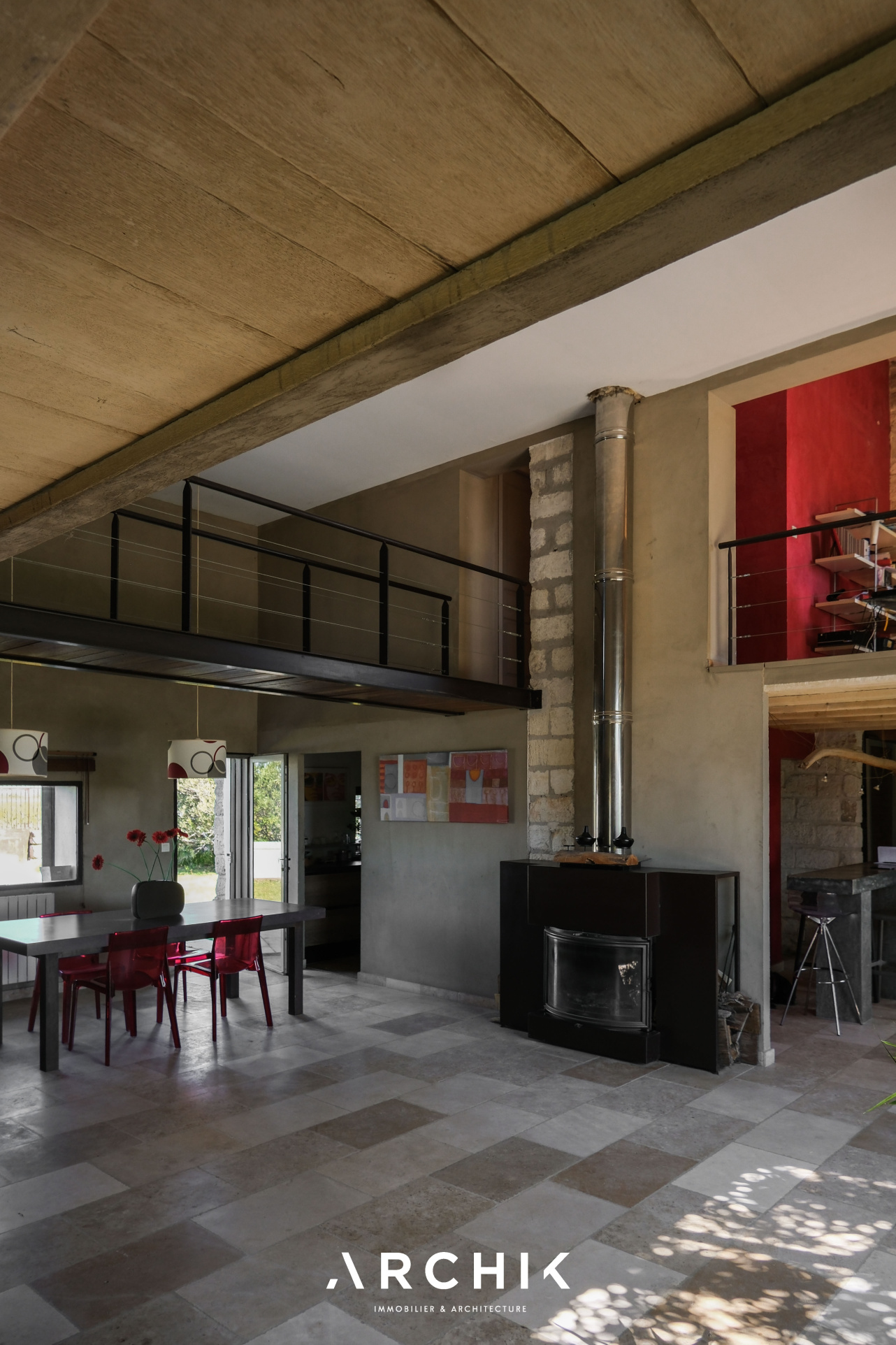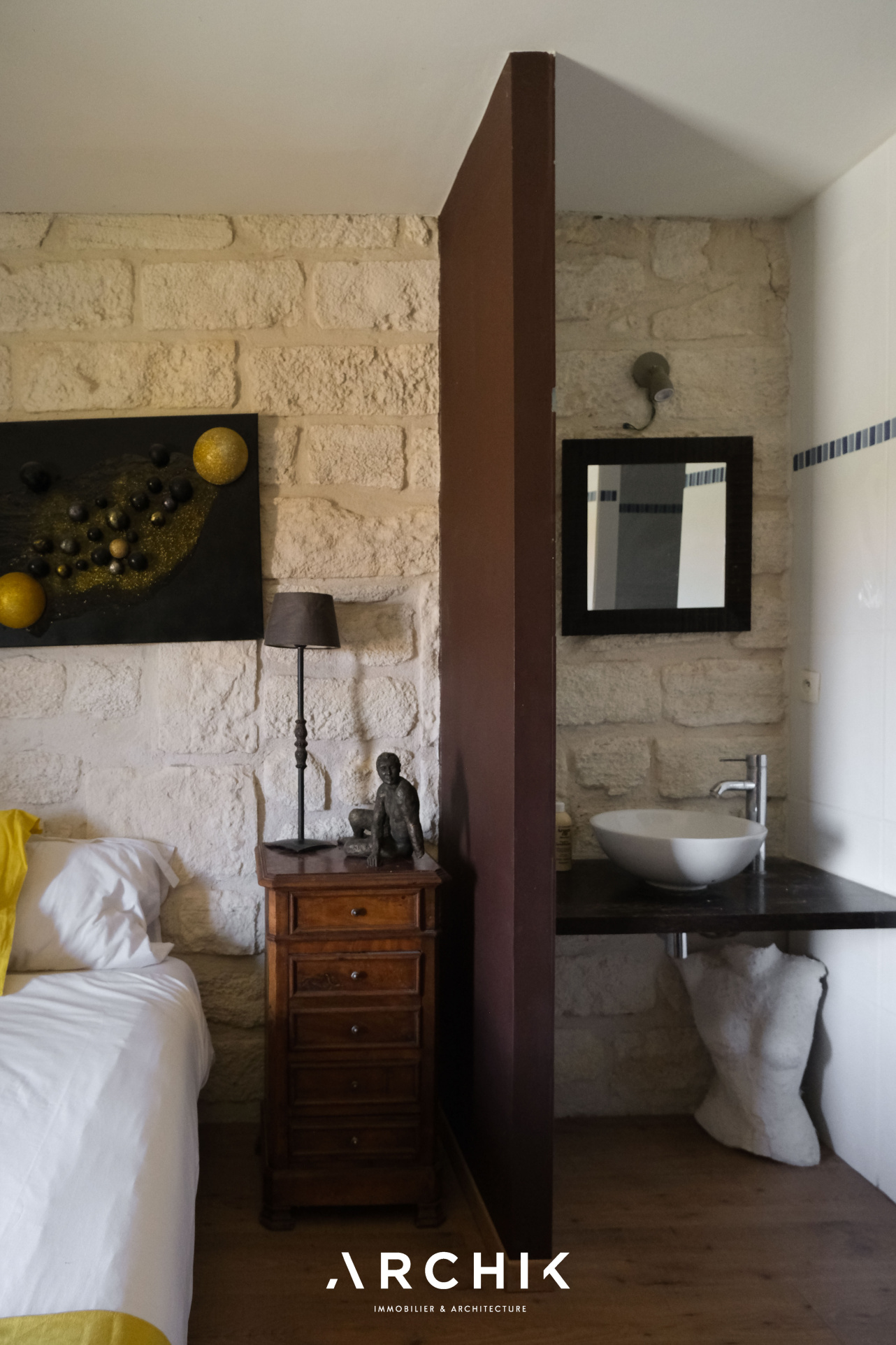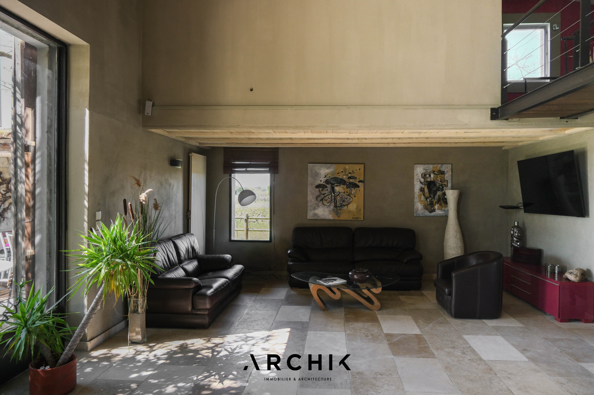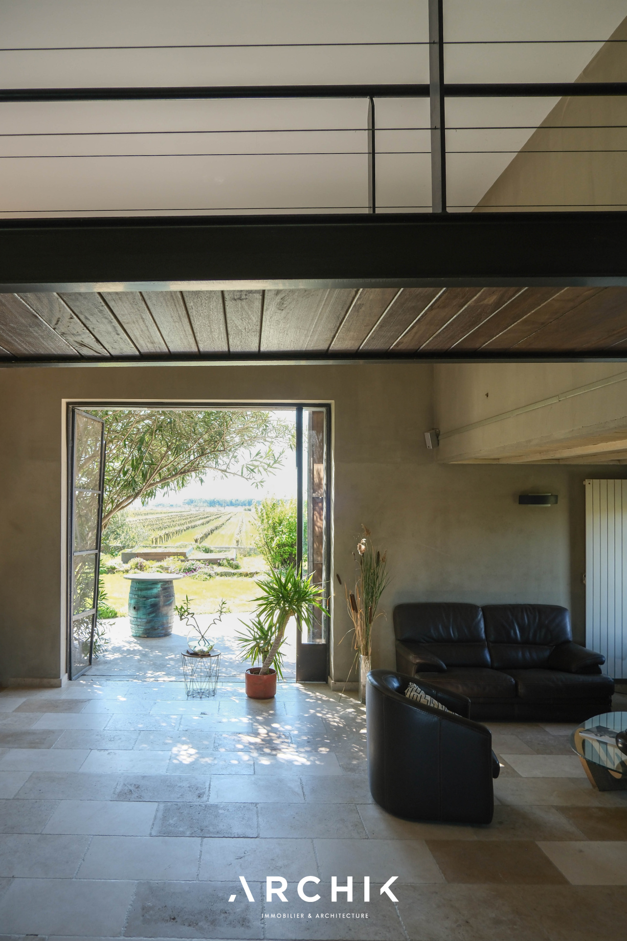 À l'étage, une passerelle en acier et chêne domine le séjour et distribue quatre chambres, un bureau et deux salles de bains. Depuis les ouvertures, la vue s'étend jusqu'au Mont Ventoux, figure emblématique du paysage. À l'extérieur, le bassin en béton à l'ancienne offre un panorama dégagé sur les vignes à perte de vue. Un pool-house vient compléter cet ensemble. Enfin, un appartement T2 de 30 m2, entièrement aménagé et disposant de son entrée indépendante, enrichit les prestations de ce bien