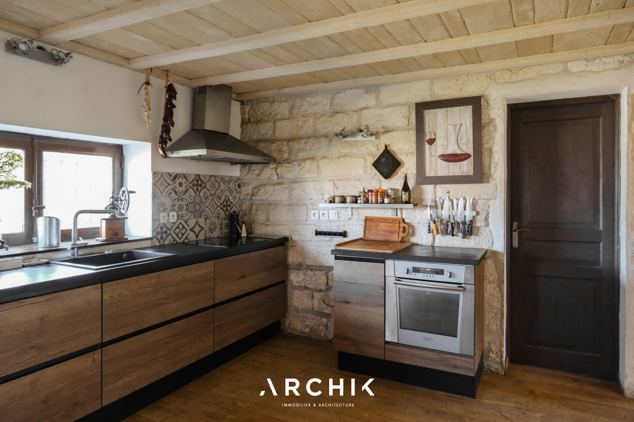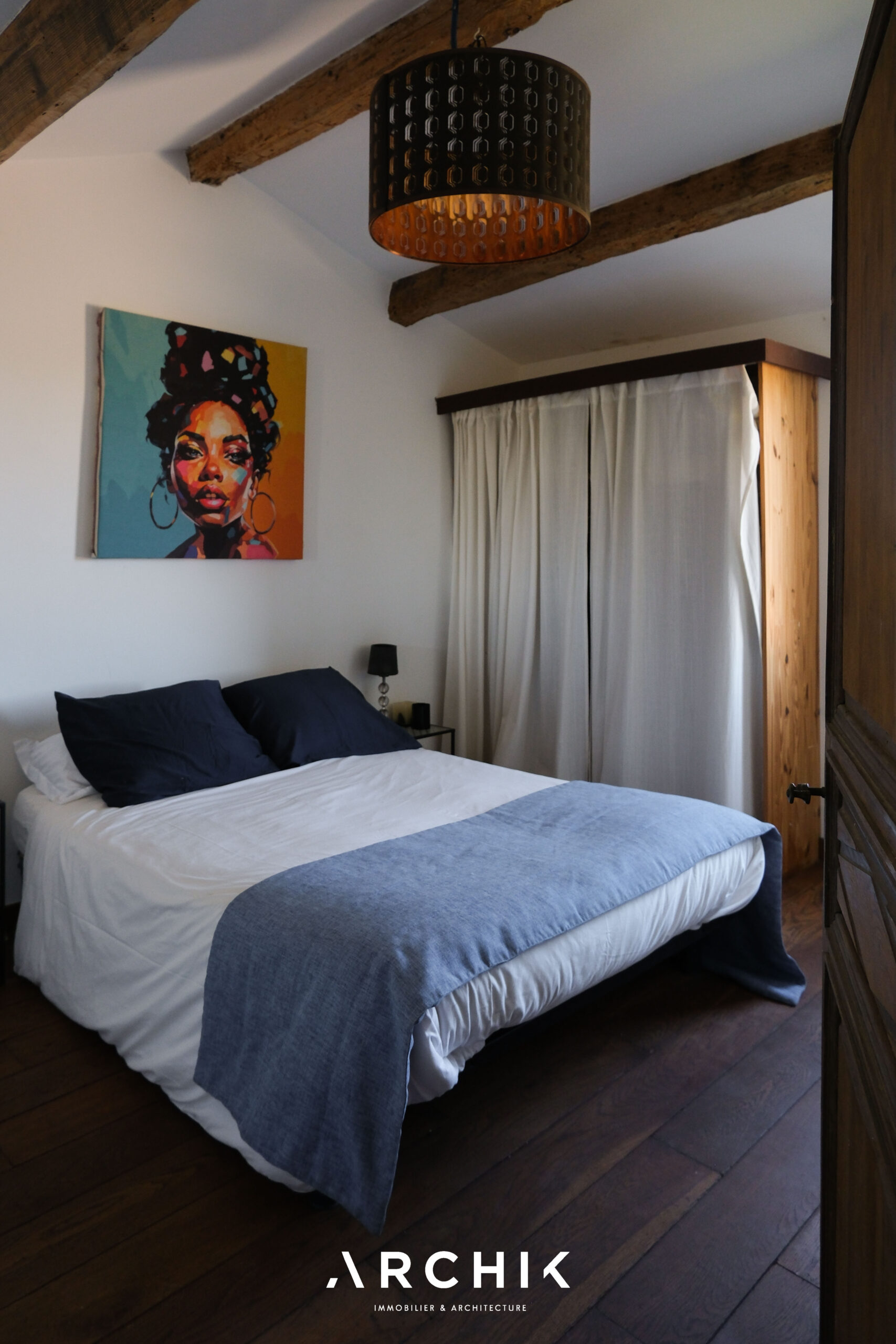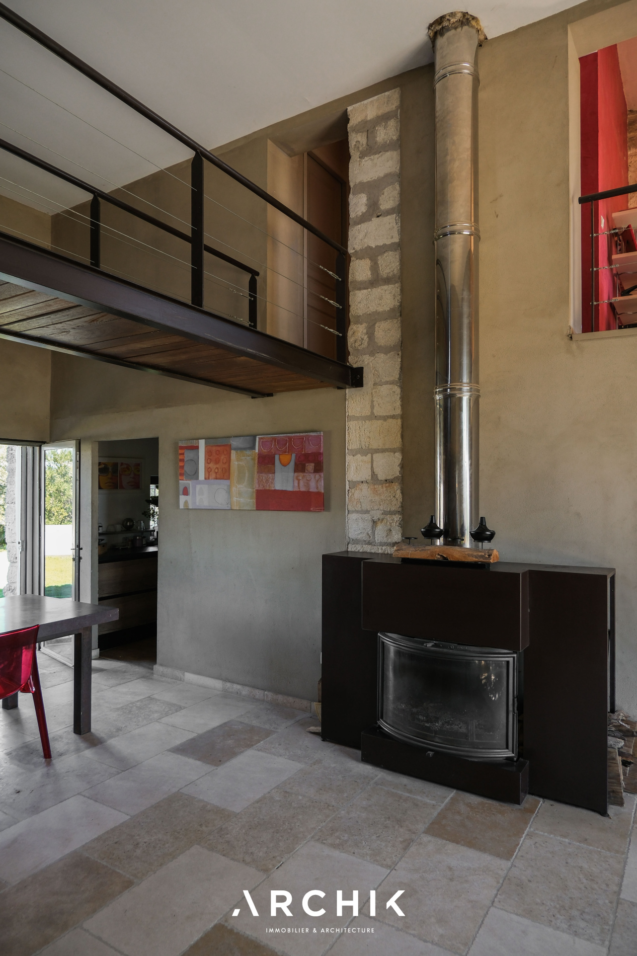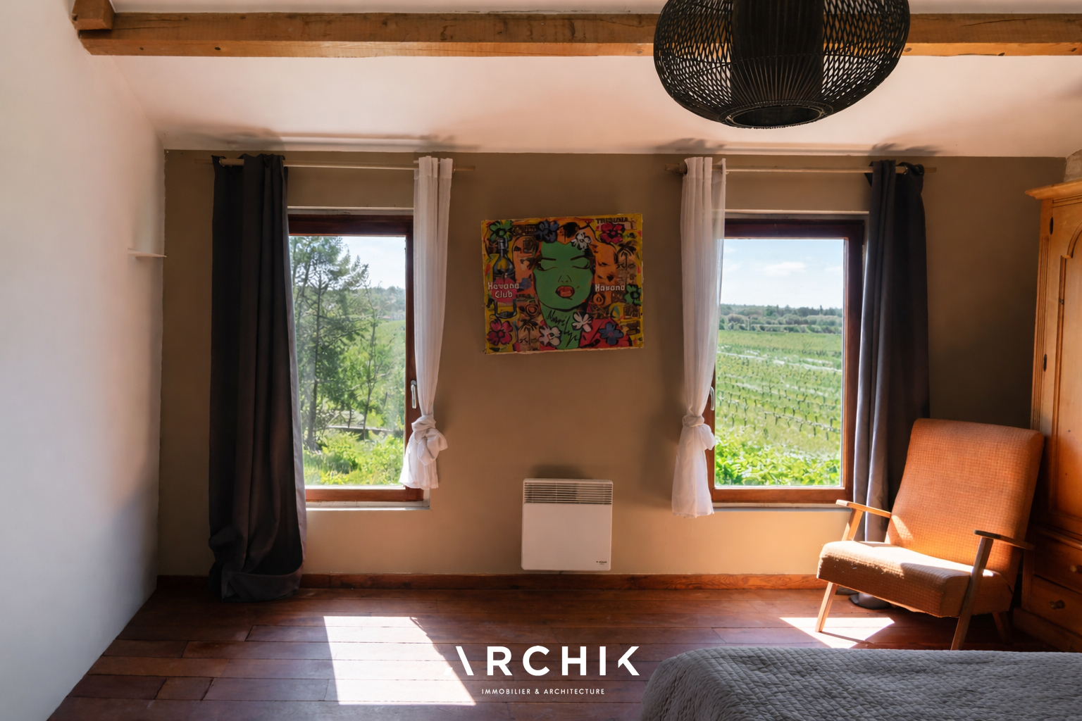 À l'étage, une passerelle en acier et chêne domine le séjour et distribue quatre chambres, un bureau et deux salles de bains. Depuis les ouvertures, la vue s'étend jusqu'au Mont Ventoux, figure emblématique du paysage. À l'extérieur, le bassin en béton à l'ancienne offre un panorama dégagé sur les vignes à perte de vue. Un pool-house vient compléter cet ensemble. Enfin, un appartement T2 de 30 m2, entièrement aménagé et disposant de son entrée indépendante, enrichit les prestations de ce bien