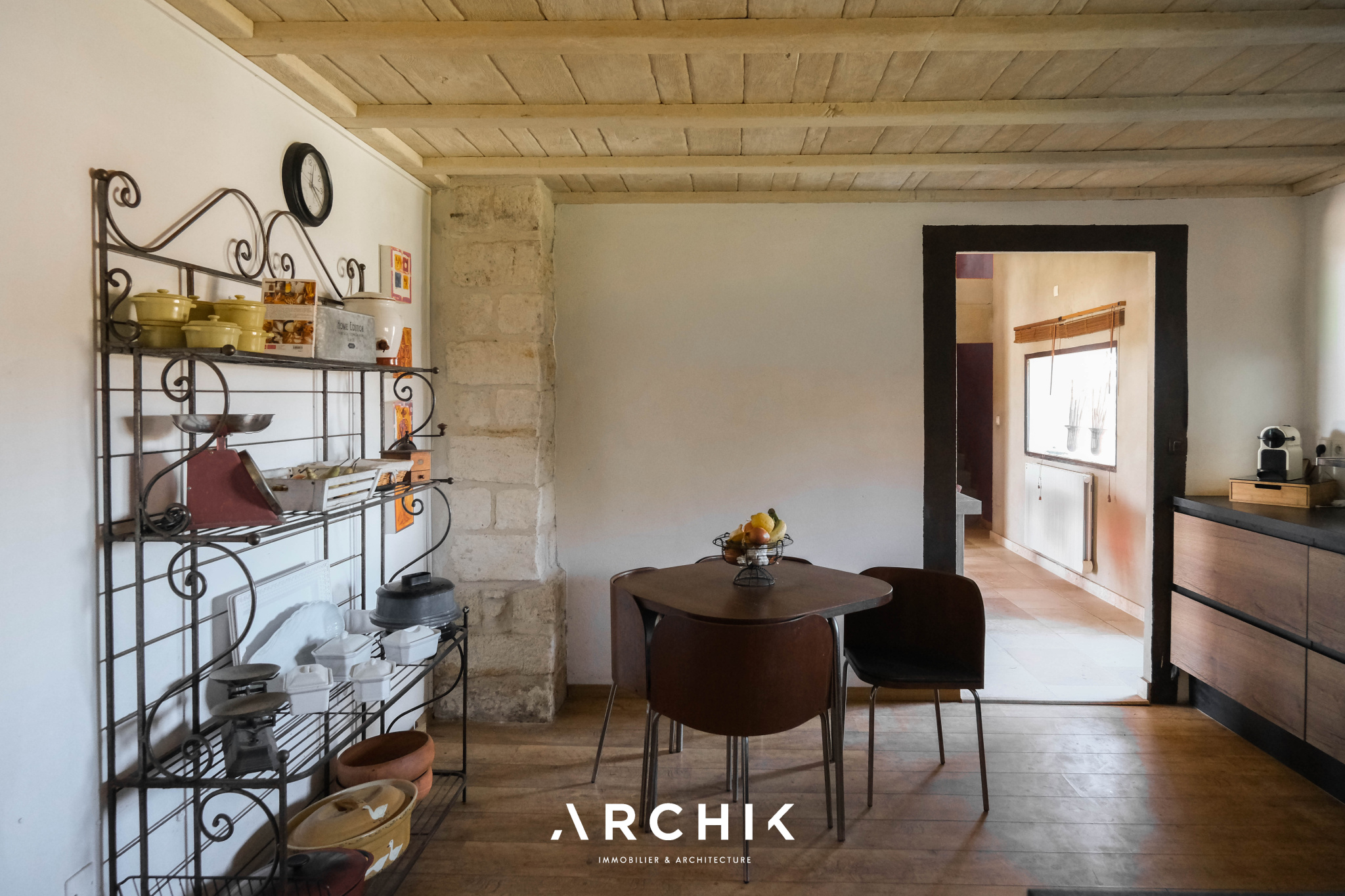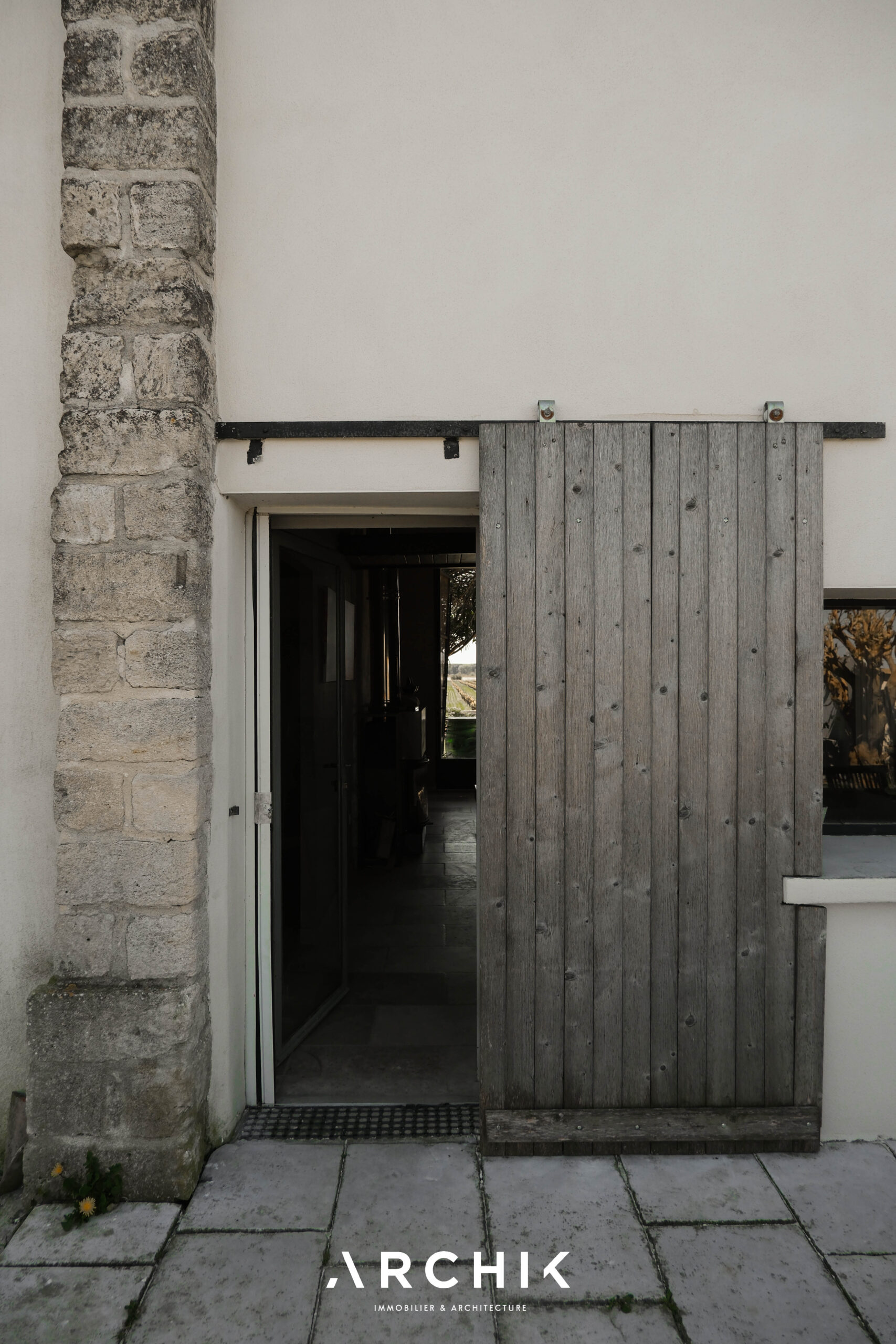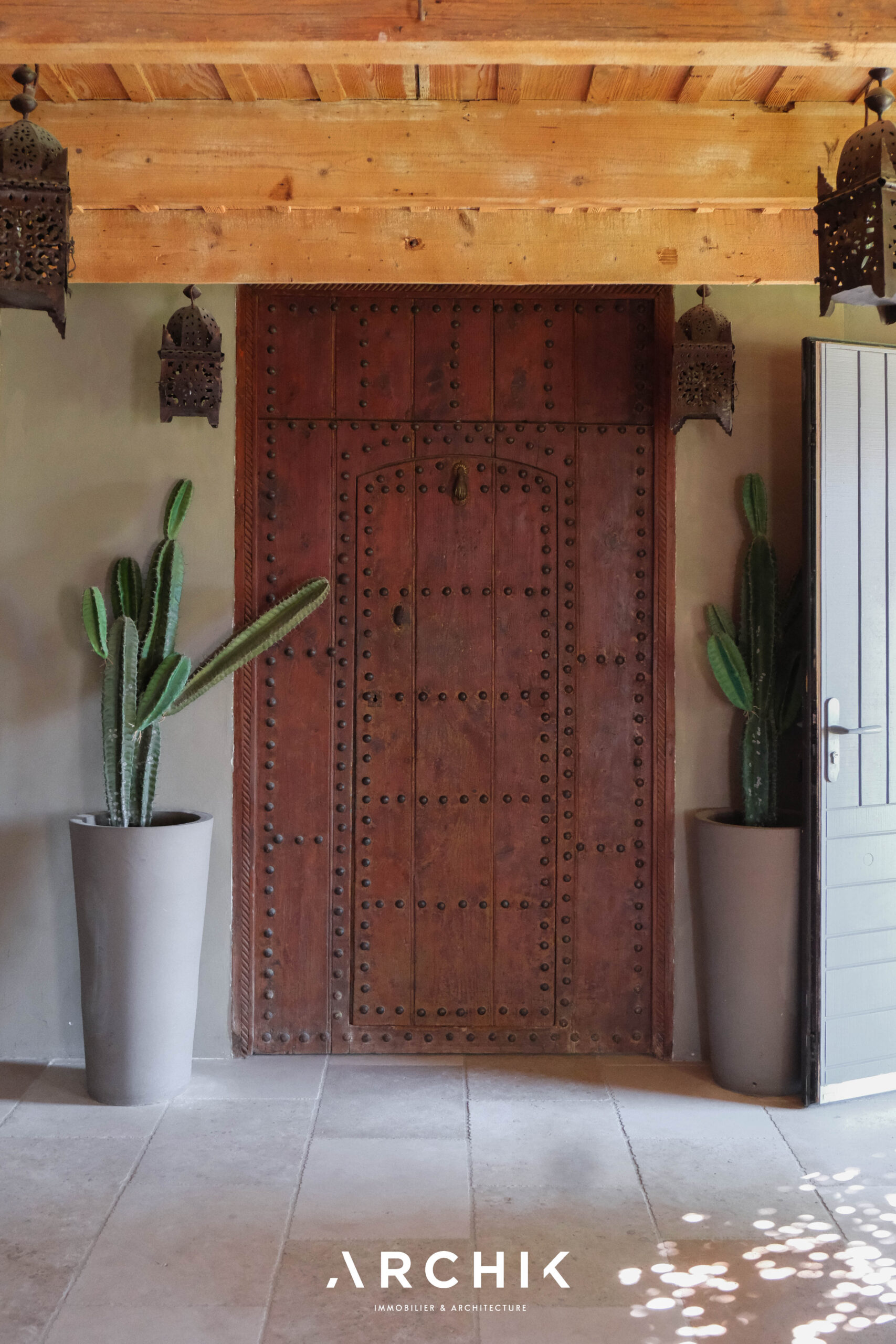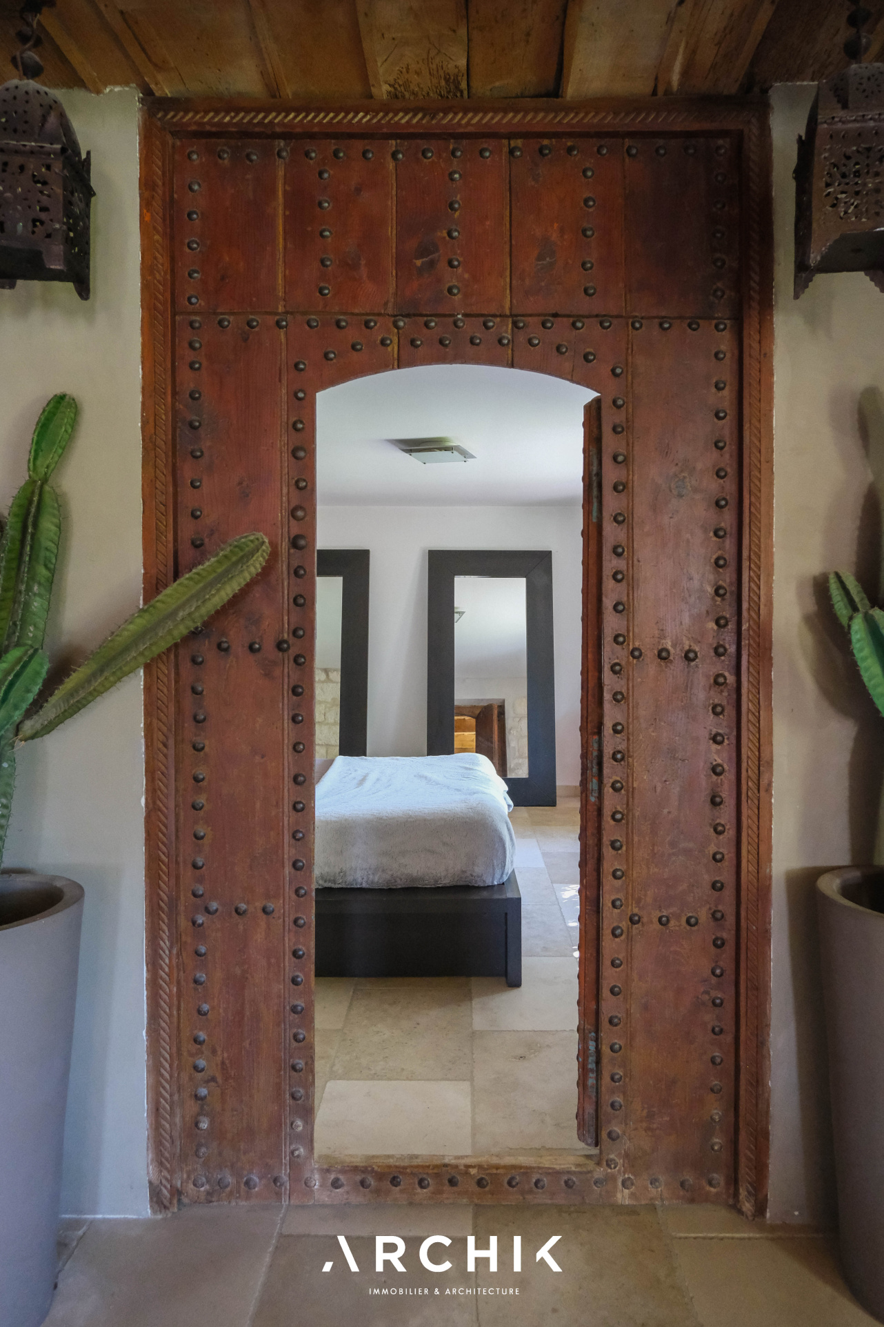 Dans sa continuité, la cuisine et la salle à manger forment un ensemble fluide tourné vers l'extérieur. Une suite de plain-pied se découvre derrière une vieille porte marocaine qui dialogue avec les poutres apparentes de l'entrée.