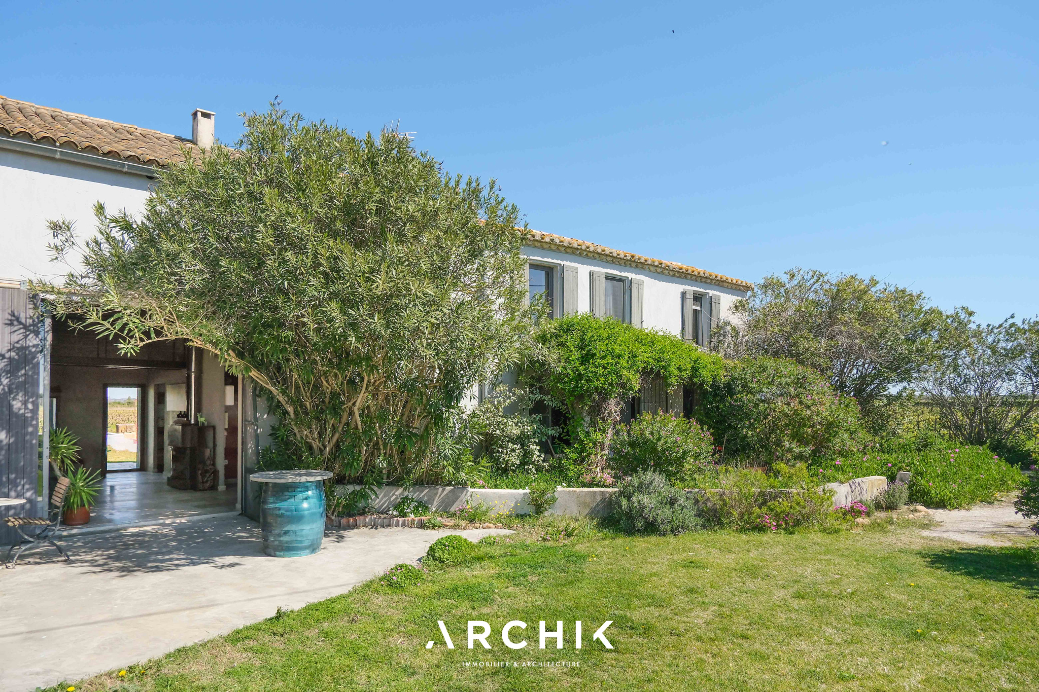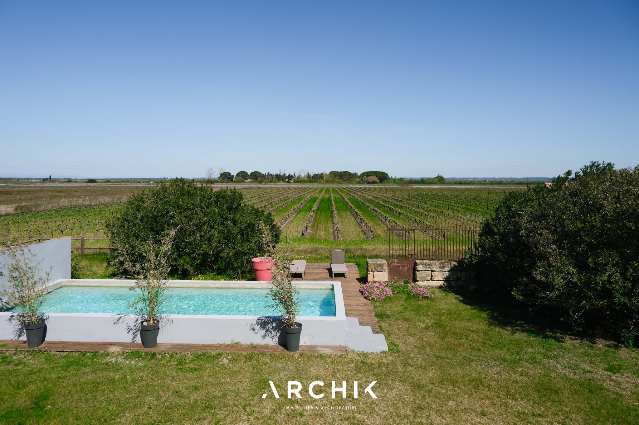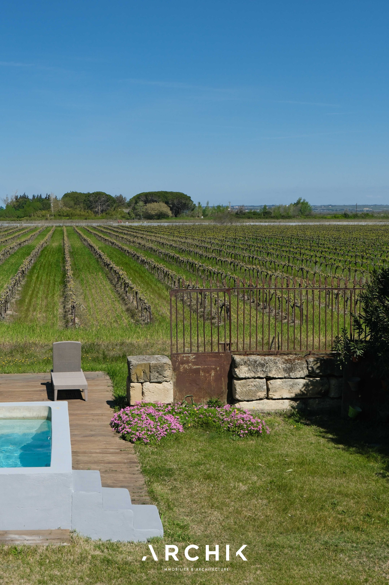 Architecture du début du XXème siècle, ce mas de caractère se développe sur 260 m2 au coeur des vignes camarguaises sur une parcelle paysagée de 2 300 m2 plantée de jasmin et de bignones, à proximité d'Aigues-Mortes.