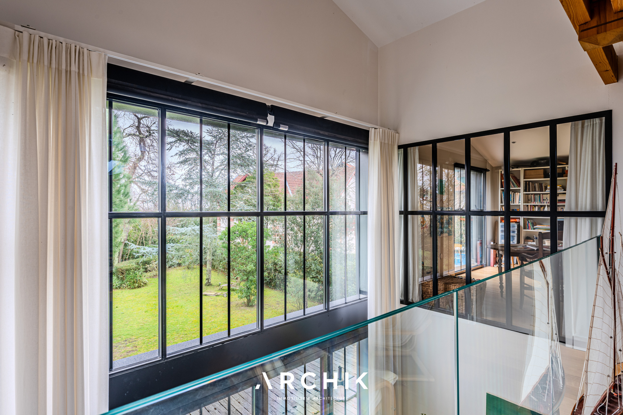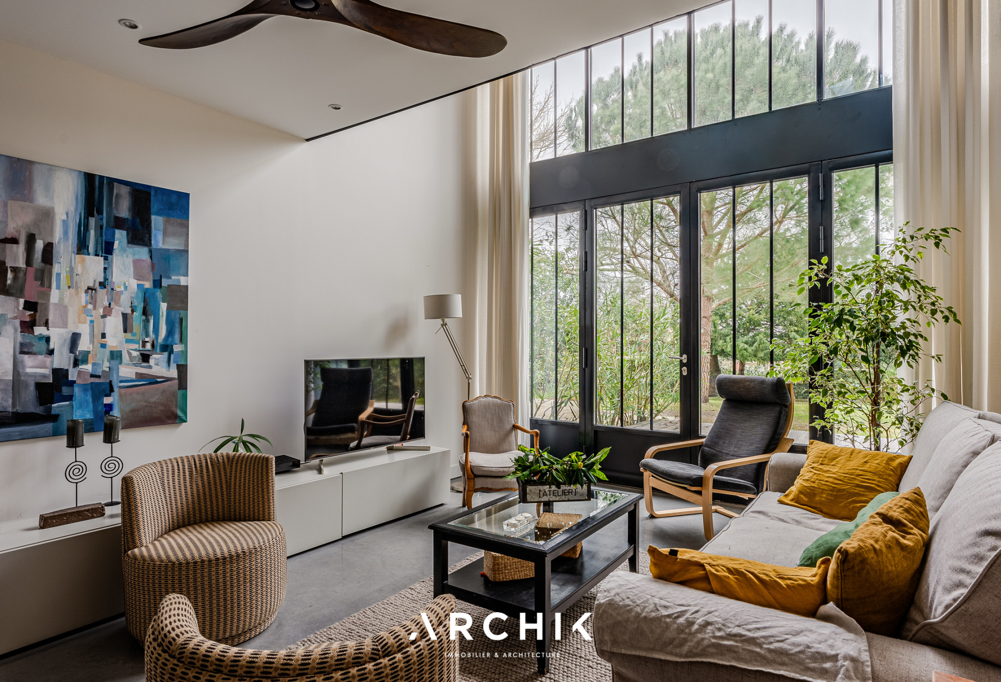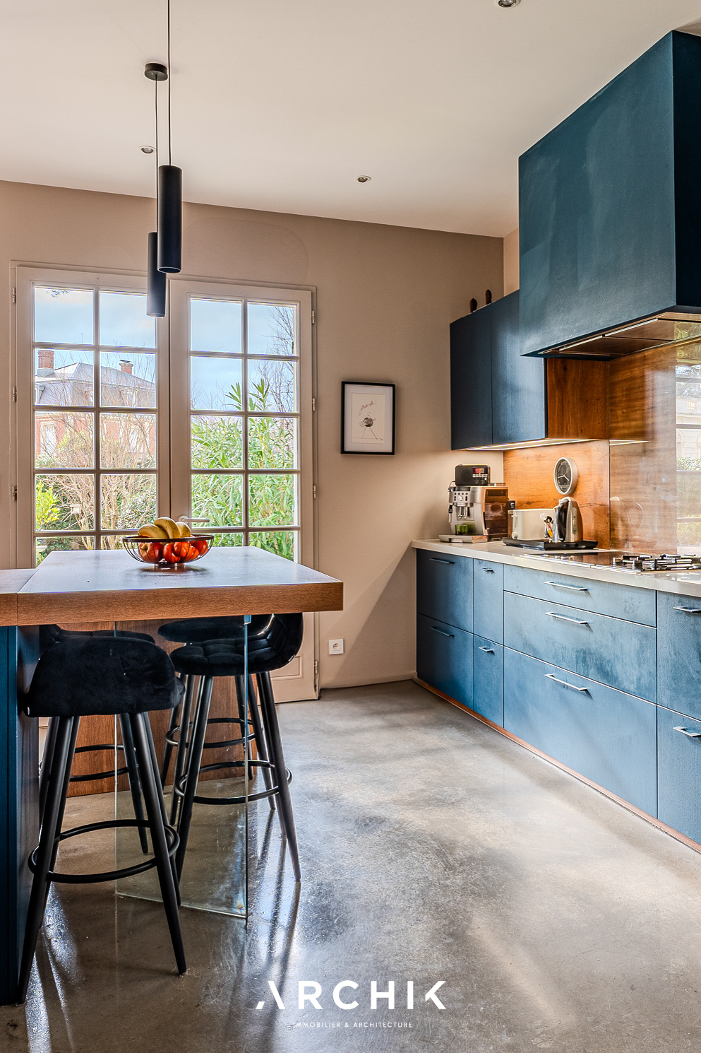 Dès l'entrée, le béton ciré met en valeur la luminosité omniprésente. Les espaces s'organisent autour d'un salon-séjour traversant de 85 m2, structuré par un volume en partie en double hauteur marqué par de belles ouvertures vitrées style atelier. Attenante, la salle à manger profite d'une ouverture cintrée, cadrant les vues extérieures. Les terrasses en bois prolongent naturellement les volumes intérieurs et inscrivent la maison dans son environnement. La cuisine semi-ouverte entièrement équipée, s'organise autour d'un espace repas sur îlot et se pare de bleu et de bois. La suite parentale de plain-pied constitue un espace privé privilégié, également ouvert sur le jardin. Les circulations sont fluides, les usages parfaitement intégrés, avec buanderie indépendante et accès direct au garage.