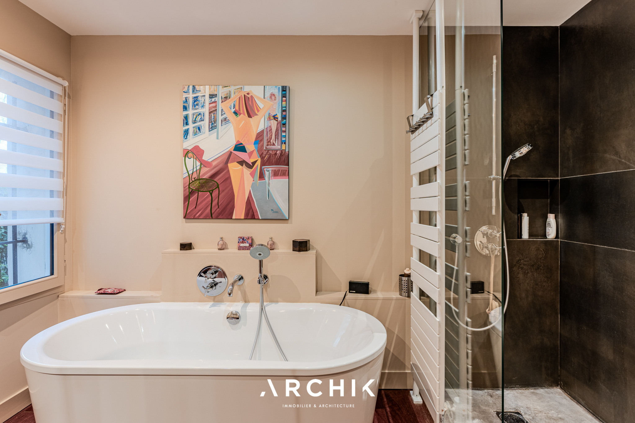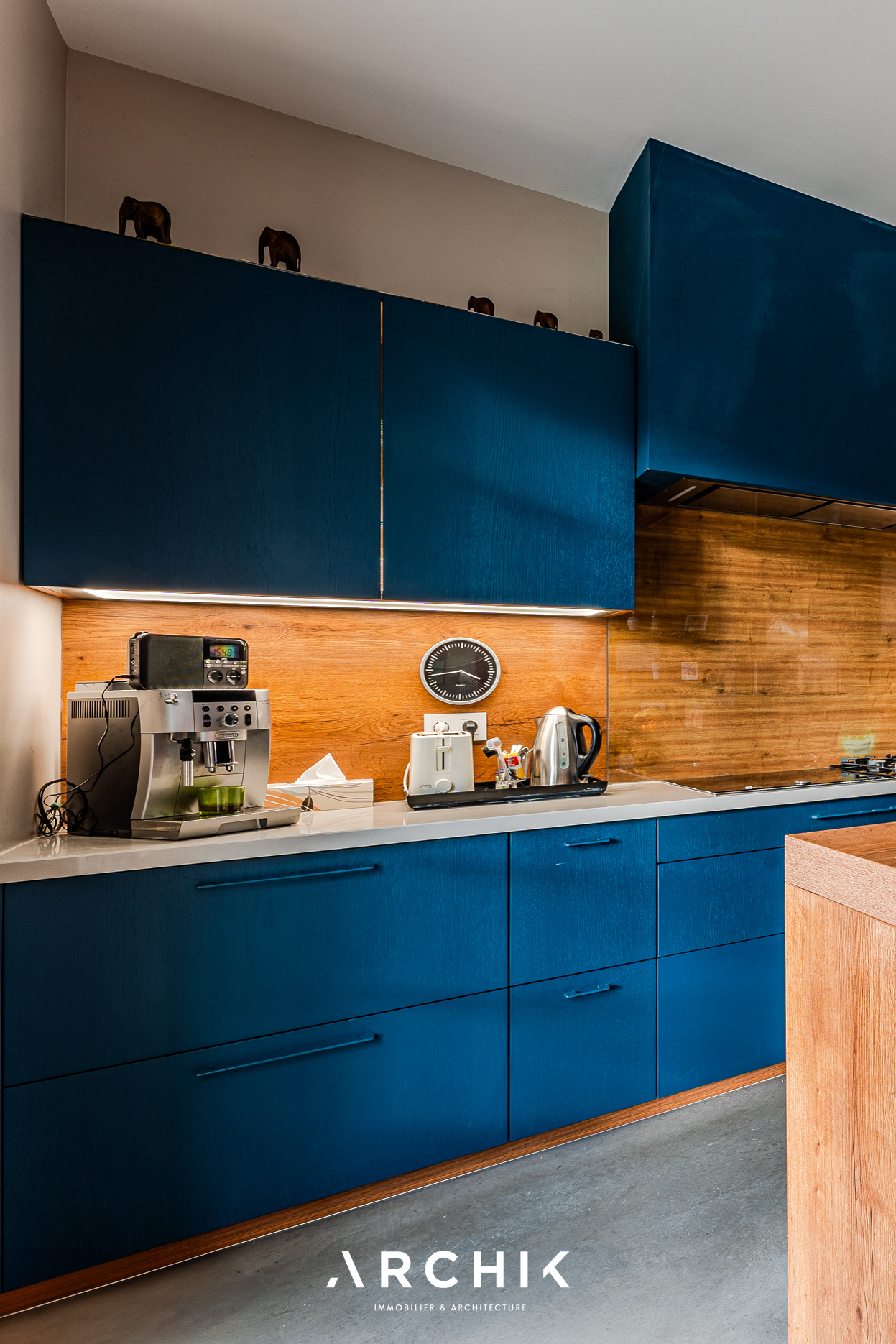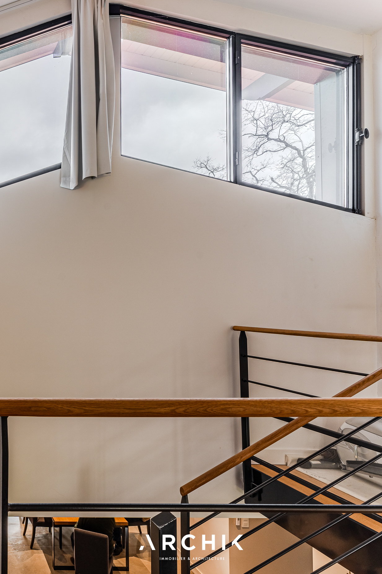 Dès l'entrée, le béton ciré met en valeur la luminosité omniprésente. Les espaces s'organisent autour d'un salon-séjour traversant de 85 m2, structuré par un volume en partie en double hauteur marqué par de belles ouvertures vitrées style atelier. Attenante, la salle à manger profite d'une ouverture cintrée, cadrant les vues extérieures. Les terrasses en bois prolongent naturellement les volumes intérieurs et inscrivent la maison dans son environnement. La cuisine semi-ouverte entièrement équipée, s'organise autour d'un espace repas sur îlot et se pare de bleu et de bois. La suite parentale de plain-pied constitue un espace privé privilégié, également ouvert sur le jardin. Les circulations sont fluides, les usages parfaitement intégrés, avec buanderie indépendante et accès direct au garage.