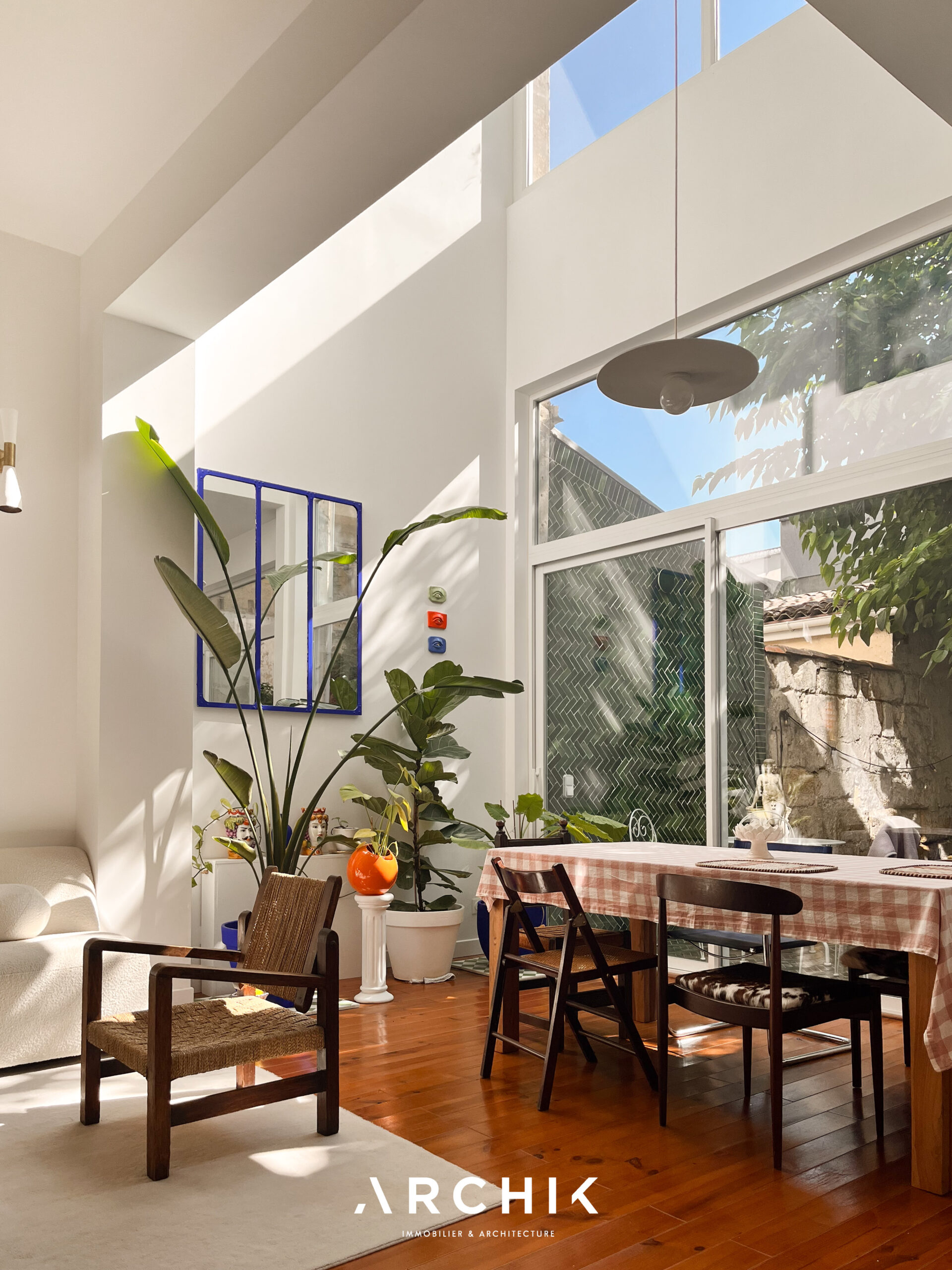 + DE DETAILS METAFORA BORDEAUX | Nansouty – Saint-Genès 945 000 € Type de bien Maison Surface 180 m2 Chambre(s) 4 Courant Haussmannien Architecture À vivre Réference BX1257 ON AIMELes volumes La grande luminosité La terrasse à l'ambiance orientaleNOUS CONTACTER Architecture traditionnelle bordelaise datant de 1860, cette échoppe à étage de 200 m2 au sol, se tient sur un terrain de 131 m2, idéalement situé près des écoles et de l'hyper centre dans le quartier Tondu.Repensée en 2020 par le Studio Rococo, la maison a été réorganisée afin d'ouvrir les espaces et amener un maximum de lumière. Sur trois niveaux, elle séduit par ses grands volumes et ses hauteurs sous plafond de plus de 3.60 m. L'entrée, parée de carreaux de ciment d'origine, mène à une pièce de vie de plus de 50 m2 avec cuisine en retrait et buanderie attenante. L'espace, baigné de lumière, invite à la contemplation avec ses grandes baies vitrées double hauteur donnant sur un jardin intimiste d'environs 45 m2 et verdoyant. Une partie terrasse en Zelliges vert émeraude assure une continuité entre intérieur et extérieur et enveloppe le lieu d'une douceur orientale. L'accès à l'étage se fait par un escalier en pierre avec ferronnerie qui a gardé tout son cachet d'origine. Pensé comme un lieu de transition central, il dévoile plusieurs points de vue grâce aux percements de lumière des châssis, permettant ainsi une liaison entre les différents espaces de la maison. Le second niveau s'articule autour d'un salon de lecture avec garde-corps en verre et vue sur les toits et le bleu du ciel. Ce plateau dessert trois chambres qui partagent une grande salle de bain avec meuble carrelé pastel qui retranscrit la fusion entre ancien et moderne propre à cette rénovation. En contraste avec l'ancien, un escalier métallique thermolaqué blanc permet d'accéder à une suite parentale au dernière étage. Ce spacieux cocon aux teintes naturelles avec charpente apparente bénéficie d'une salle d'eau aux airs méditerranéens. Afin de recevoir confortablement, une chambre indépendante avec salle de bain se trouve à l'entrée. Le sous-sol aménagé avec des grands placards sur mesure est desservi par un escalier enduit à la chaux, et offre la possibilité de créer un espace home cinéma. Une maison de ville au charme hybride, alliant la délicatesse de l'ancien à une architecture contemporain. LE QUARTIER Nansouty – Saint-Genès Situés au Sud du centre-ville de Bordeaux, les quartiers de Nansouty et Saint-Genès sont axés autour de la place Nansouty récemment rénovée avec ses petits commerces et ses terrasses conviviales pour boire un café à la sortie de l’école ou un verre le soir entre amis. VOTRE CONTACT Amanda ROY LOQUAY 06 59 44 54 07 amanda.roy@archik.fr DIAGNOSTICPARTAGERDétail du diagnostic Diagnostic de performance énergétique 138 KWh/m².an 4* kg CO2/m².an Logement économeABCDEFGLogement énergivore DPE vierge Consommations non exploitables Non soumis au diagnostic * Dont émissions de gaz à effet de serreFaible émission de GESABCDEFGForte émission de GES 4 KgéqCO2 / m².an GES vierge Consommations non exploitables Montant estimé des dépenses annuelles d'énergie pour un usage standard : entre 1900 et 2610 € TTC/an . Date de référence des prix de l'énergie pour établie cette estimation : 01/01/2000 Les informations sur les risques auxquels ce bien est exposé sont disponibles sur le site Géorisques : www.georisques.gouv.fr Vous souhaitez avoir plus d'informations ? Remplissez le formulaire ou contactez directement la personne en charge de ce bien. NOM* PRÉNOM* EMAIL* TÉLÉPHONE* MESSAGE Je souhaite recevoir la Newsletter ARCHIK VOTRE CONTACT Amanda ROY LOQUAY 06 59 44 54 07 amanda.roy@archik.fr Découvrez aussi ...VENDRENos biens en venteNOS BIENS VENDUS
