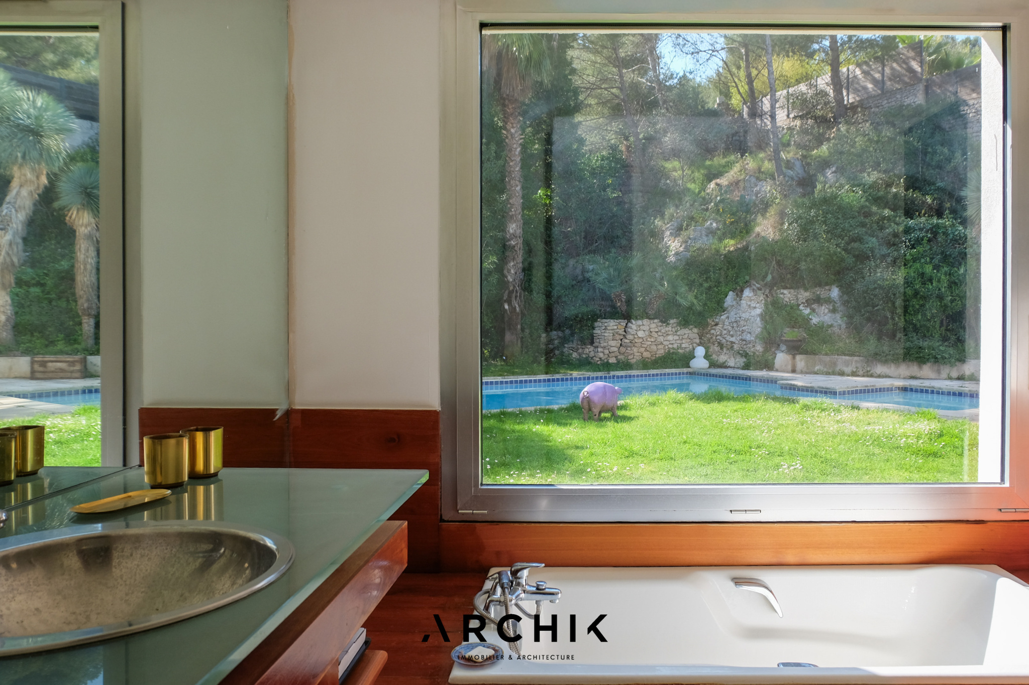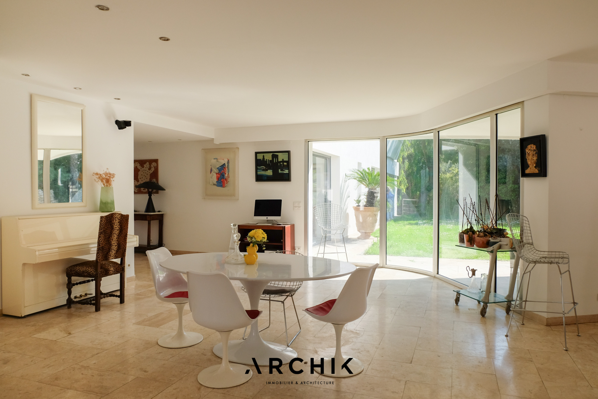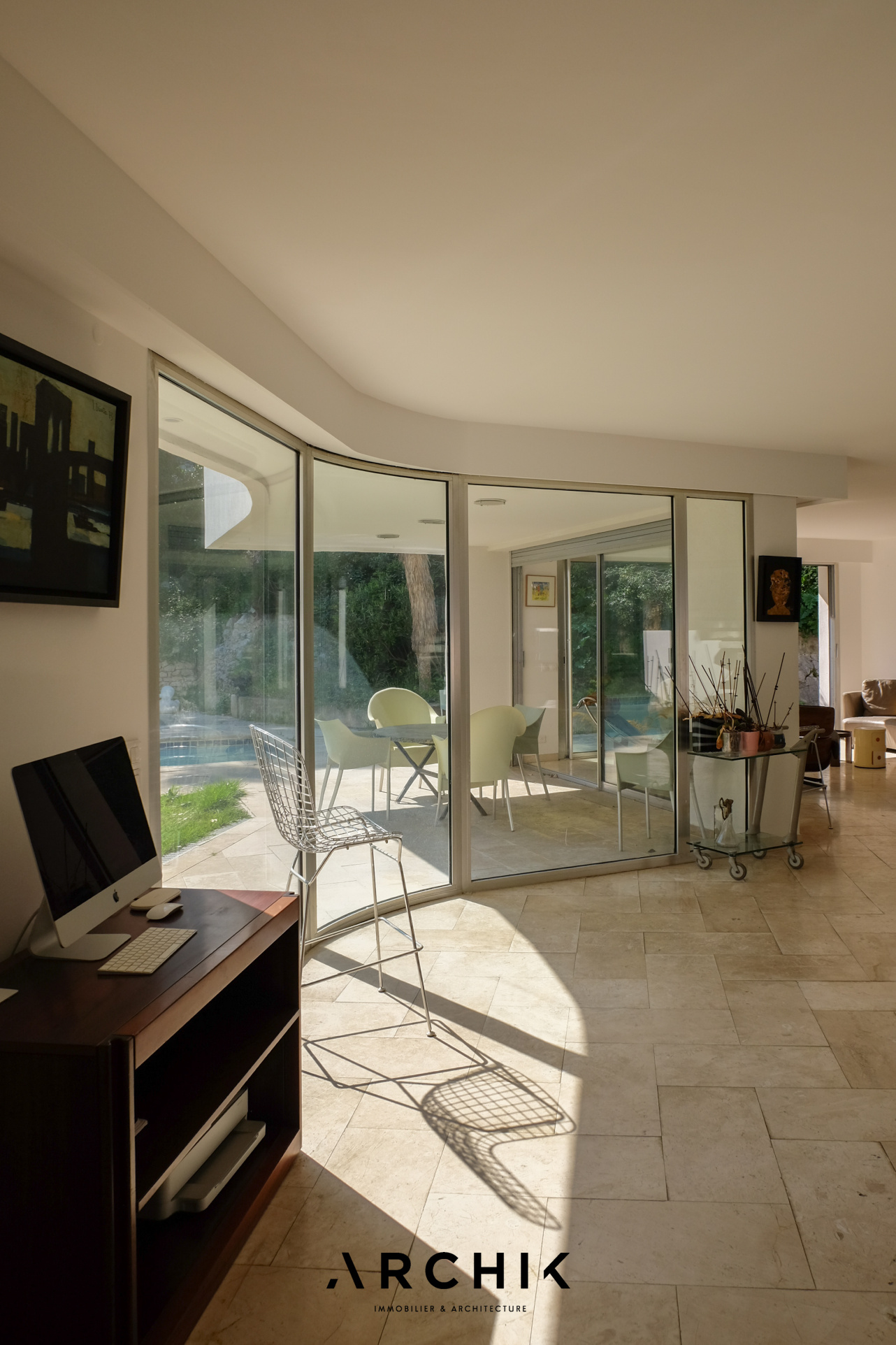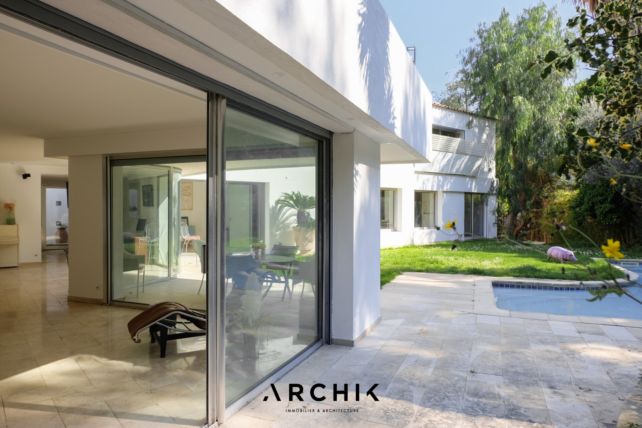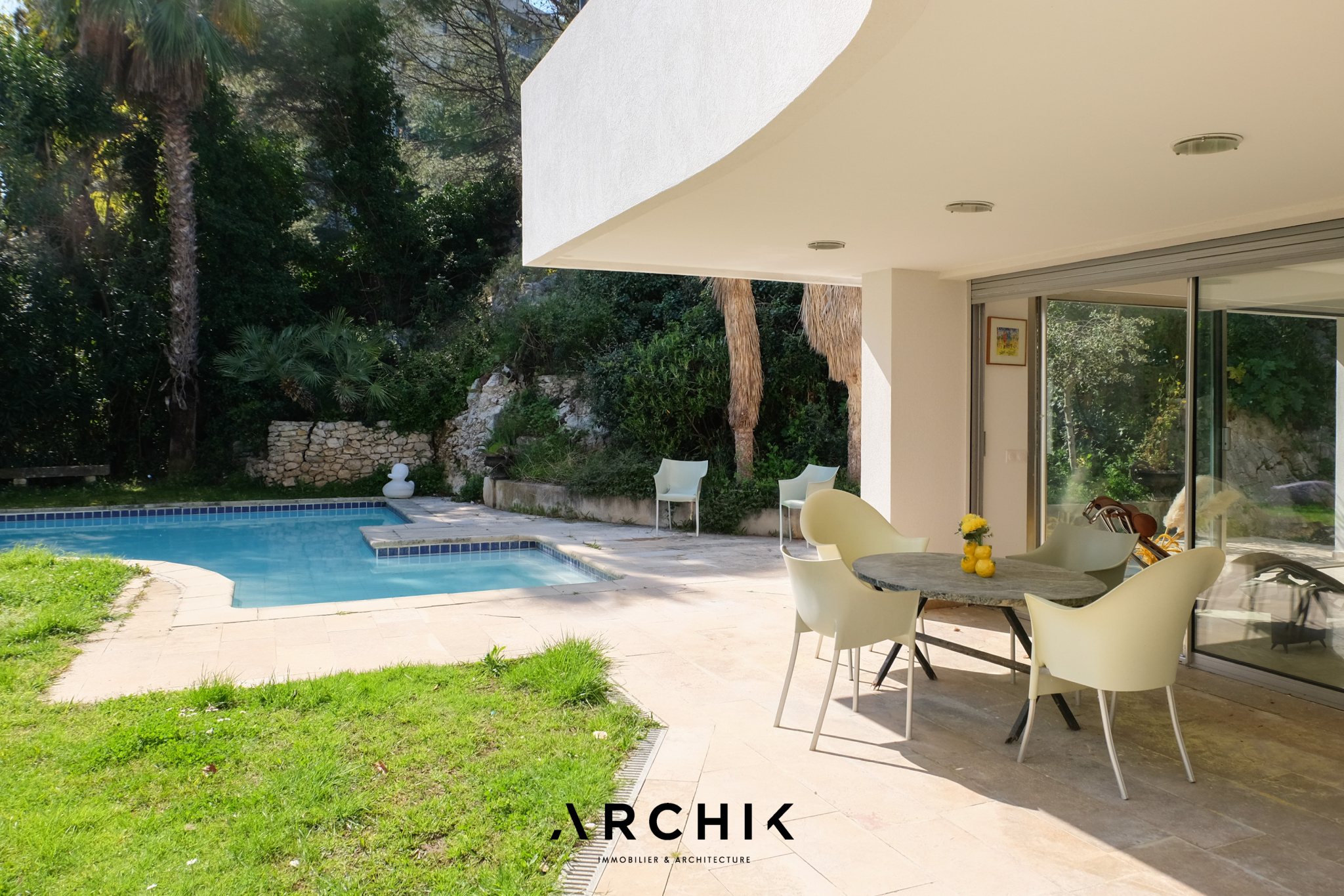 Architecture contemporaine, cette villa d'architecte située sur les hauteurs de Périer accueille un généreux rez-de-jardin de 183 m2 aux lignes pures ouvert sur un jardin verdoyant de 600 m2 avec piscine et terrasse au coeur d'un écrin de verdure.