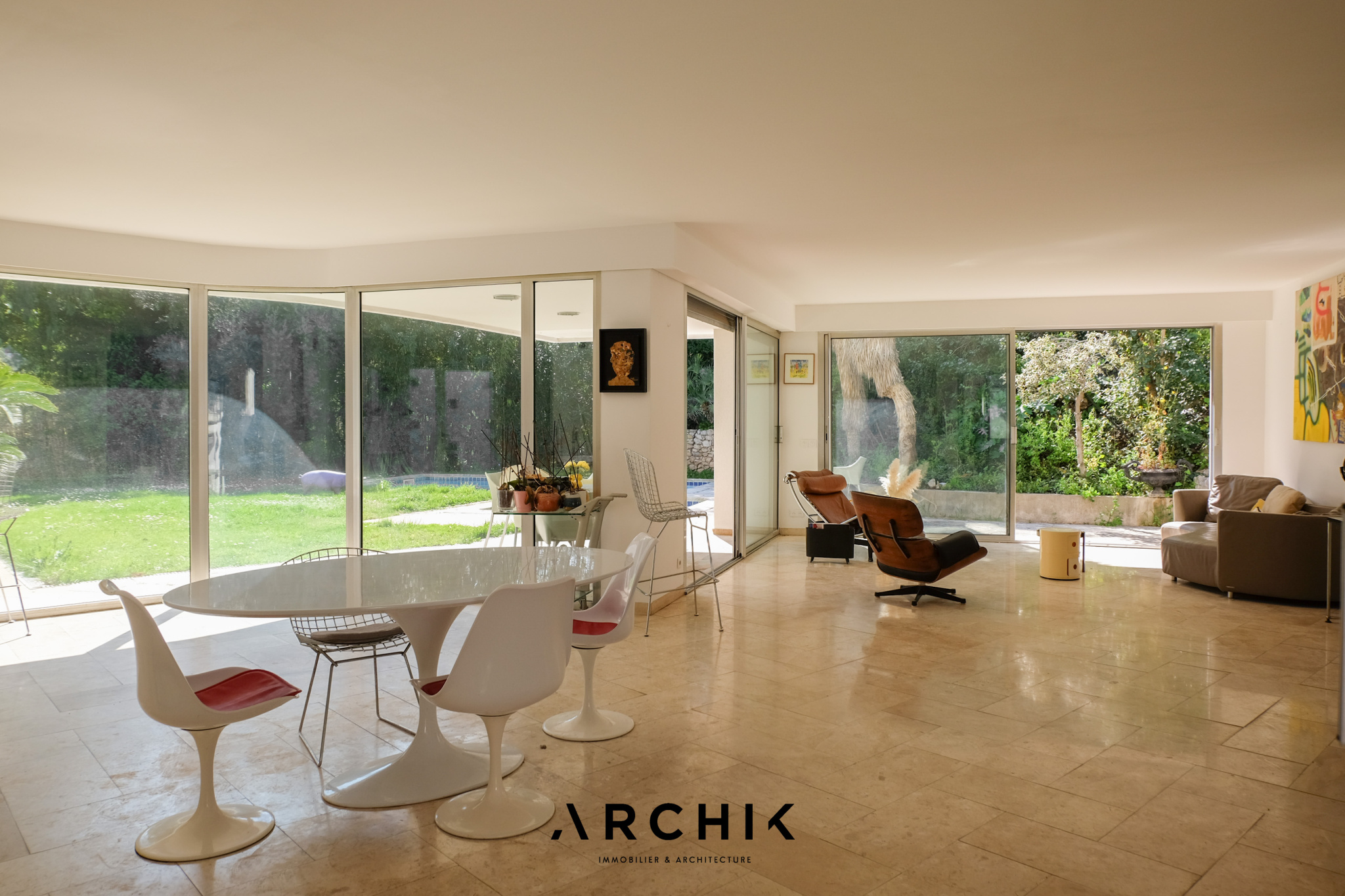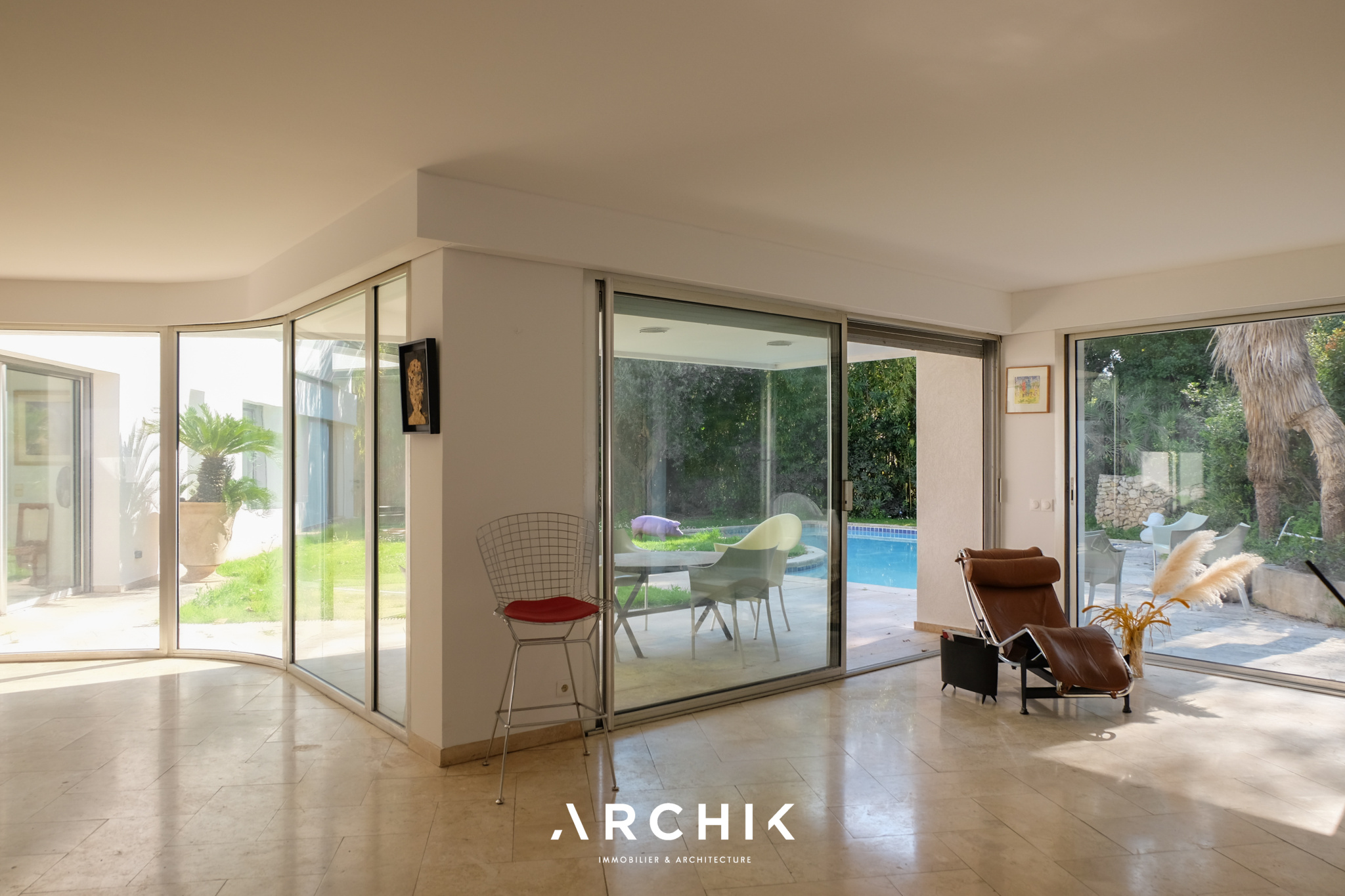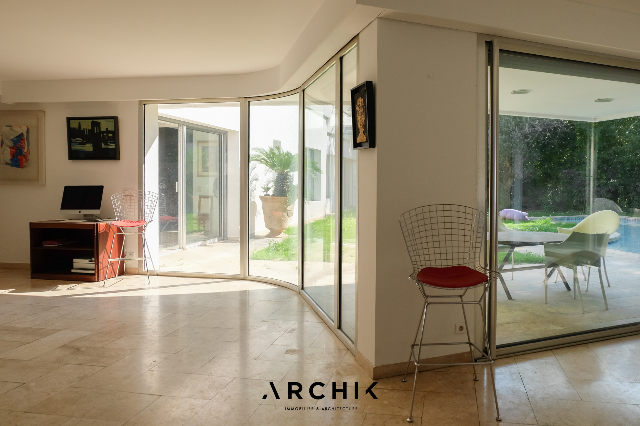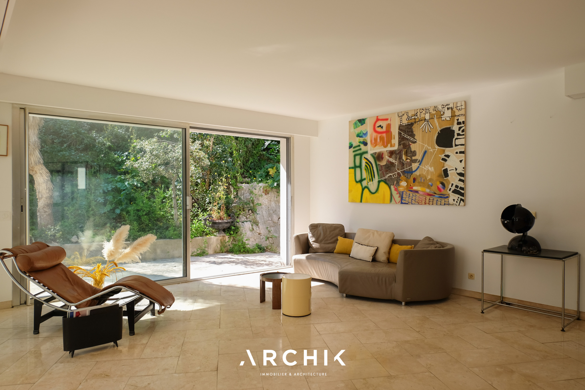 Un escalier en béton brut mène élégamment à l'entrée de l'appartement. La pièce de vie aux volumes décloisonnés donne le ton avec son sol en marbre légèrement veiné et ses murs entièrement vitrés qui inondent les volumes d'une lumière du Sud et floutent les frontières entre l'intérieur et l'extérieur. En arrière-plan, une généreuse cuisine immaculée s'intègre subtilement à l'espace de vie. Ouverte sur l'extérieur, elle capte la lumière et se prolonge par une arrière-cuisine.