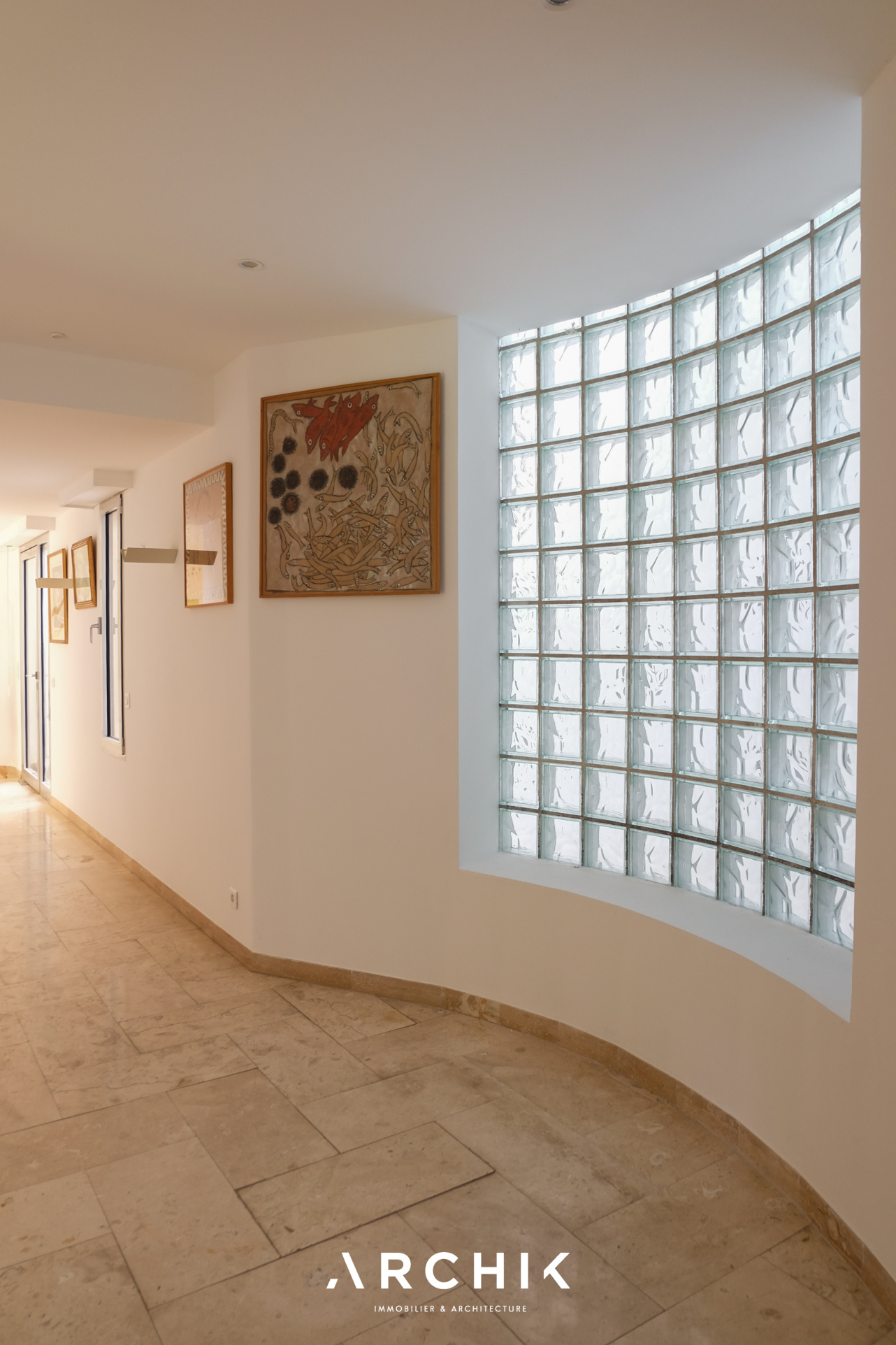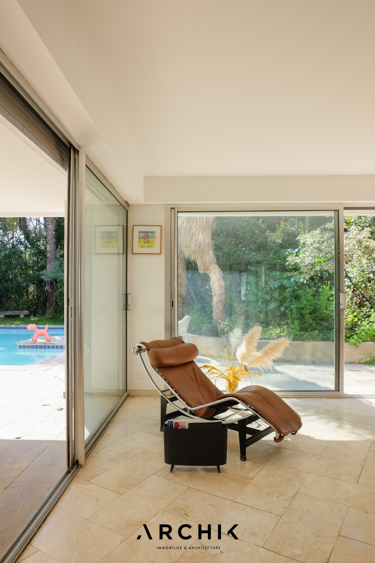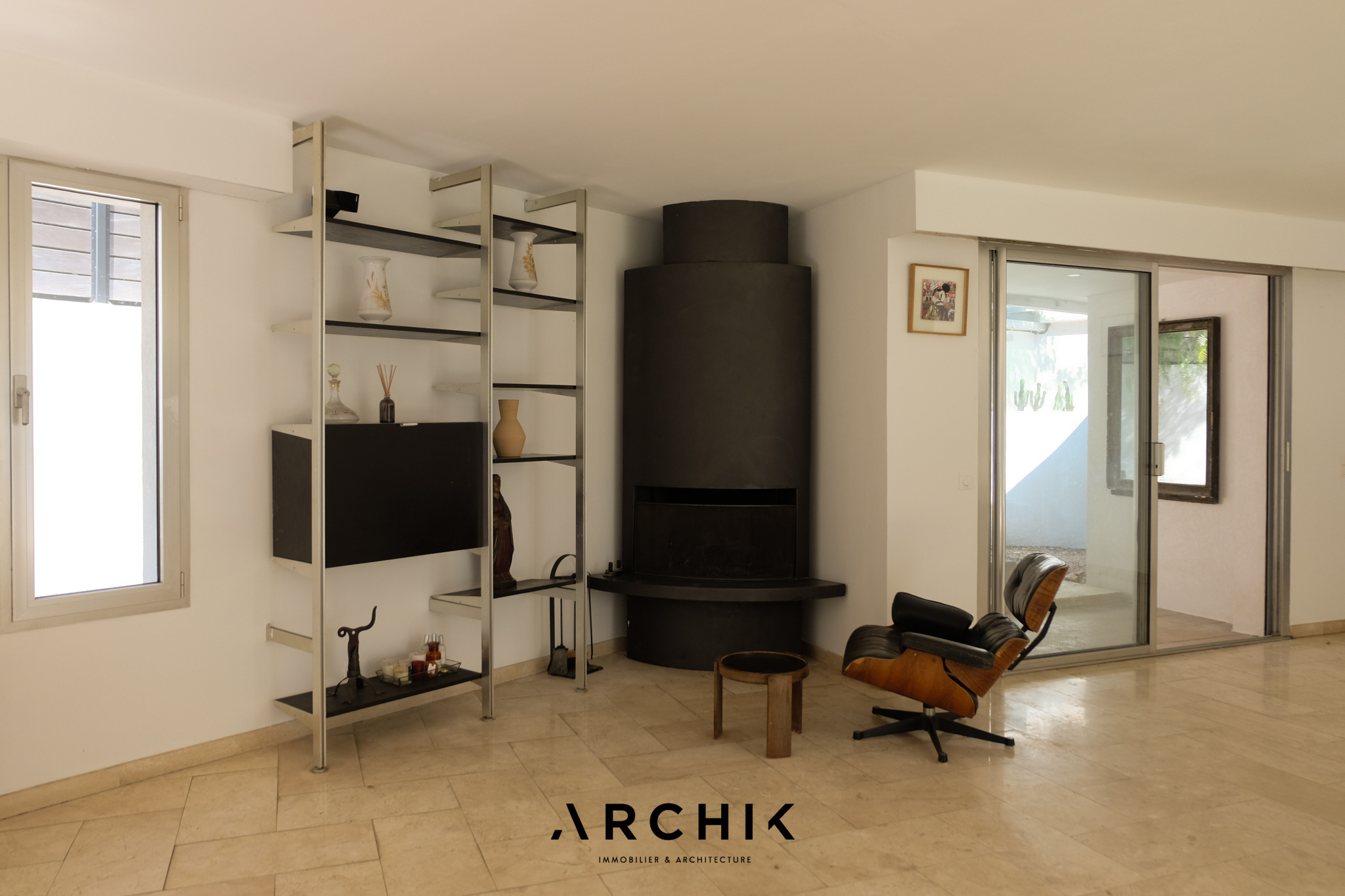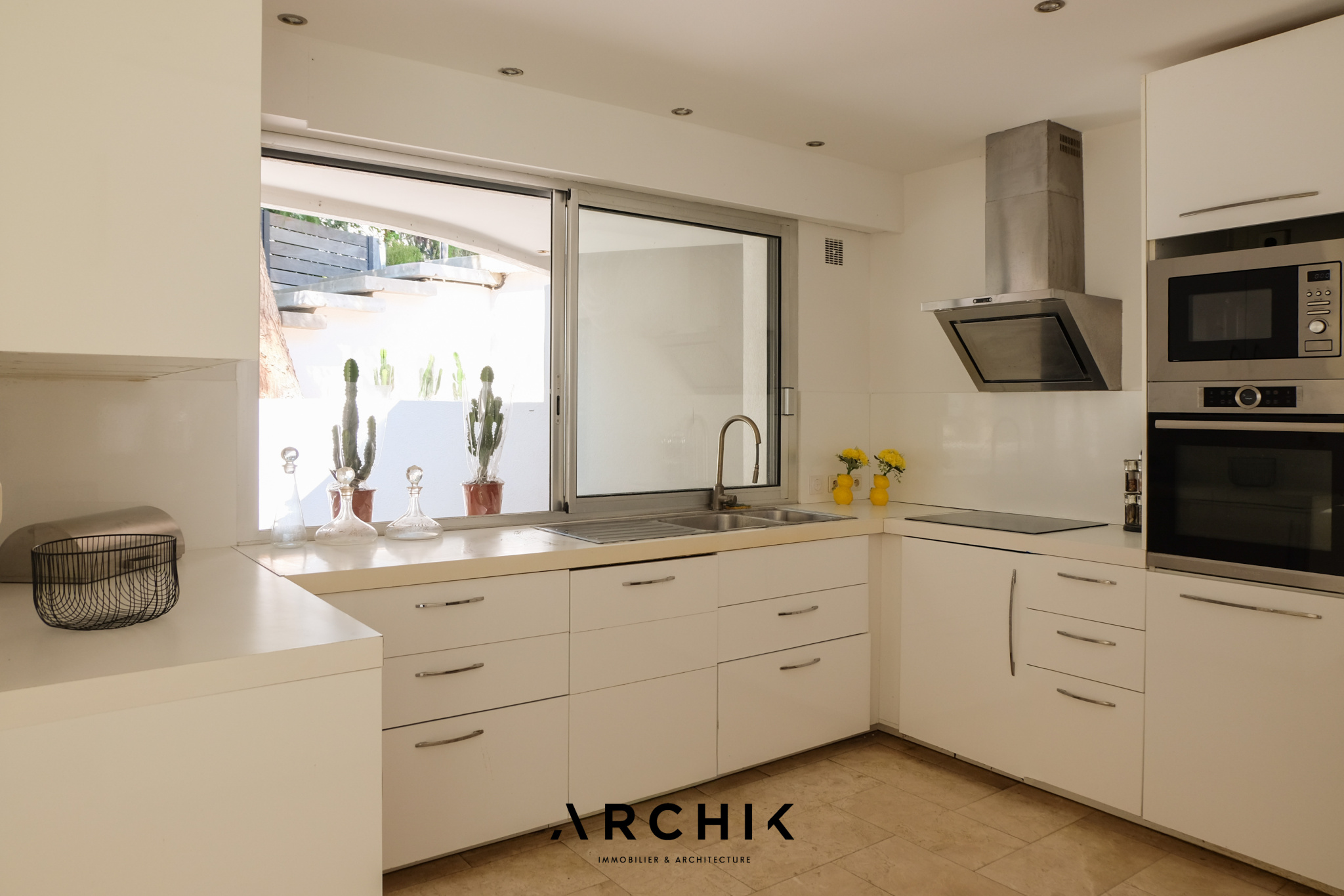 Un escalier en béton brut mène élégamment à l'entrée de l'appartement. La pièce de vie aux volumes décloisonnés donne le ton avec son sol en marbre légèrement veiné et ses murs entièrement vitrés qui inondent les volumes d'une lumière du Sud et floutent les frontières entre l'intérieur et l'extérieur. En arrière-plan, une généreuse cuisine immaculée s'intègre subtilement à l'espace de vie. Ouverte sur l'extérieur, elle capte la lumière et se prolonge par une arrière-cuisine.