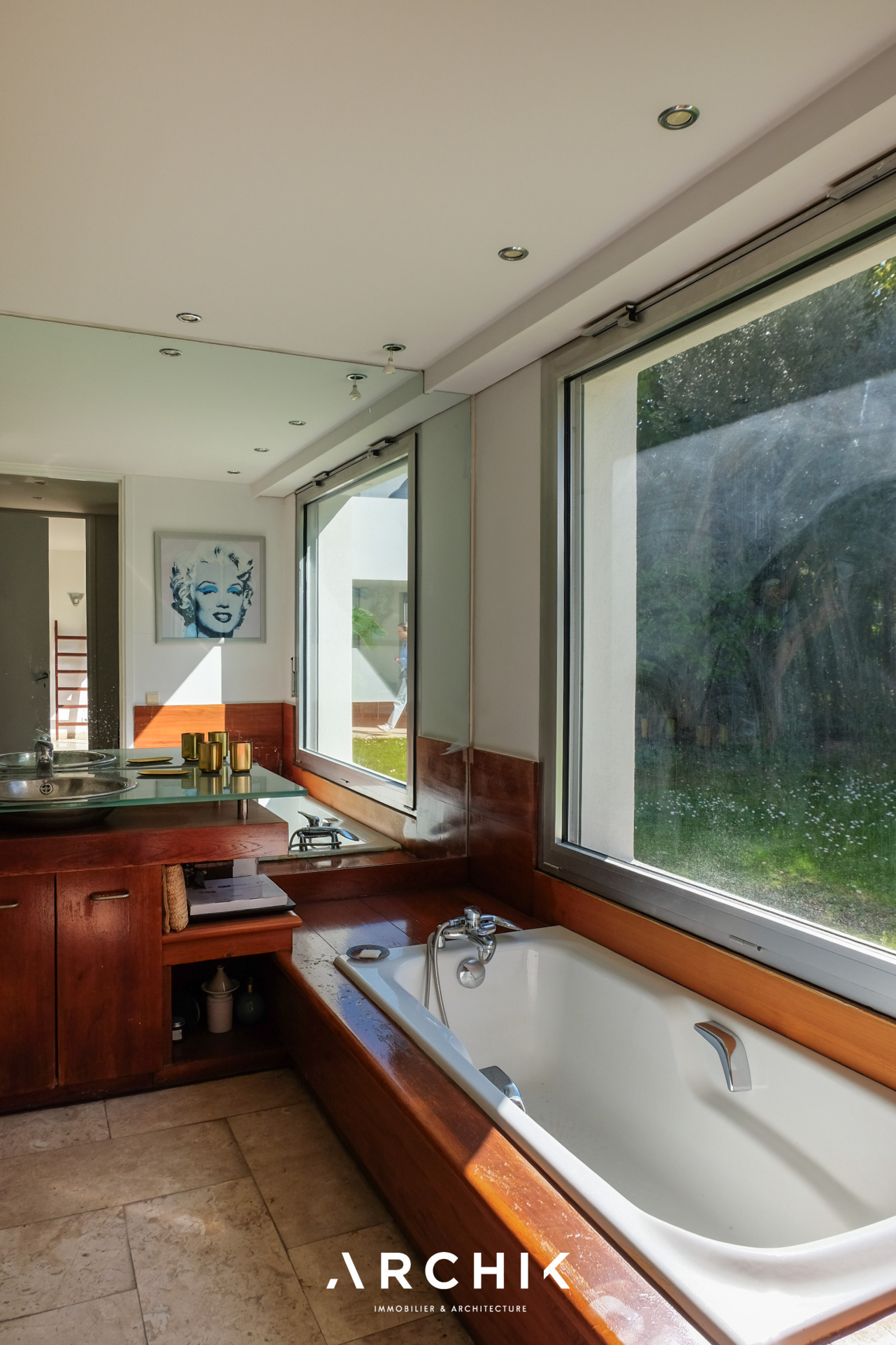 Le coin nuit bénéficie de la même relation privilégiée à l'extérieur. Une première suite bénéficie d'un large dressing et d'une salle de bain habillée de bois exotique. Plus loin, un deuxième espace accueille un bureau, une salle de bain en marbre ainsi que deux chambres. Un grand cellier de rangement ainsi que deux places de stationnement viennent compléter ce bien.