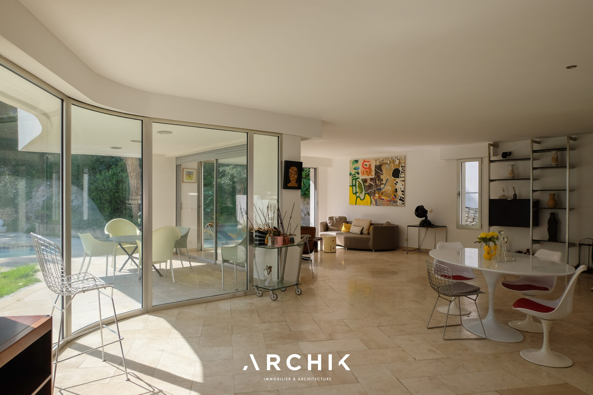 Construite en 1996 par l'architecte Bernard BAR, la villa développe une écriture moderniste, où les lignes, les transparences et la relation au paysage structurent l'espace. A mettre en lumière, l'appartement en rez-de jardin répond aux mêmes principes : débords de toiture et pans vitrés rythment son architecture extérieure, tandis qu'à l'intérieur, les lignes franches et courbes se répondent, définissant les espaces en connexion permanente avec le jardin.