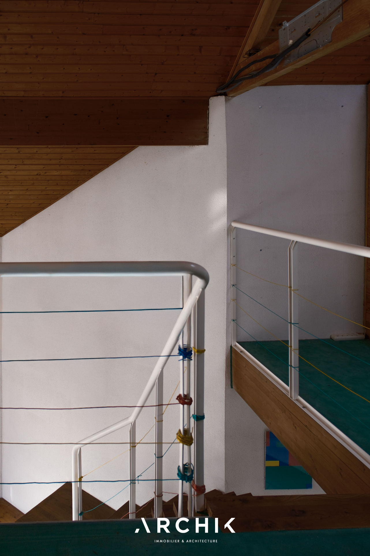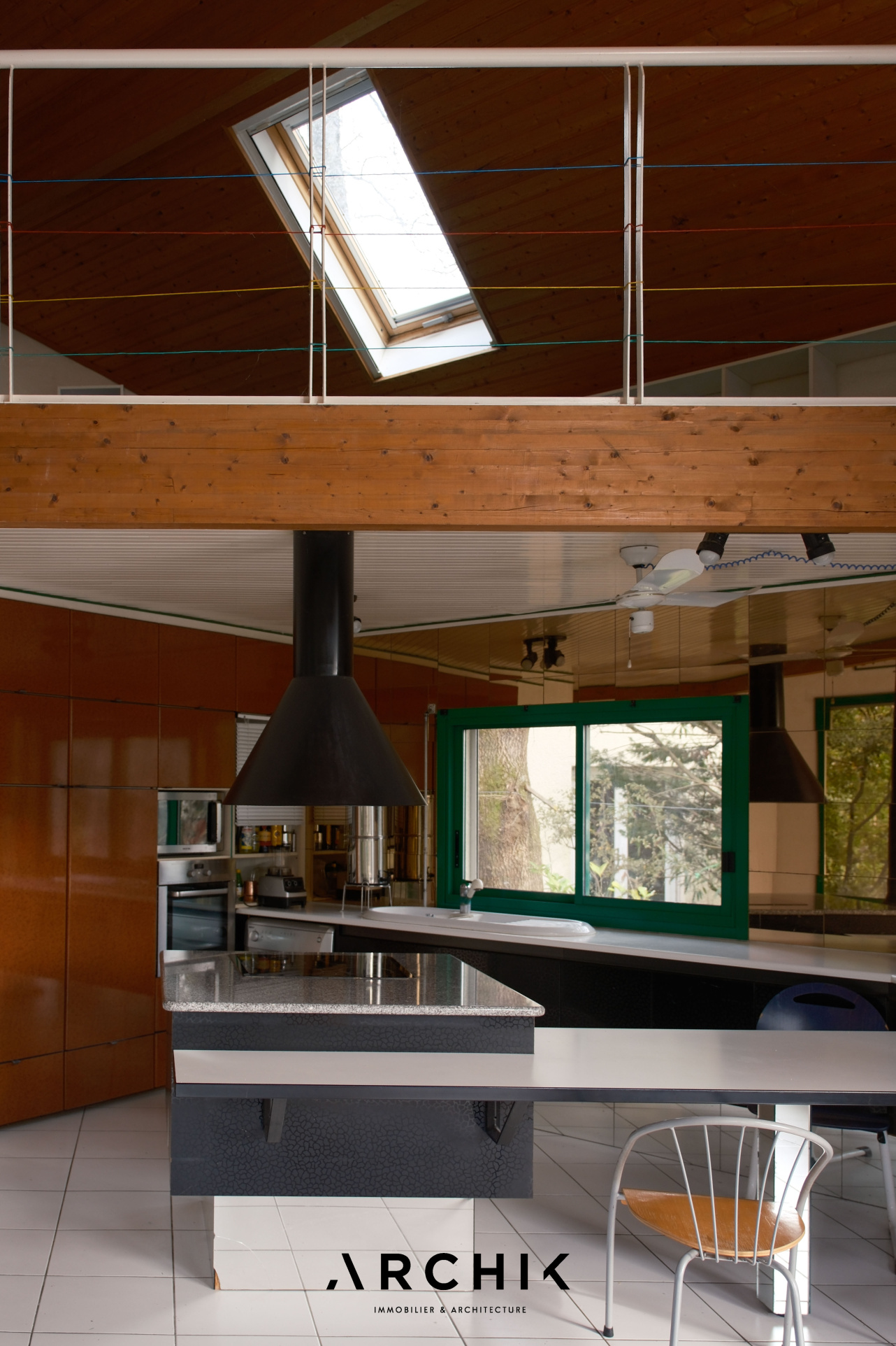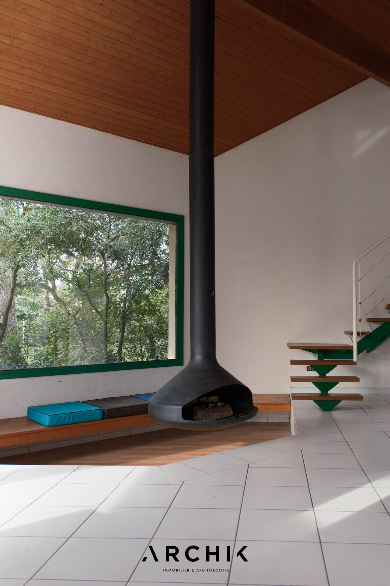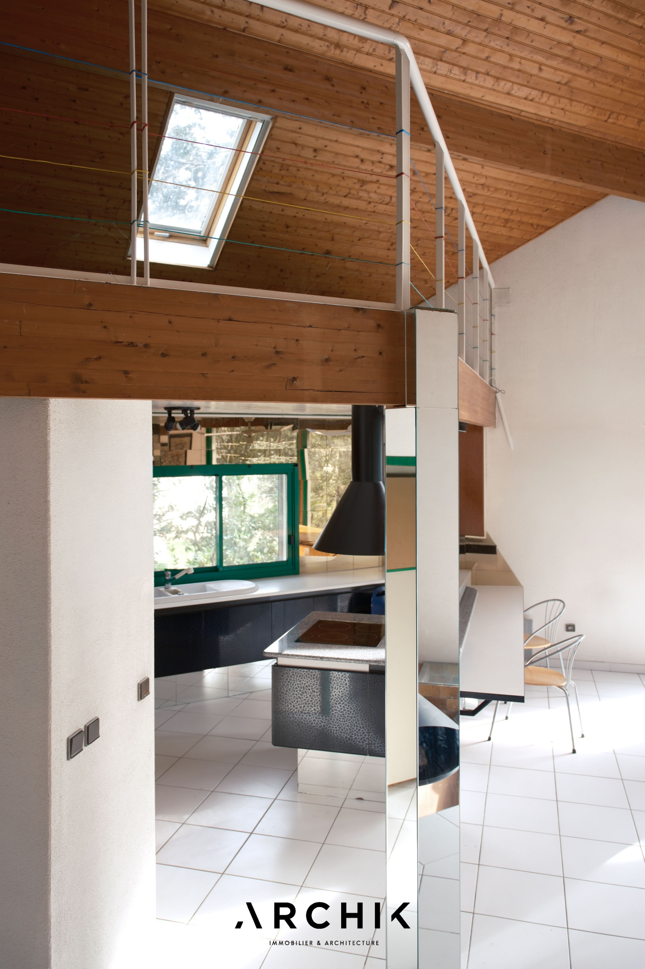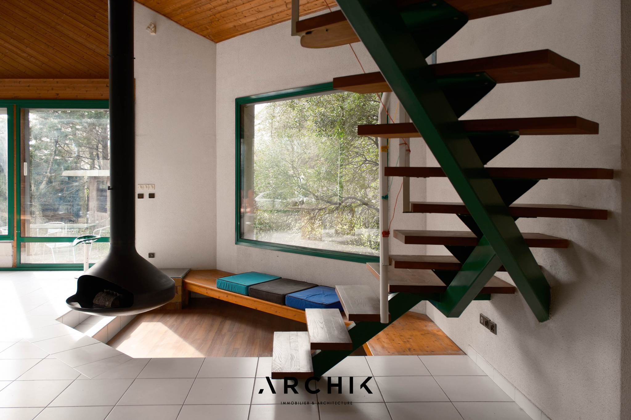 À proximité du coin feu, un escalier au limon central en métal thermolaqué vert et aux marches en orme mène à une vaste mezzanine surplombant le salon. Dans son prolongement, le volume permet plusieurs possibilités d'aménagement ; chambres supplémentaires, salle d'eau, bureau, offrant une grande liberté d'usage.