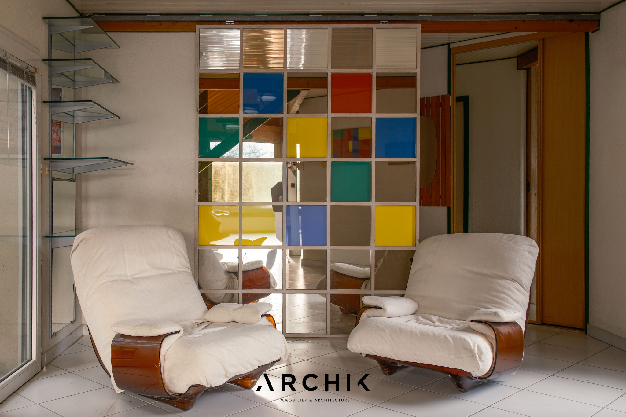 Le plan s'organise autour de deux polygones reliés par une entrée centrale prolongée d'un espace bureau, véritable pivot entre les espaces de jour et de nuit. Un rangement aux façades vitrées colorées forme une paroi translucide qui accompagne la découverte de la pièce de vie.