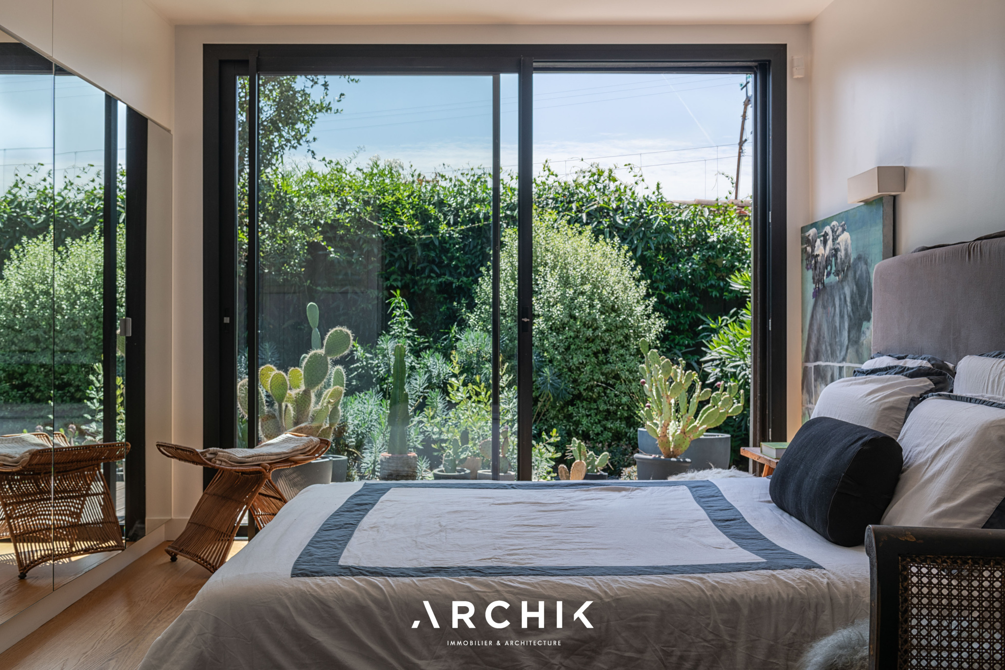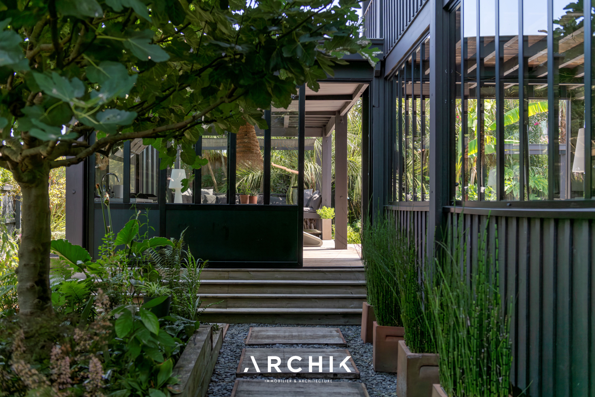 Architecture inspirée des cabanes ostréicoles omniprésentes dans un quartier préservé et authentique du Bassin, cette maison de 255 m2 se situe sur un terrain de 993 m2 à l'abri des regards. Sur deux niveaux, insoupçonnable depuis la rue, cette demeure au coeur d'un luxuriant jardin offre un cadre idyllique jouxtant le sentier du littoral et le port pittoresque de Meyran.