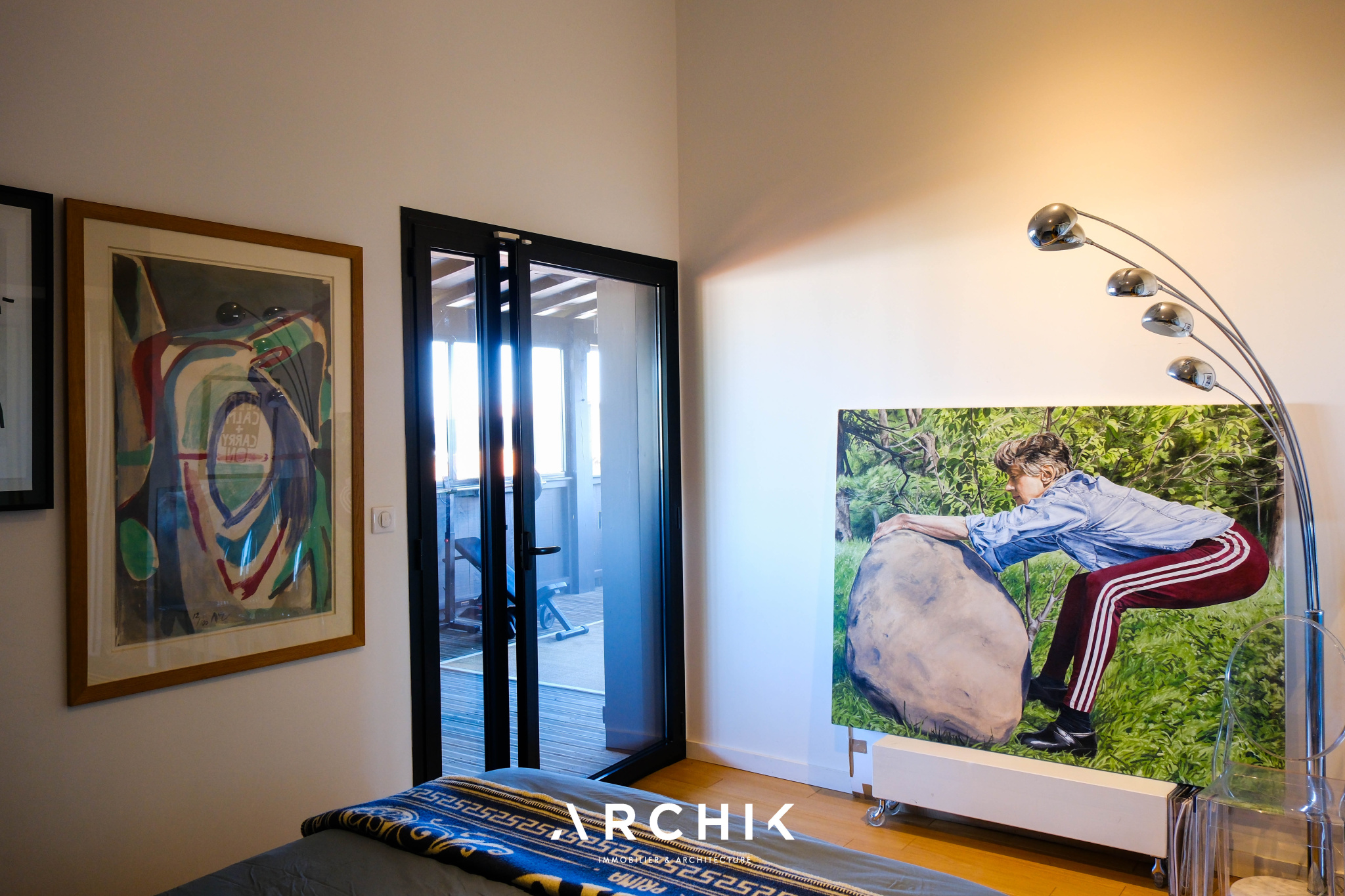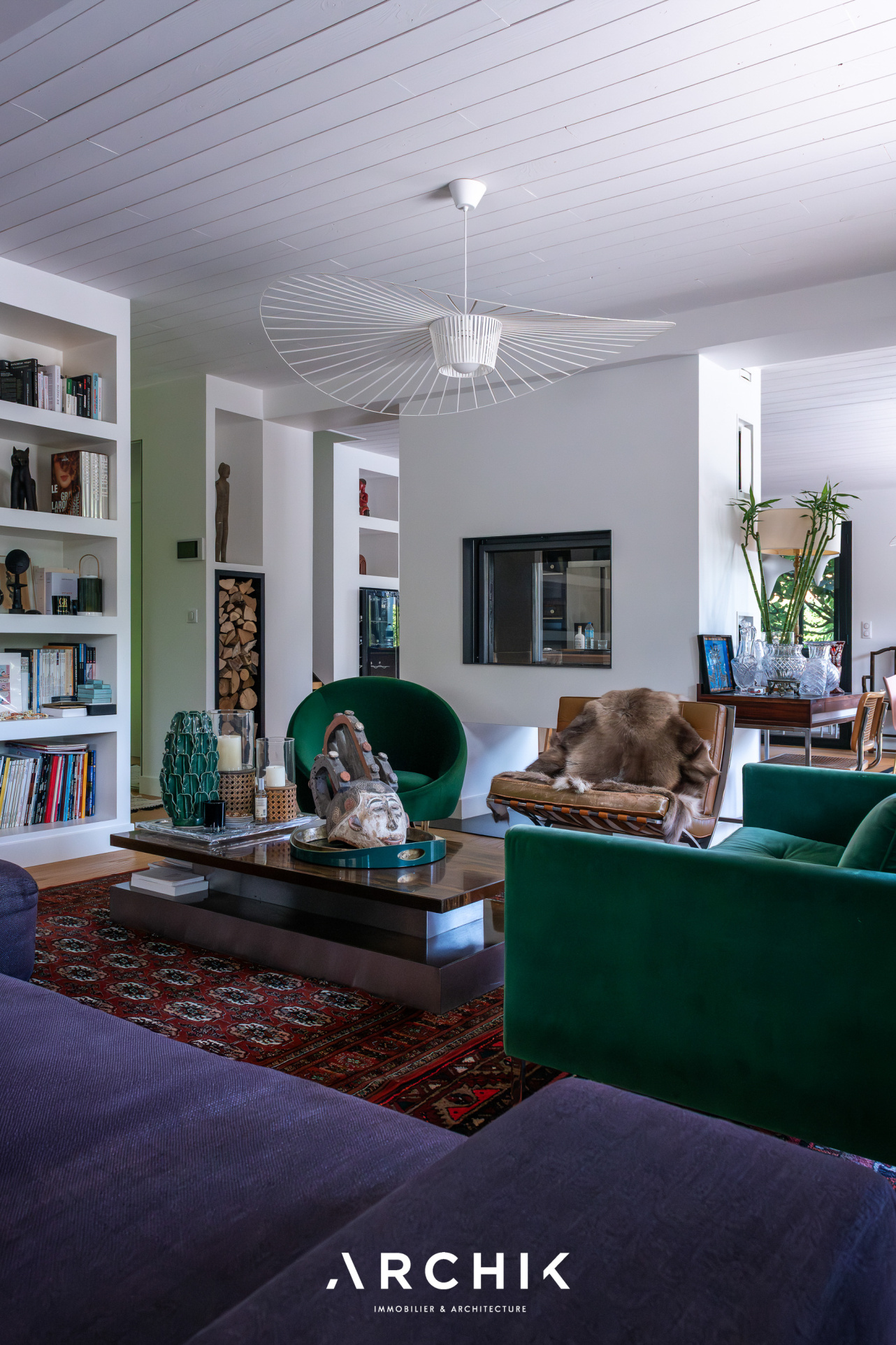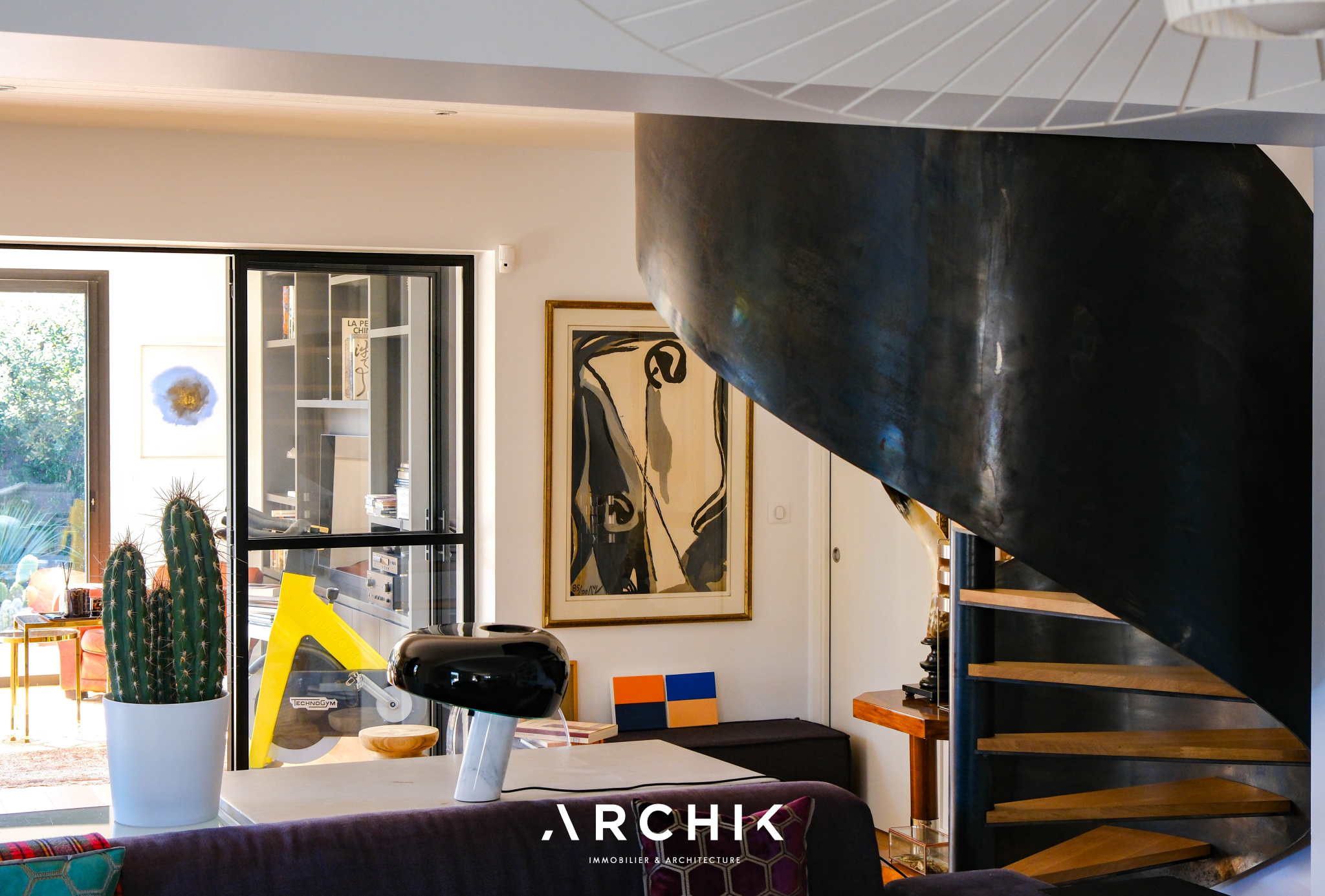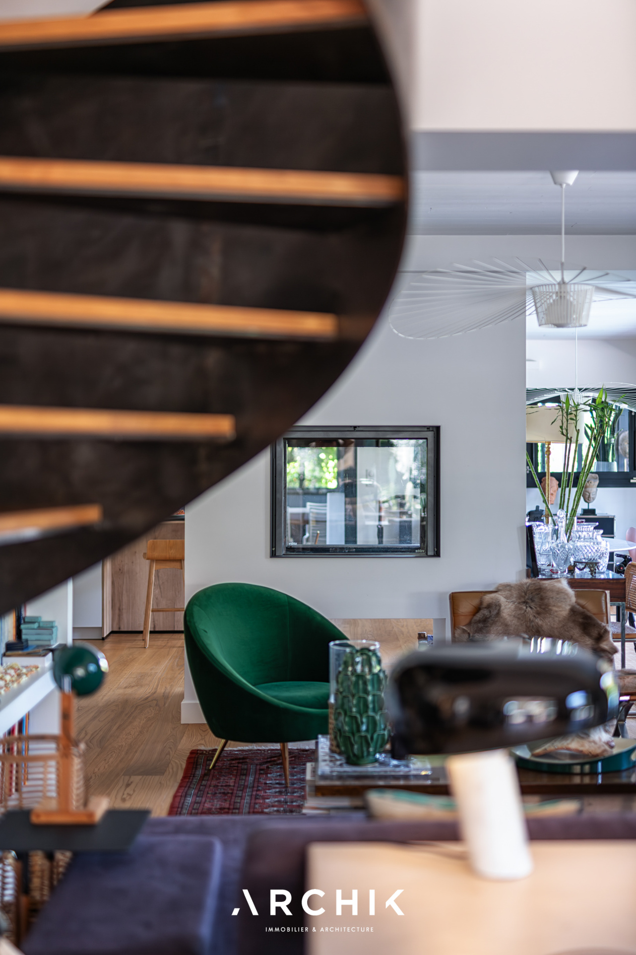A l'intérieur, la pièce à vivre est une succession d'espaces permettant à la fois convivialité et intimité, interrompus simplement par la cheminée traversante et l'élégante verrière amovible. Les parquets et les murs blancs constituent un écrin idéal pour faire ressortir des éléments remarquables comme le spectaculaire escalier ruban en métal, la bibliothèque sur mesure ou encore des pièces de mobilier design. Les nombreuses baies vitrées contribuent à laisser entrer la nature dans l'habitat. Les cinq chambres disposant chacune de leur salle d'eau dont une au rez-de-jardin en font un lieu familial. Celles de l'étage ouvrent sur une coursive offrant de belles vues sur le port et le Bassin.