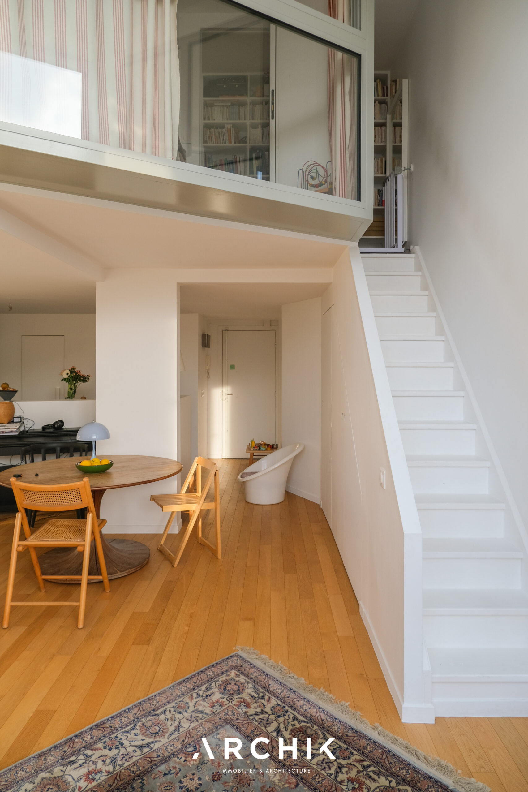 Réaménagé en 2021, ce duplex est pensé autour de la lumière et des volumes. Dès l'entrée, le regard est happé par la hauteur sous plafond et les grandes baies vitrées tout hauteur, qui ouvrent l'espace vers le ciel et les frondaisons alentour. La lumière d'Ouest circule librement d'un niveau à l'autre, révélant une distribution fluide. Le premier niveau accueille une pièce de vie chaleureuse et décloisonnée, où le bois clair du parquet dialogue avec la blancheur des murs et la douceur des textiles. Le séjour s'organise autour des larges fenêtres en angle, véritables cadres panoramiques sur la ville, tandis que la cuisine ouverte, en retrait, compose un espace convivial, propice aux moments partagés.
