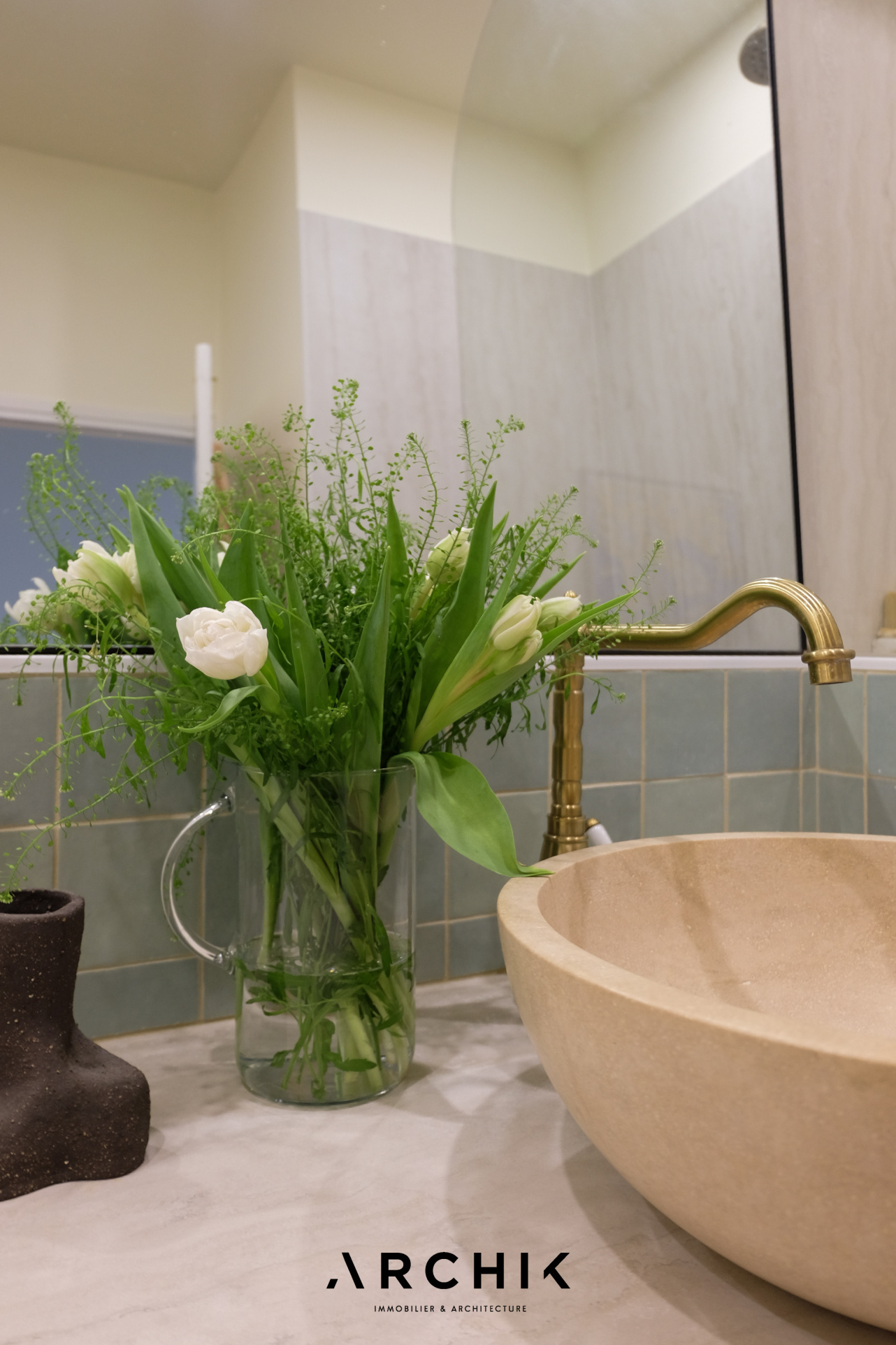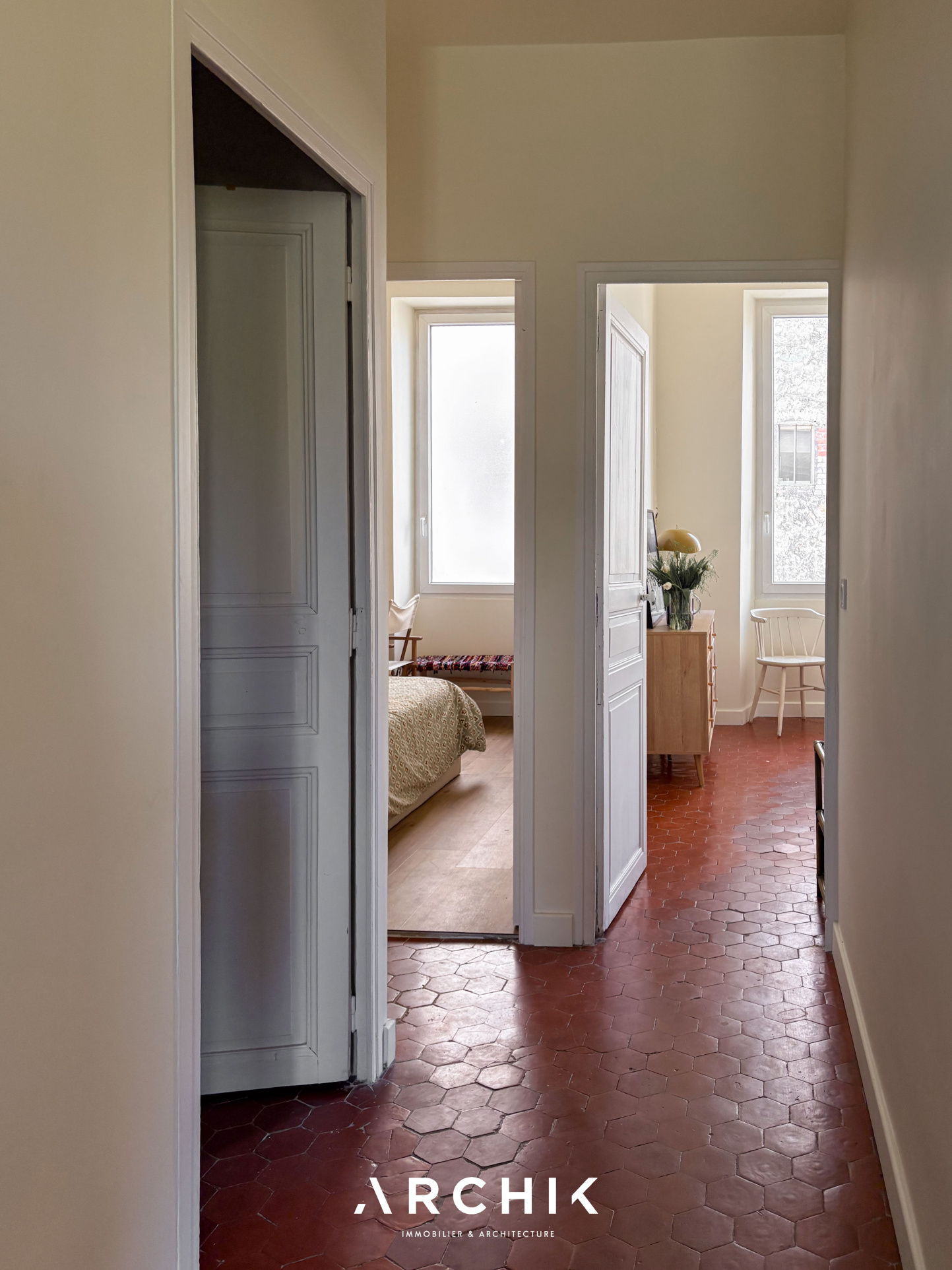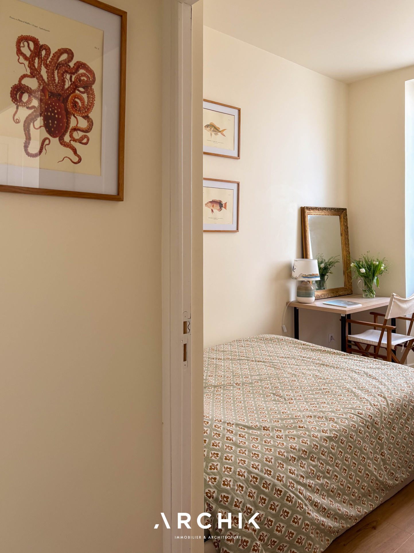 Côté nuit, deux chambres lumineuses composent un ensemble harmonieux, complété par un bureau ouvert sur le séjour, modulable selon les besoins. La salle d'eau, entièrement maçonnée, reprend les tonalités de la cuisine avec ses faïences vertes, apportant cohérence et caractère à l'ensemble.