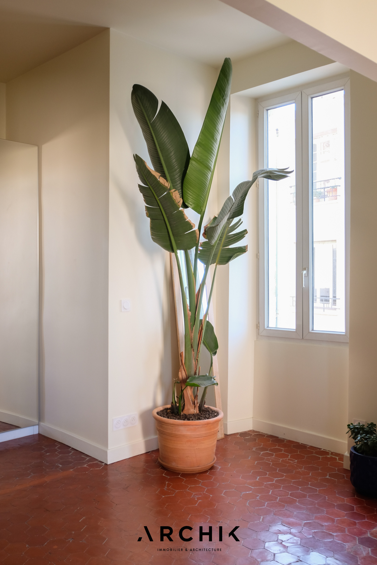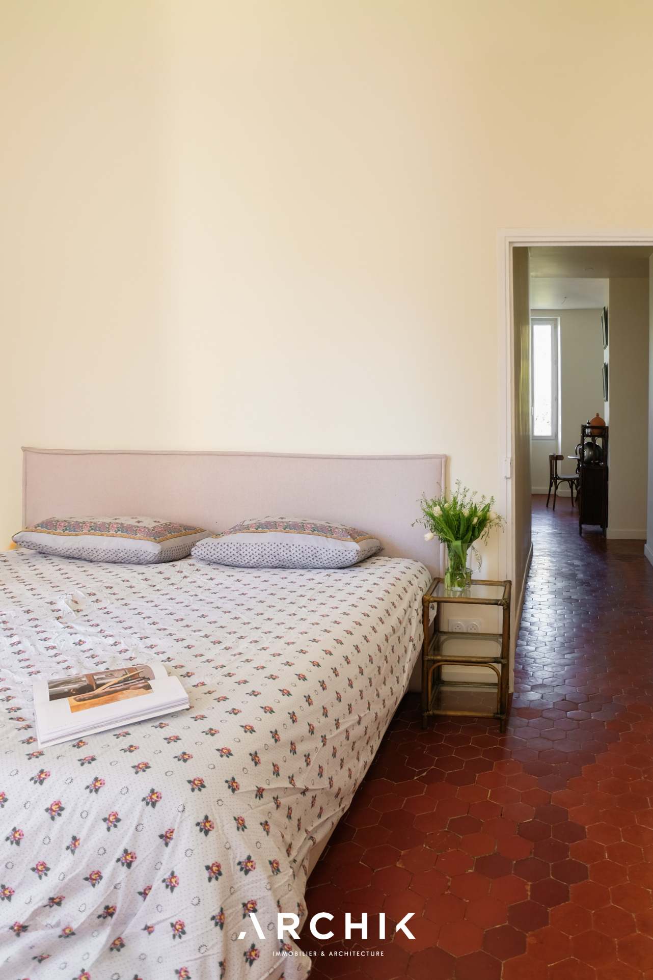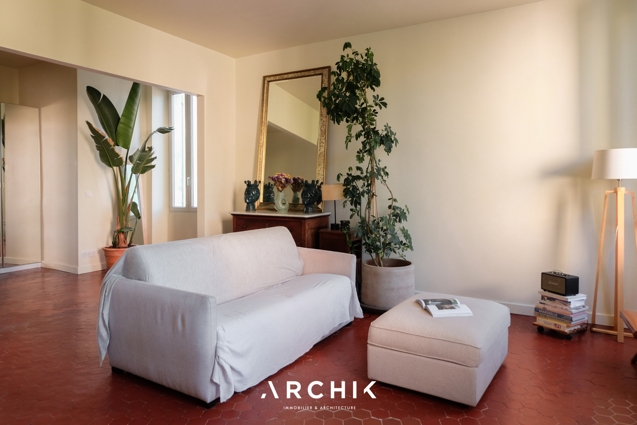 Architecture du XXème siècle, cet immeuble typique du quartier d'Endoume abrite en son 3e et dernier étage un appartement traversant de 81 m2 offrant une vue dégagée sur les toits et le bleu du ciel marseillais.