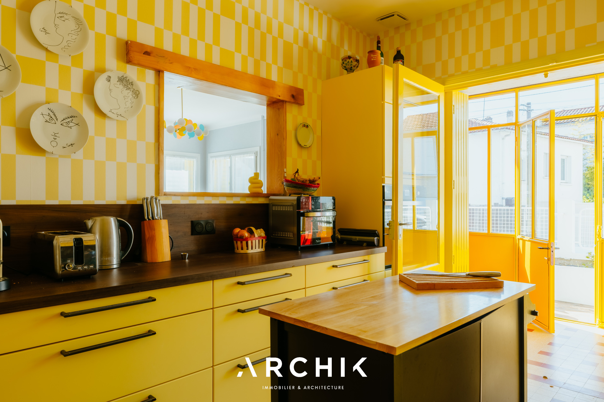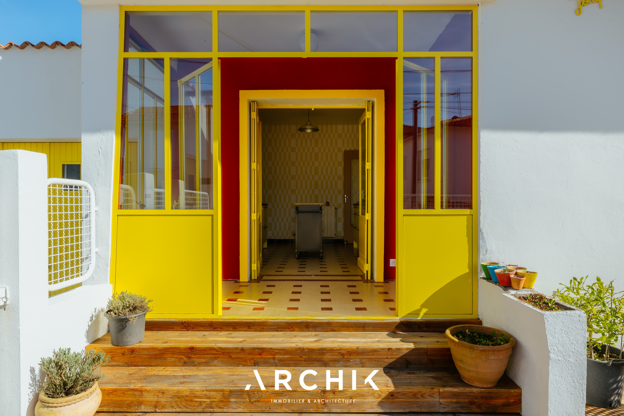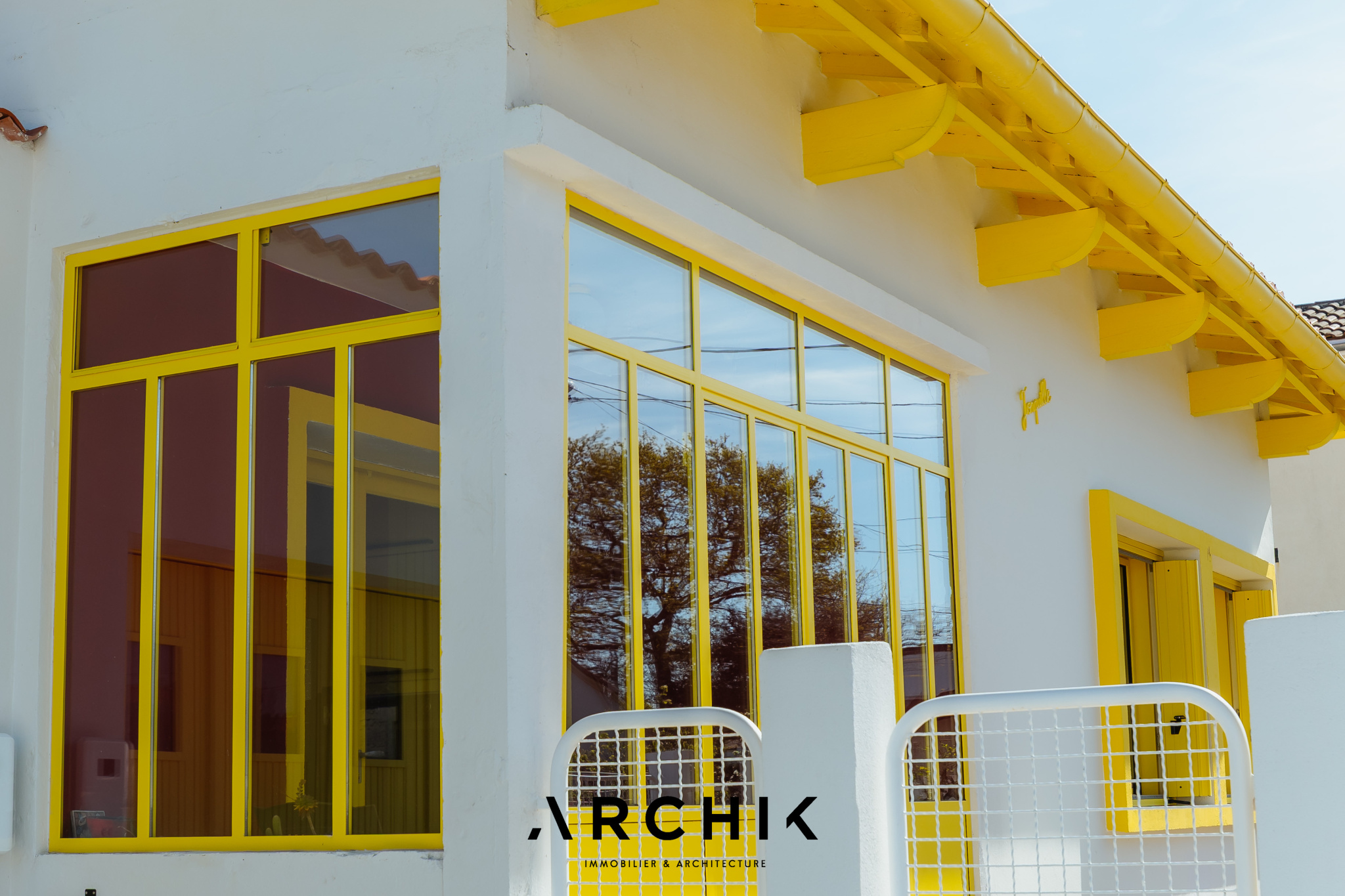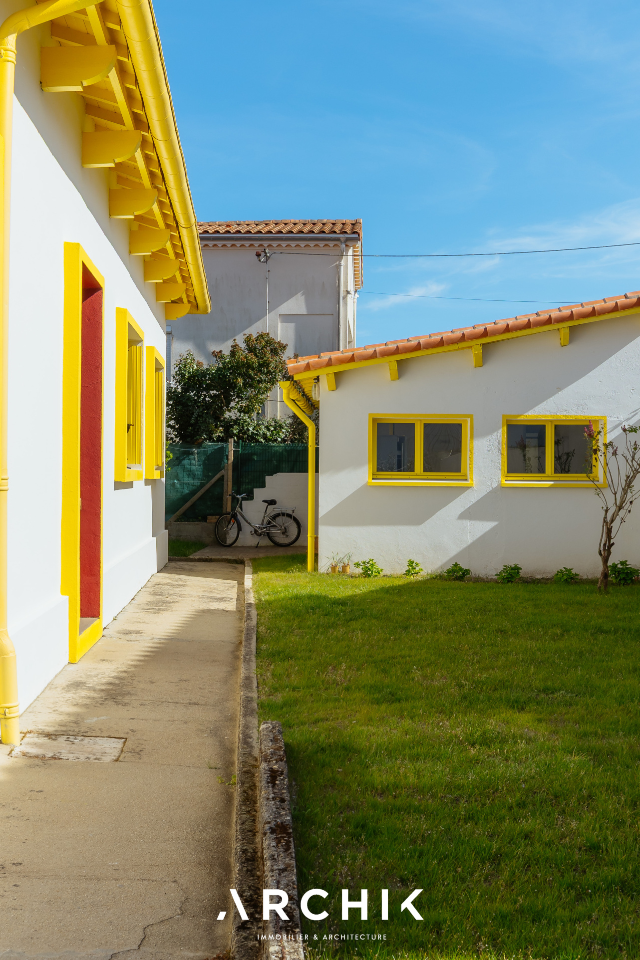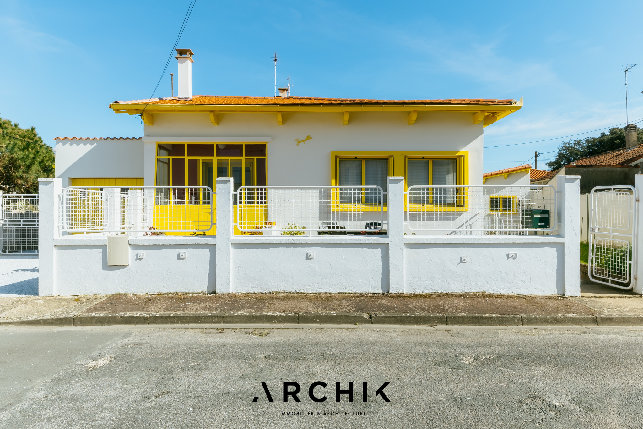 Composé d'une maison principale et de trois dépendances, cet ensemble entièrement réhabilité fait preuve d'audace chromatique en reprenant les teintes franches de la palette de couleurs utilisées lors de la construction en 1967 : Jaune Zinc, Blanc Pur et quelques touches Rouge de Sécurité. Une importante succession de fenêtres anime les façades. Chaque ouverture s'inscrit dans un encadrement venant en surépaisseur sur la paroi, créant du relief sur le lisse et une ombre portée. La verrière en métal venant fermer la loggia affirme la personnalité de la maison. Passé le contraste de couleur du porche et sa porte ré éditée, le graphisme du carrelage d'origine en grès cérame jaune porphyre rythme l'entrée, le dégagement et la cuisine qui s'ouvre largement sur la loggia. La tapisserie « Diner » à damier jaune et blanc de la collection Milano Sixties incite à la créativité culinaire. Elle met en valeur une jolie collection d'assiettes dessinée par Jean Cocteau. Communiquant avec la cuisine, le séjour n'est que chaleur et soleil : parquet blond et cheminée d'époque en briquettes, multiples ouvertures laissant amplement traverser la lumière et enfin un panoramique « Boca Chica » de Montecolino aux accents solaires. Les trois chambres de la partie nuit ont chacune une identité marquée par leur papier peint aux motifs gais et géométriques. L'une d'entre elle est organisée en suite avec dressing et salle d'eau privatifs. Une salle de bain au sol effet terrazzo complète cette partie. Trois studios autonomes peuvent augmenter la capacité d'accueil de la maison ou offrir de multiples possibilités, telles qu'atelier d'artiste, salle de loisirs ou activité professionnelle. L'ensemble est généreusement ouvert sur le jardin ponctué de plusieurs terrasses permettant de suivre la course du soleil. Une remarquable clôture recréée à l'identique protège les accès. Un garage attenant et un espace de stationnement invitent à rejoindre les commerces à proximité immédiate et le marché central à pied.