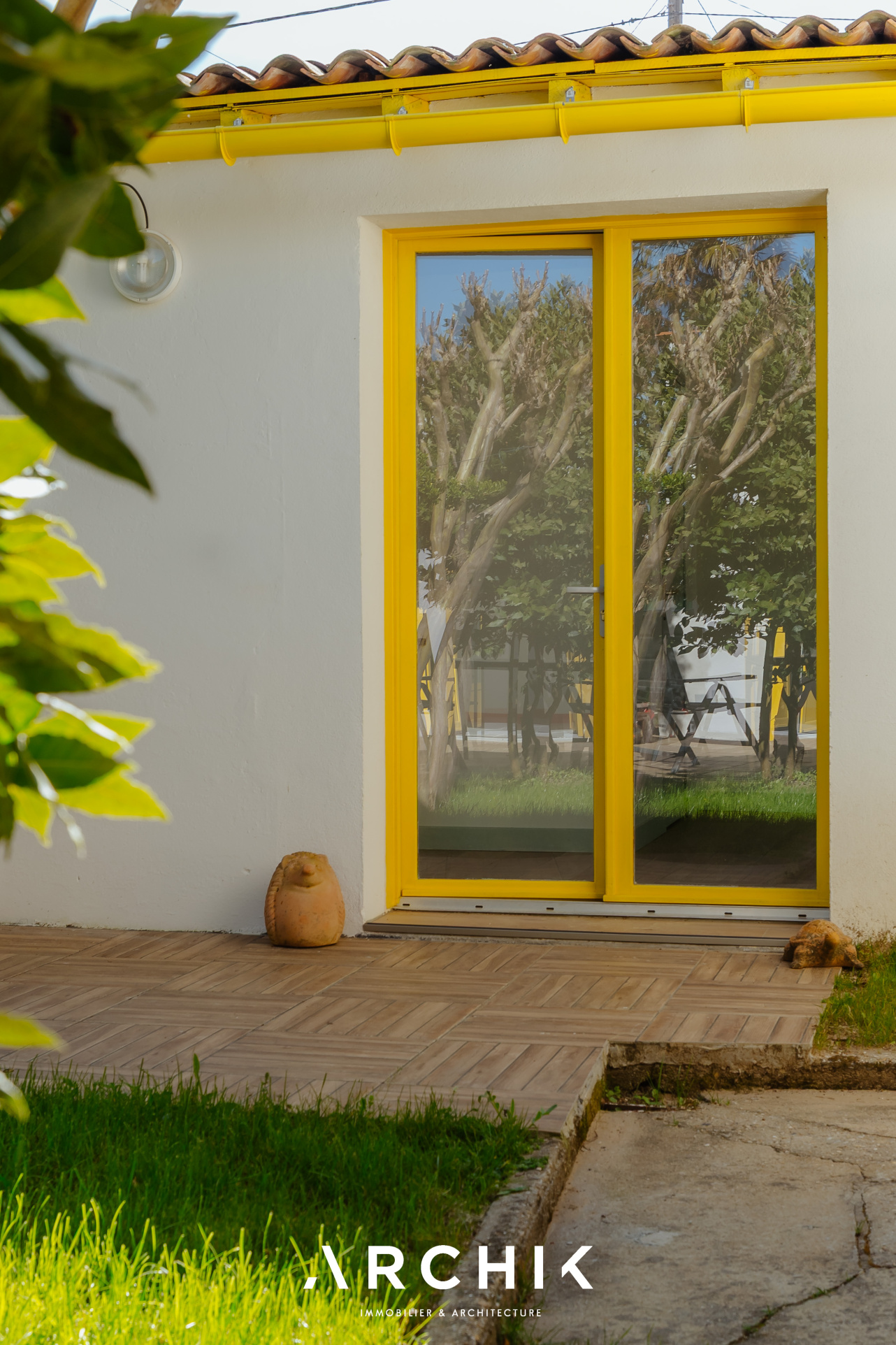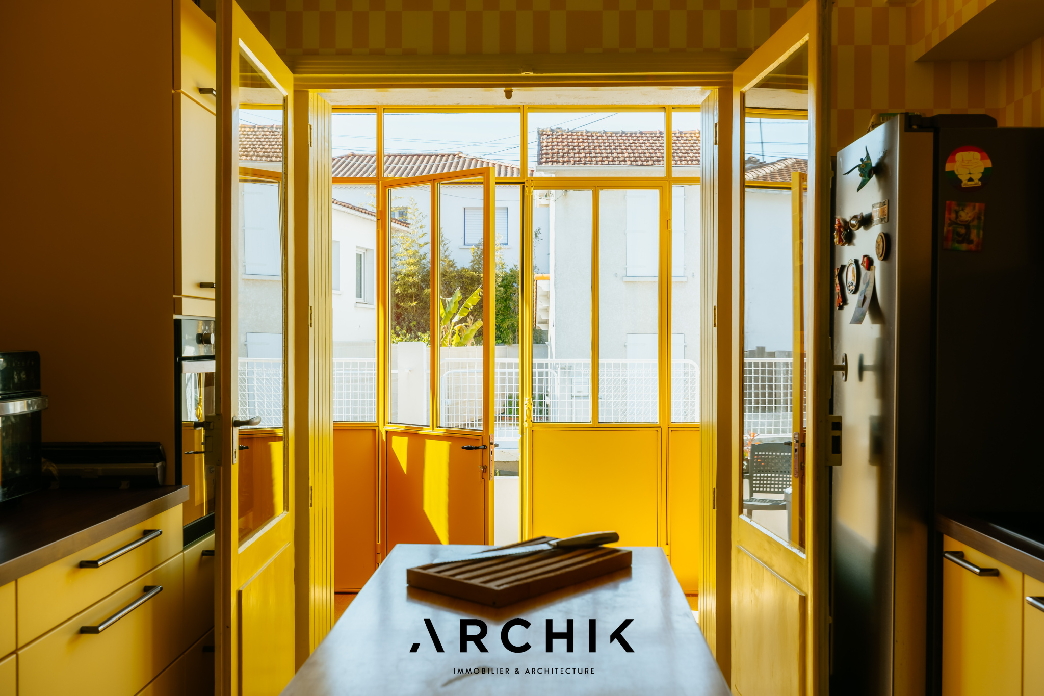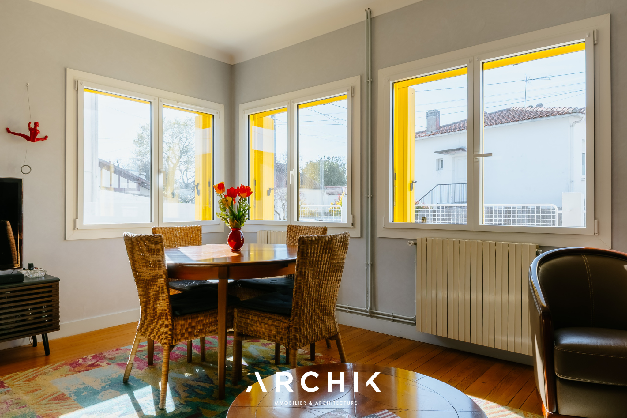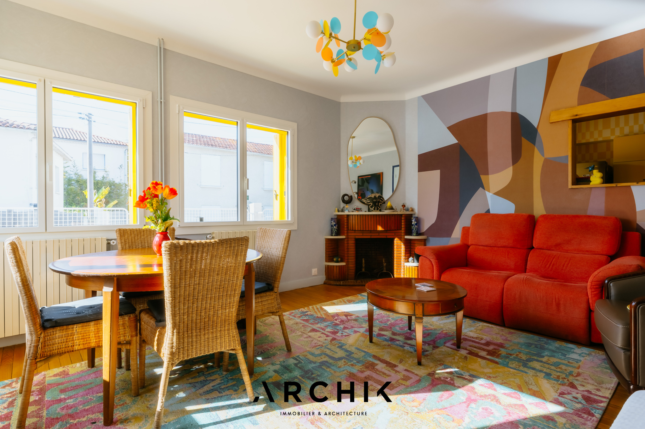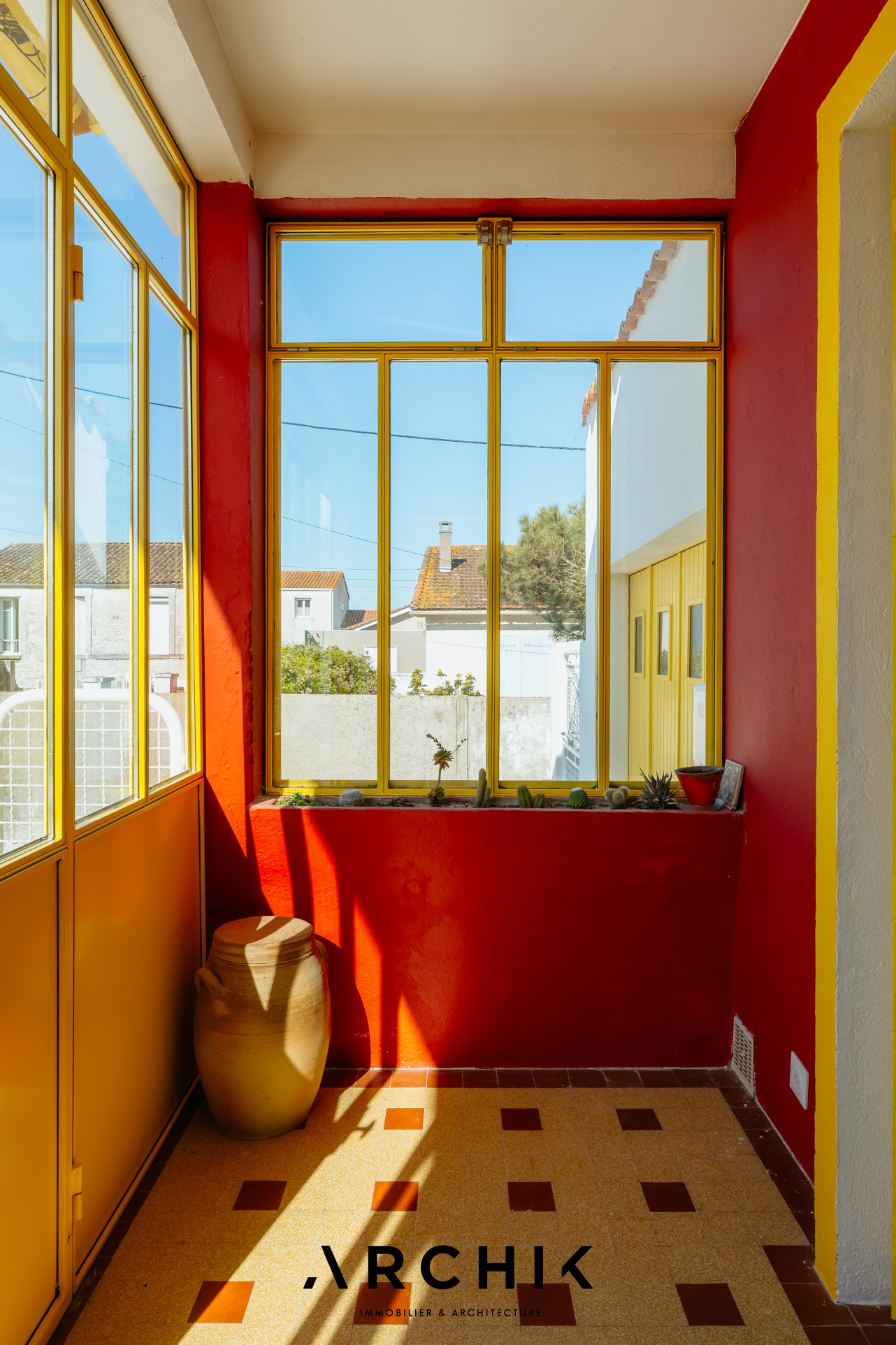 Composé d'une maison principale et de trois dépendances, cet ensemble entièrement réhabilité fait preuve d'audace chromatique en reprenant les teintes franches de la palette de couleurs utilisées lors de la construction en 1967 : Jaune Zinc, Blanc Pur et quelques touches Rouge de Sécurité. Une importante succession de fenêtres anime les façades. Chaque ouverture s'inscrit dans un encadrement venant en surépaisseur sur la paroi, créant du relief sur le lisse et une ombre portée. La verrière en métal venant fermer la loggia affirme la personnalité de la maison. Passé le contraste de couleur du porche et sa porte ré éditée, le graphisme du carrelage d'origine en grès cérame jaune porphyre rythme l'entrée, le dégagement et la cuisine qui s'ouvre largement sur la loggia. La tapisserie « Diner » à damier jaune et blanc de la collection Milano Sixties incite à la créativité culinaire. Elle met en valeur une jolie collection d'assiettes dessinée par Jean Cocteau. Communiquant avec la cuisine, le séjour n'est que chaleur et soleil : parquet blond et cheminée d'époque en briquettes, multiples ouvertures laissant amplement traverser la lumière et enfin un panoramique « Boca Chica » de Montecolino aux accents solaires. Les trois chambres de la partie nuit ont chacune une identité marquée par leur papier peint aux motifs gais et géométriques. L'une d'entre elle est organisée en suite avec dressing et salle d'eau privatifs. Une salle de bain au sol effet terrazzo complète cette partie. Trois studios autonomes peuvent augmenter la capacité d'accueil de la maison ou offrir de multiples possibilités, telles qu'atelier d'artiste, salle de loisirs ou activité professionnelle. L'ensemble est généreusement ouvert sur le jardin ponctué de plusieurs terrasses permettant de suivre la course du soleil. Une remarquable clôture recréée à l'identique protège les accès. Un garage attenant et un espace de stationnement invitent à rejoindre les commerces à proximité immédiate et le marché central à pied.