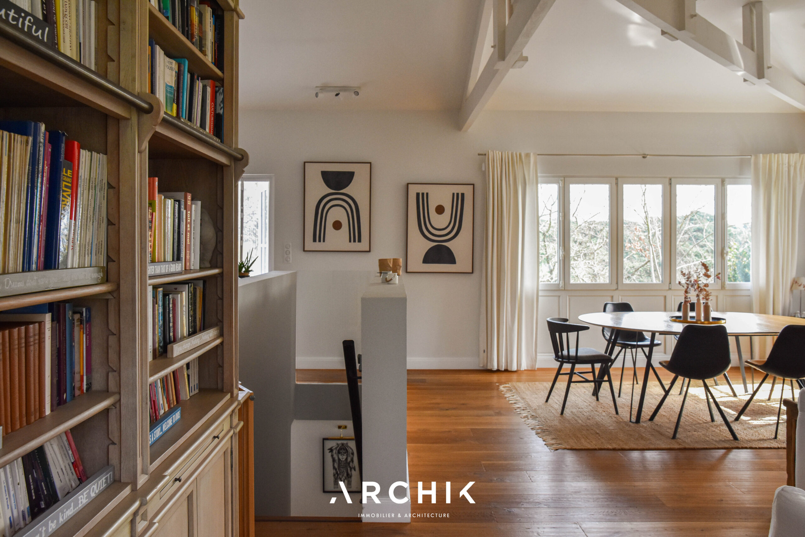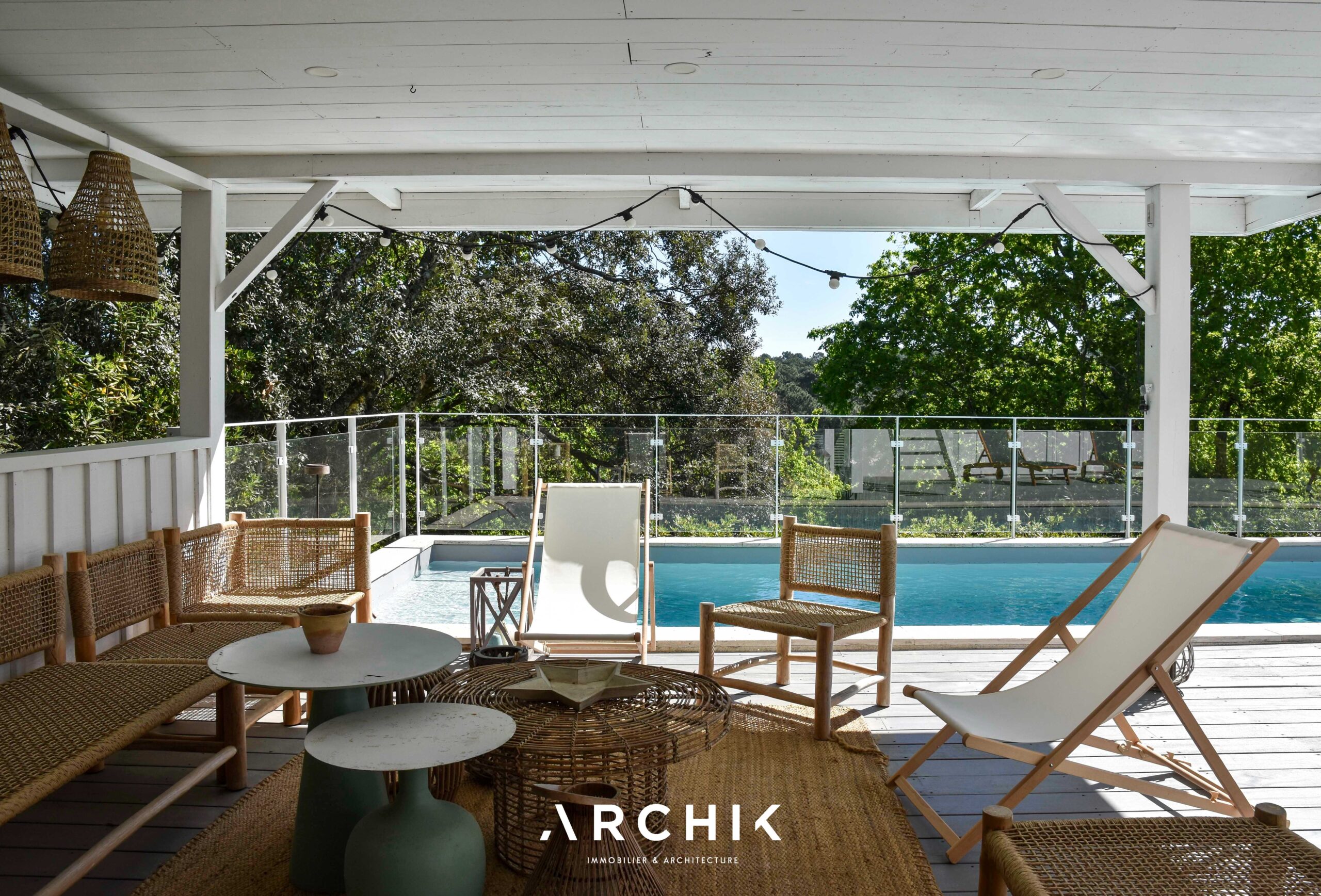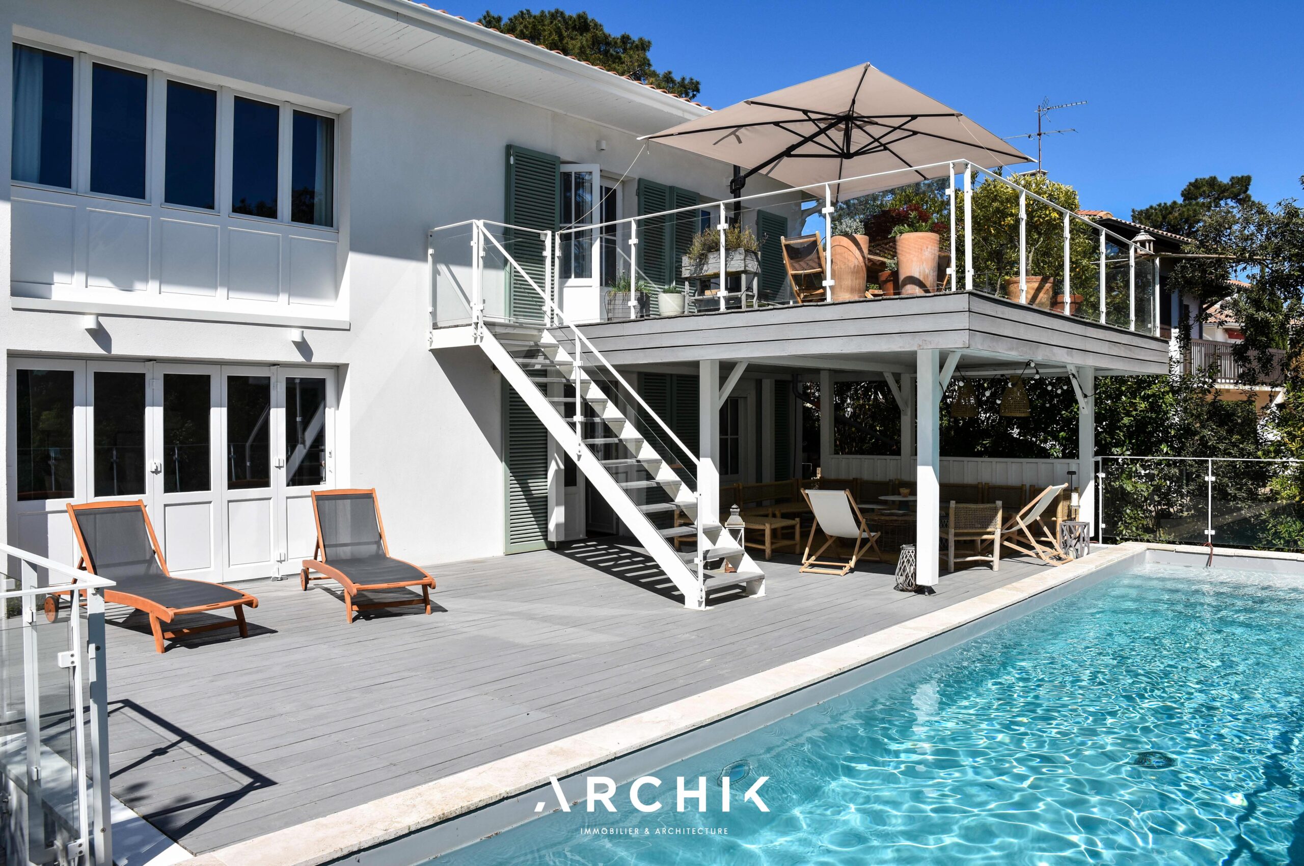 Rénovée en 2015 par l'agence d'architecture bordelaise Goldfinger, la maison adopte un plan inversé organisé sur deux niveaux, épousant la pente naturelle du terrain. Cette configuration permet de profiter pleinement de la lumière naturelle et des perspectives ouvertes sur la forêt.