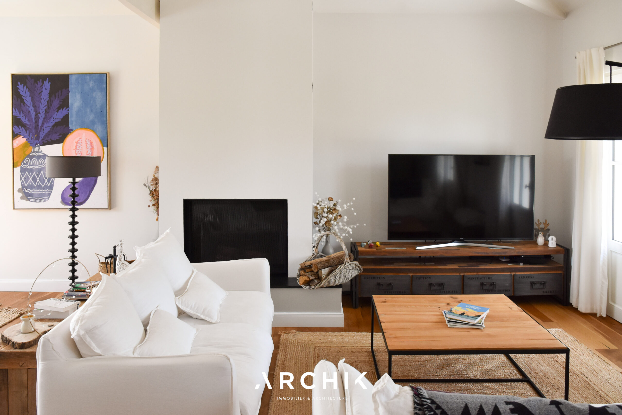 Au rez-de-chaussée, une véritable entrée distribue un vaste espace de vie aux tonalités neutres, réchauffé par un parquet en chêne massif. Sous la charpente cathédrale, les différents usages s'organisent en un volume fluide : le salon prend place autour d'une cheminée contemporaine, l'espace repas bénéficie d'un angle vitré cadrant les cimes des arbres, tandis que la cuisine et son arrière-cuisine, entièrement équipées et habillées de blanc, s'articulent autour d'un îlot convivial en bois massif. Dans le prolongement, une terrasse aux garde-corps en verre surplombe la piscine et prolonge le regard vers le paysage.