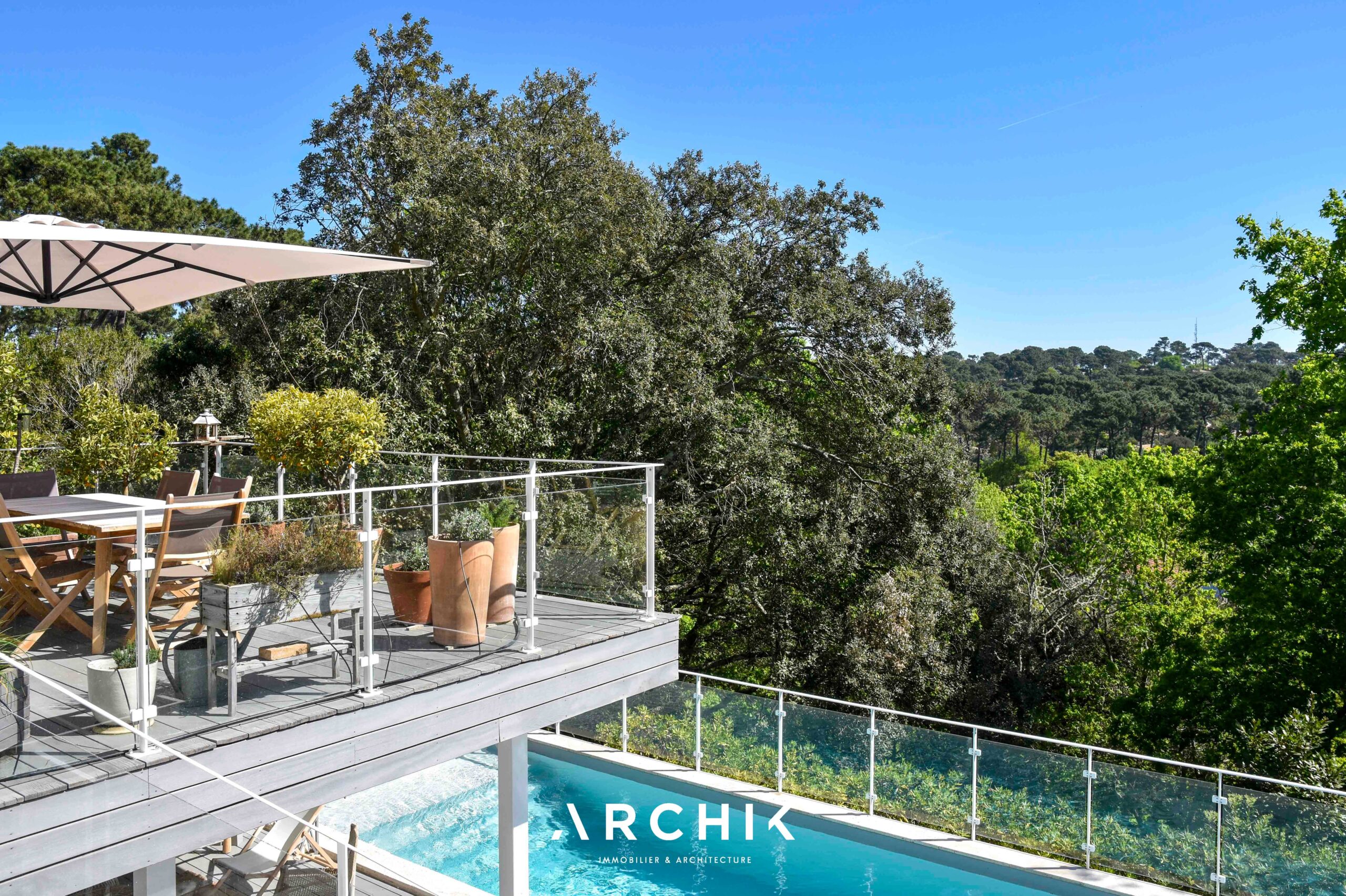 Architecture des années 70 d'inspiration régionaliste, cette maison de 180 m2 prend place en position dominante sur une parcelle de 1 023 m2, au coeur du très recherché quartier du Domaine de la Forêt au Pyla-sur-Mer. Nichée dans un environnement végétal privilégié, elle offre une superbe vue sur la canopée.