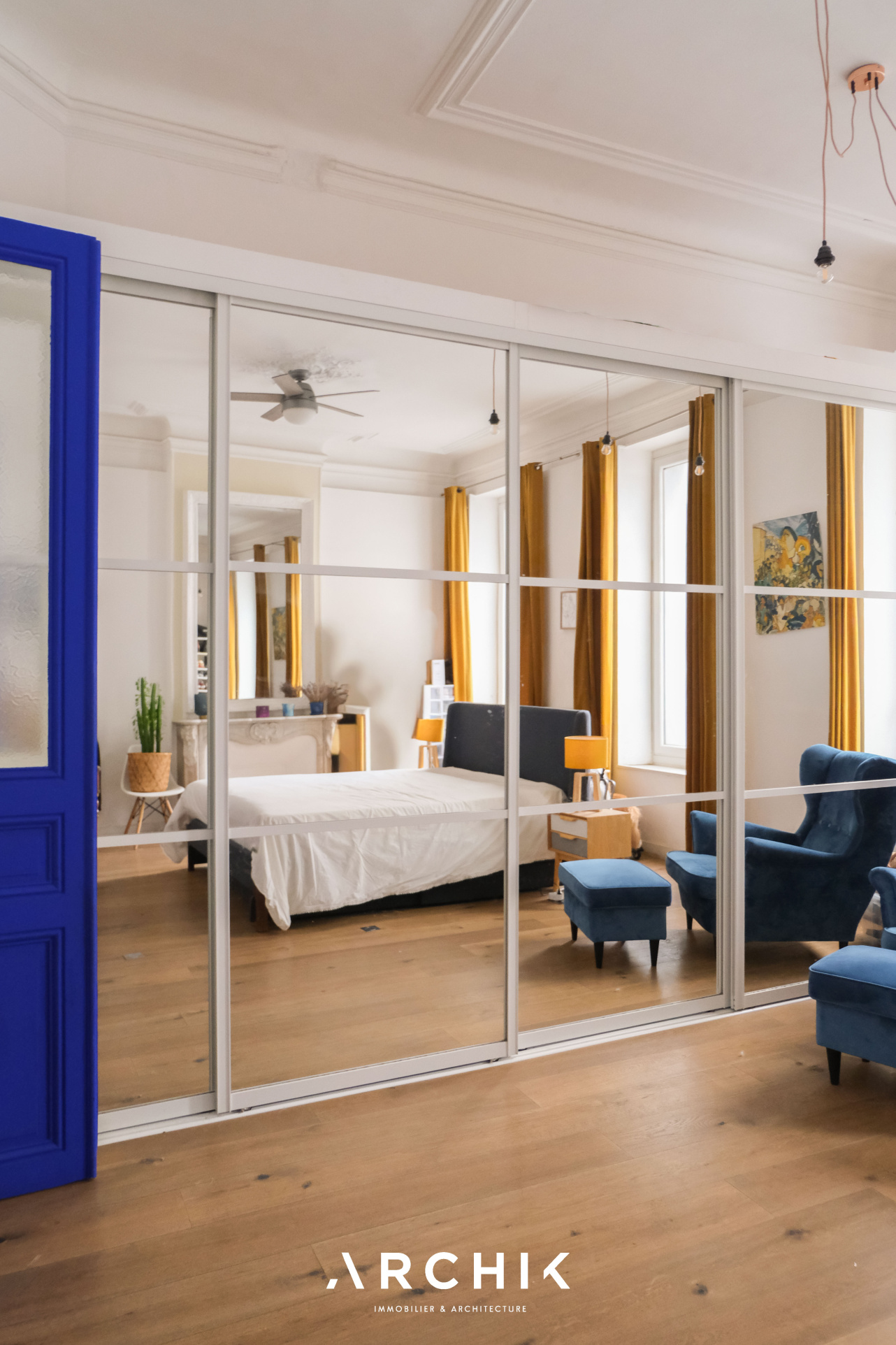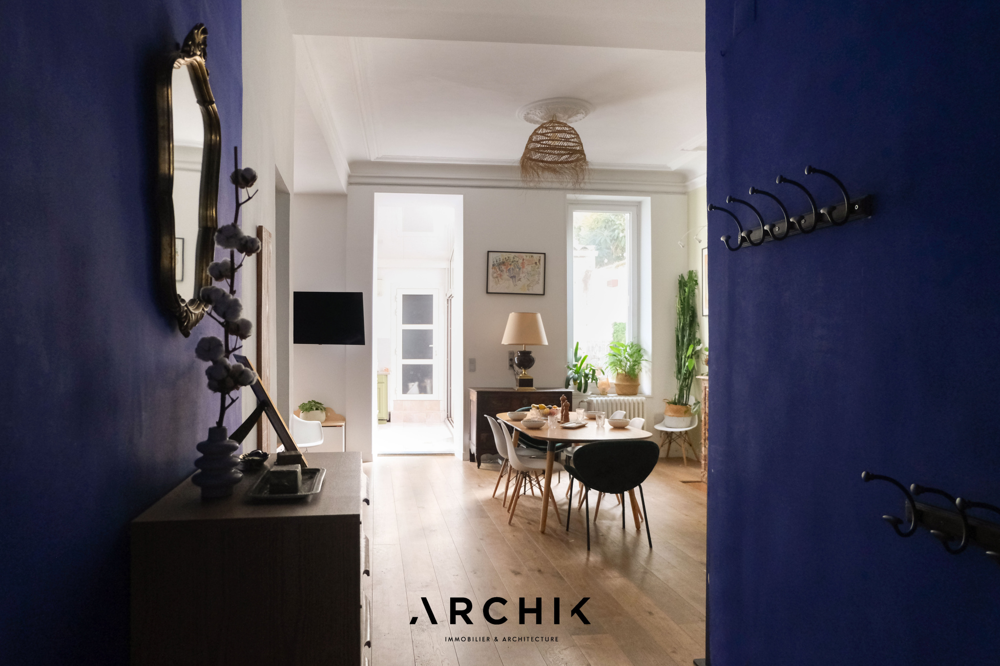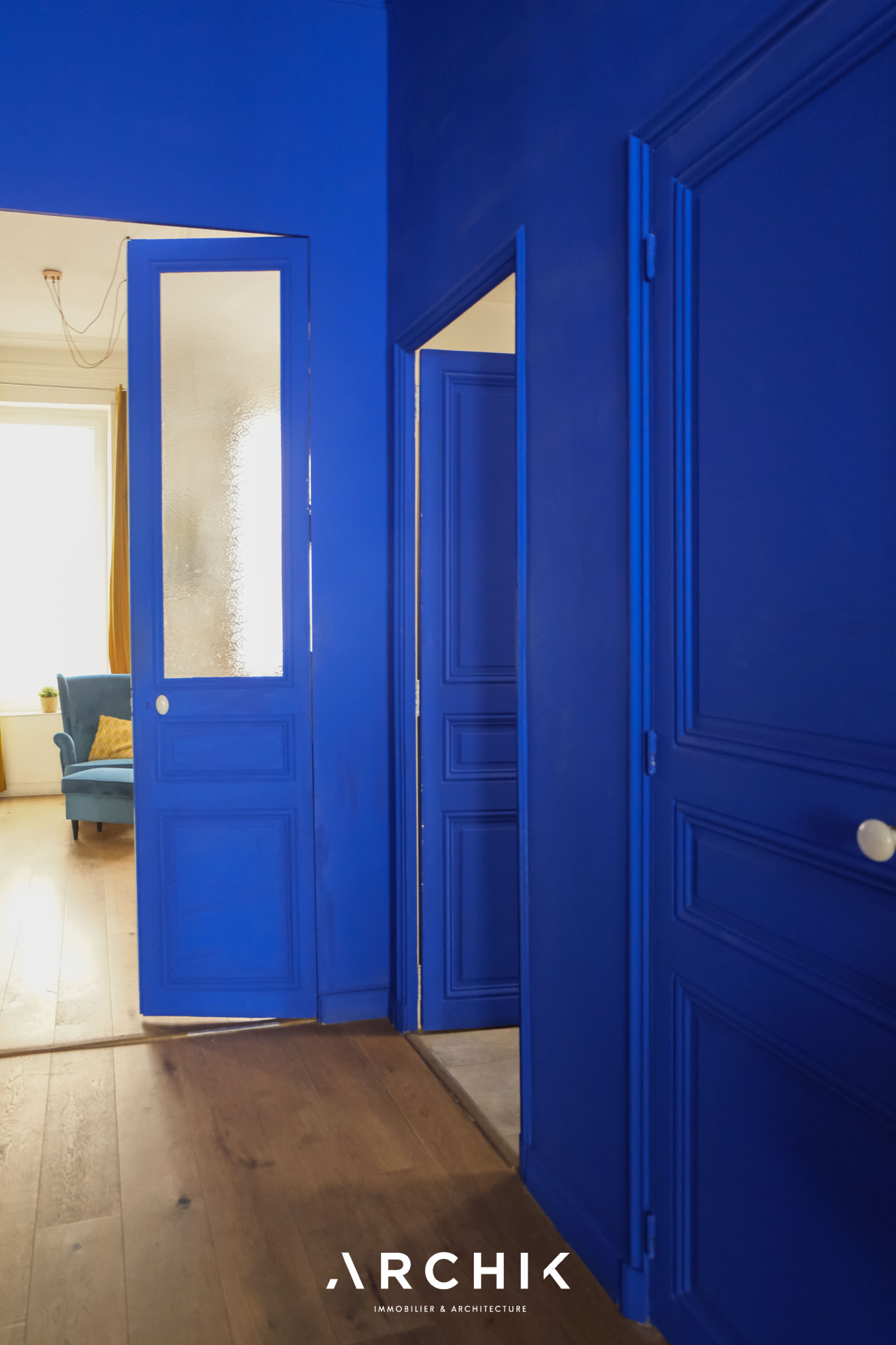 Dès l'entrée, les murs bleu Klein contrastent parfaitement avec le charme de l'ancien préservé : hauteurs sous plafond, cheminées en marbre, rosaces, les éléments ont été conservés.