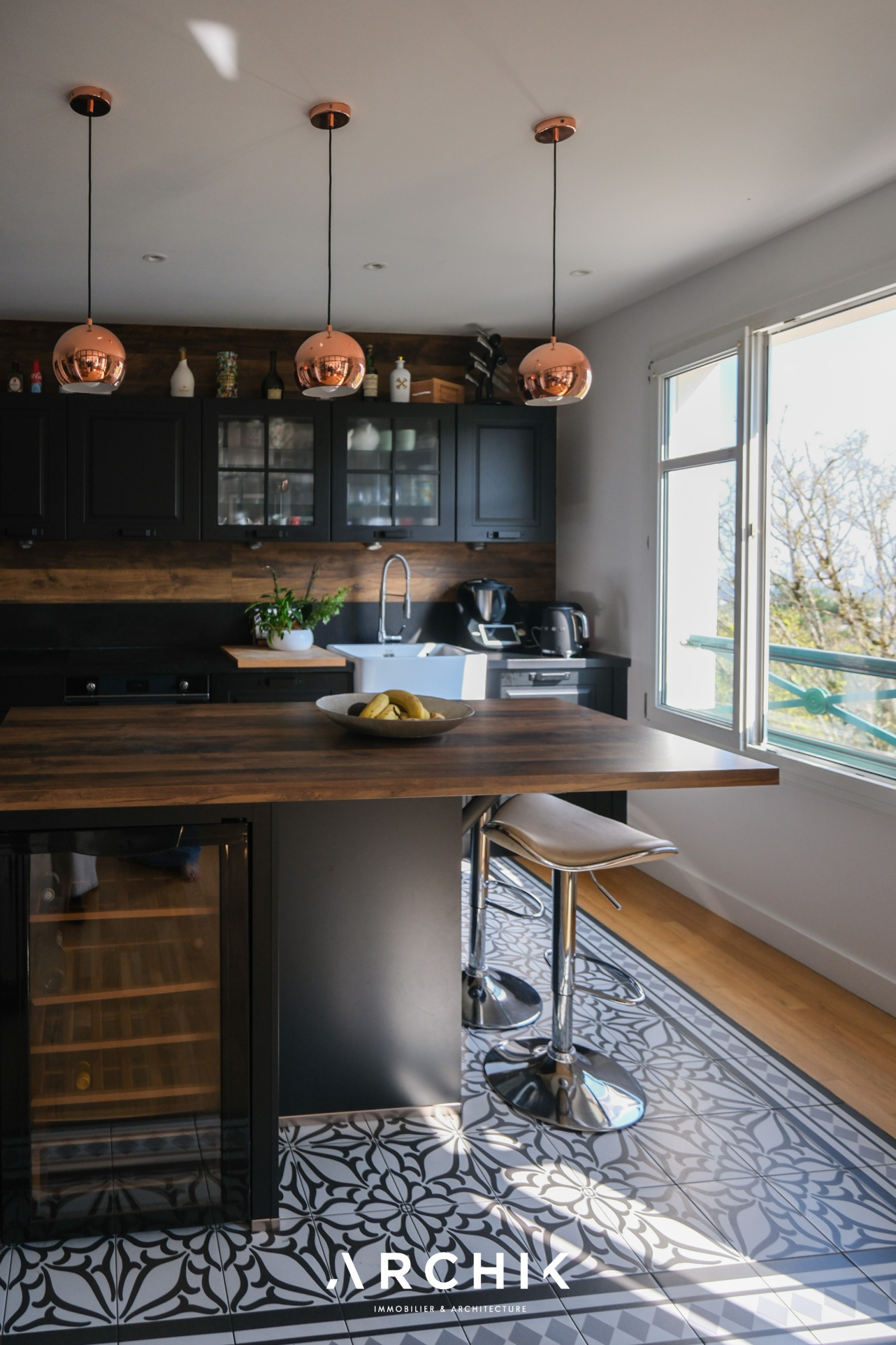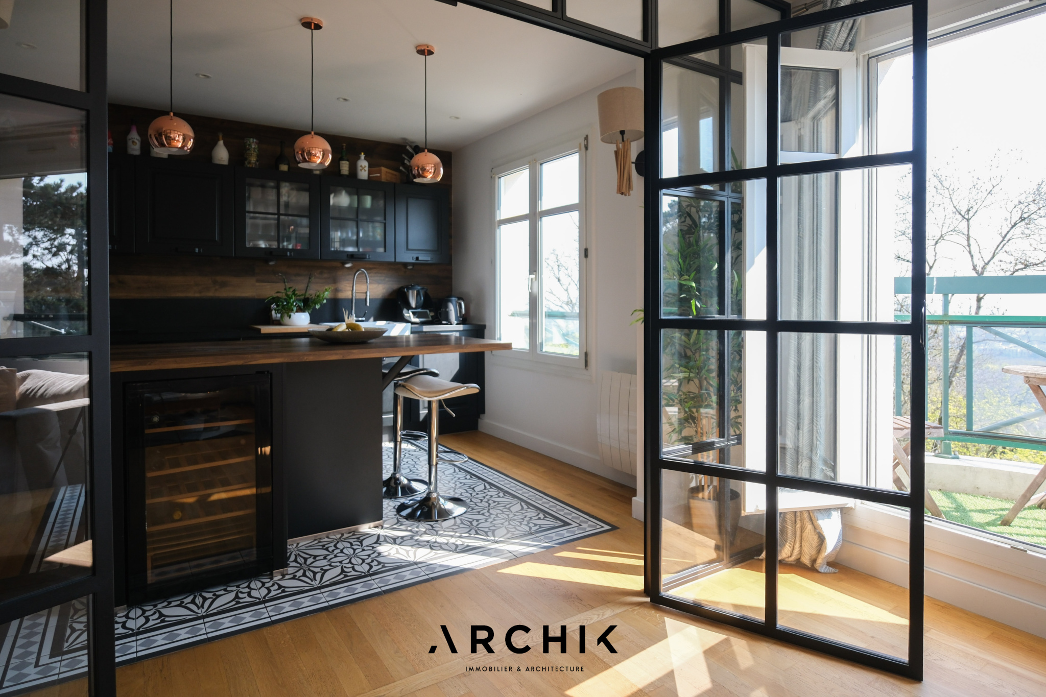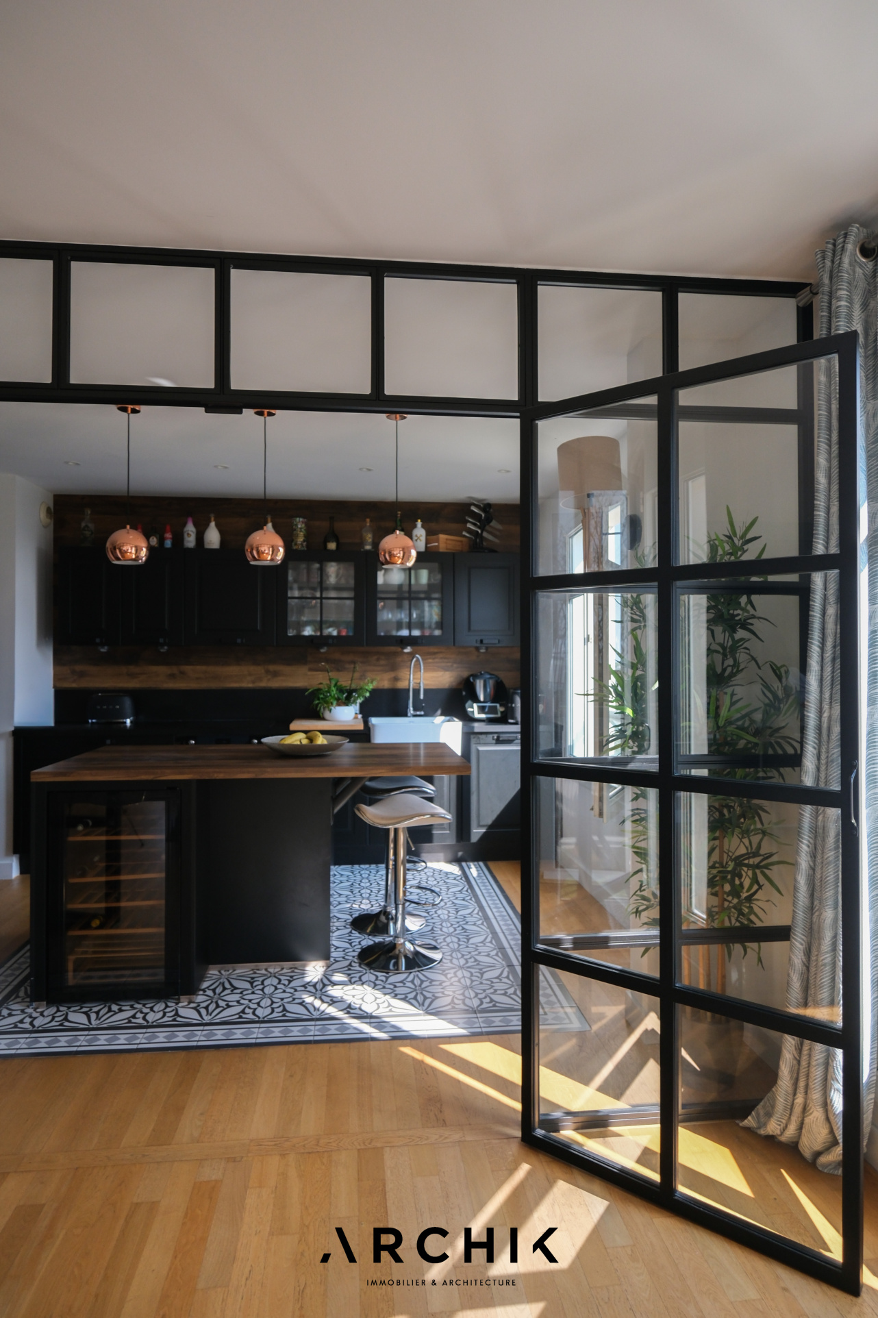 Dès l'entrée, un hall élégamment délimité mène à une cuisine italienne sur mesure, semi-ouverte et agrémentée de verrières type atelier en métal noir. Conçue comme un véritable espace de convivialité au design épuré, elle associe des façades noires raffinées, un plan de travail effet bois avec îlot central et un parquet en chêne clair à larges lames, ponctué de carreaux de ciment apportant une touche d'élégance.