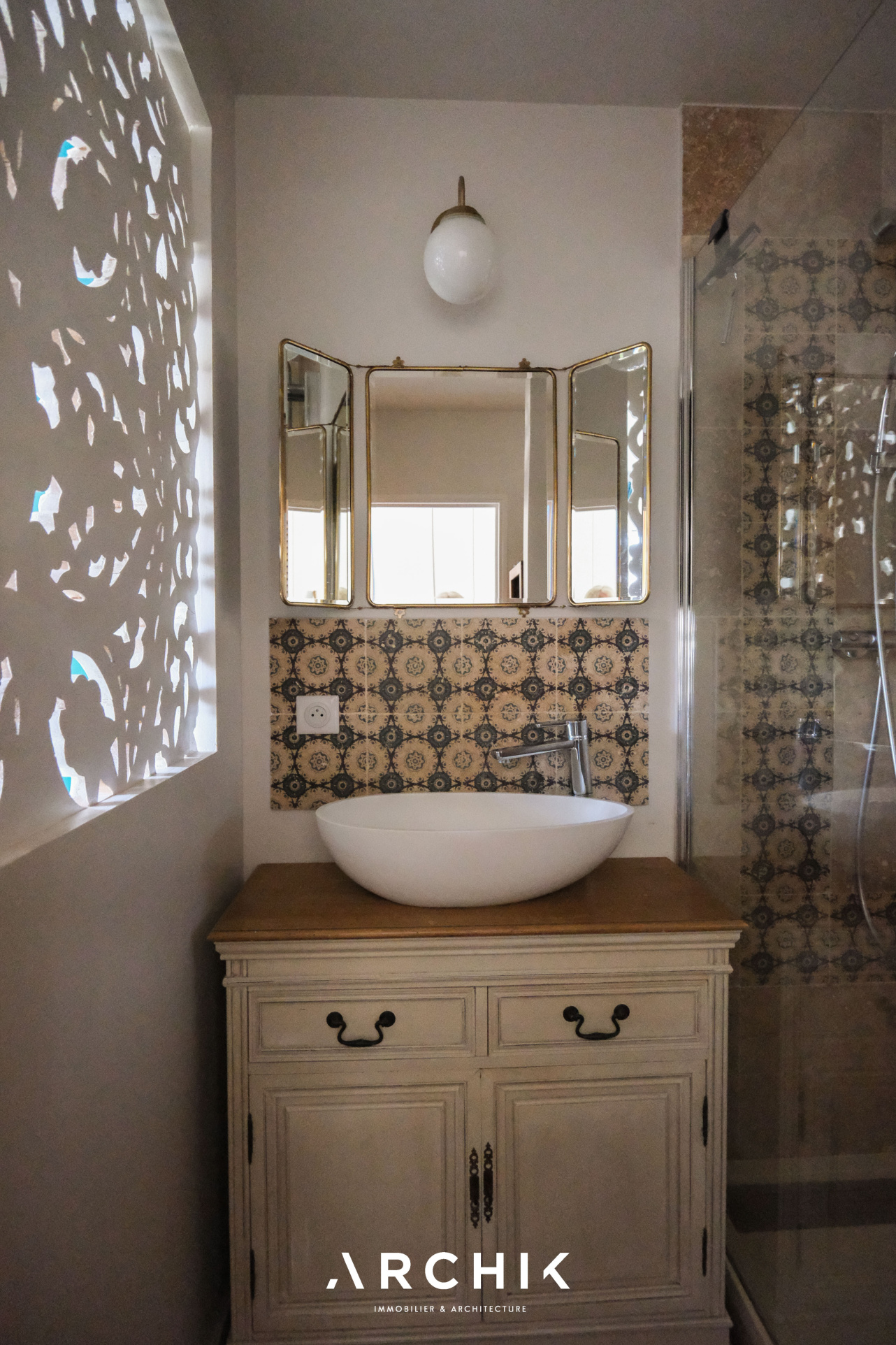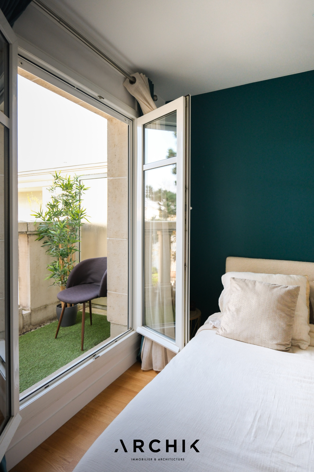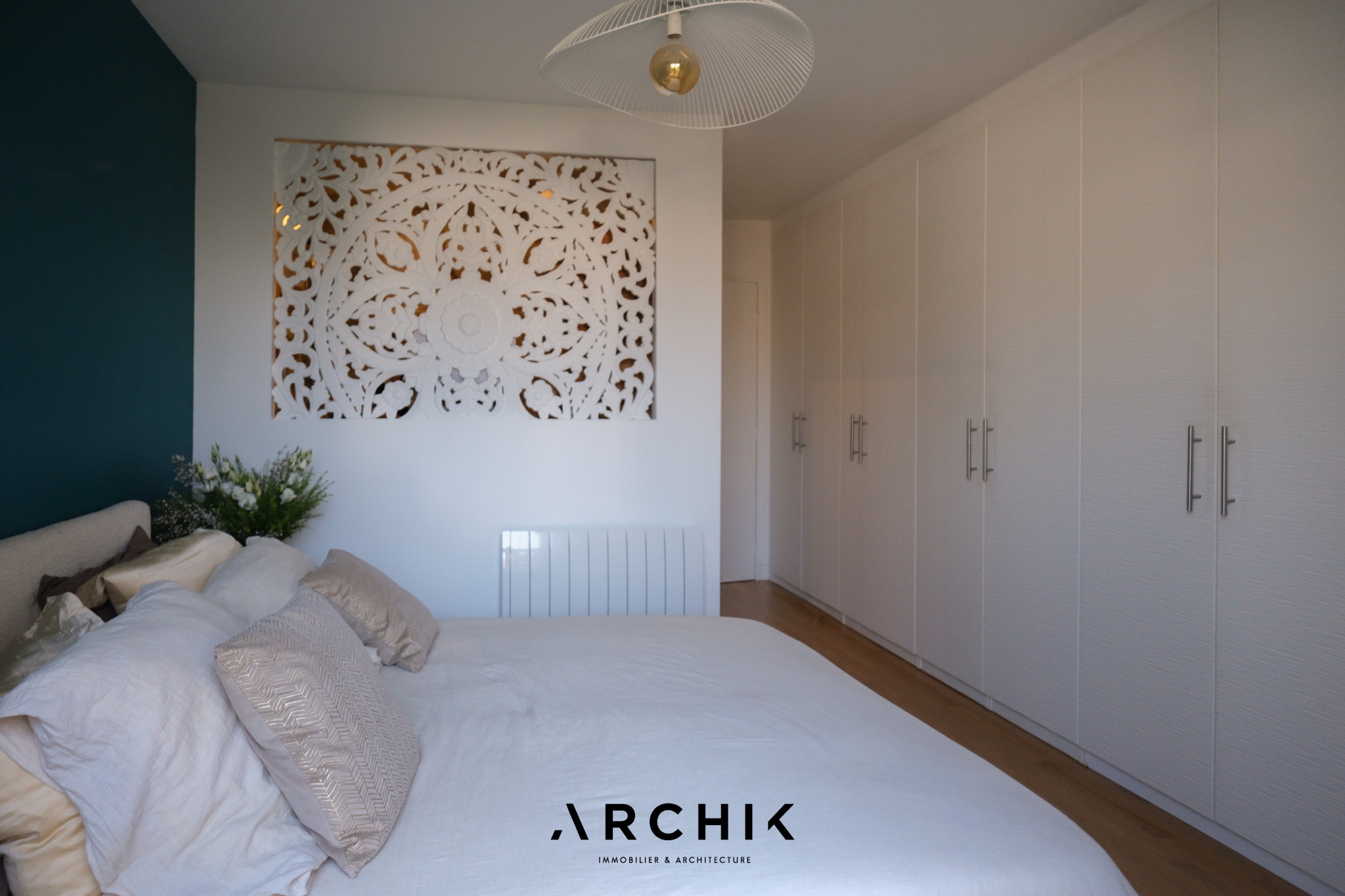 Un couloir dessert trois chambres, toutes orientées vers un troisième espace extérieur avec balcon. La suite parentale, pensée comme un véritable cocon, dispose d'un dressing aux portes toute hauteur ivoire et d'une salle d'eau aux teintes claires, avec sol en travertin, subtilement séparée par une élégante claustra en bois ajouré.
