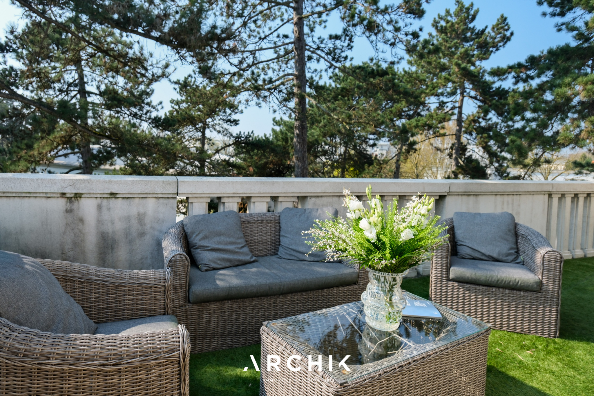 À l'extérieur, la terrasse aménagée prolonge harmonieusement l'espace de vie et constitue un lieu idéal pour se détendre.