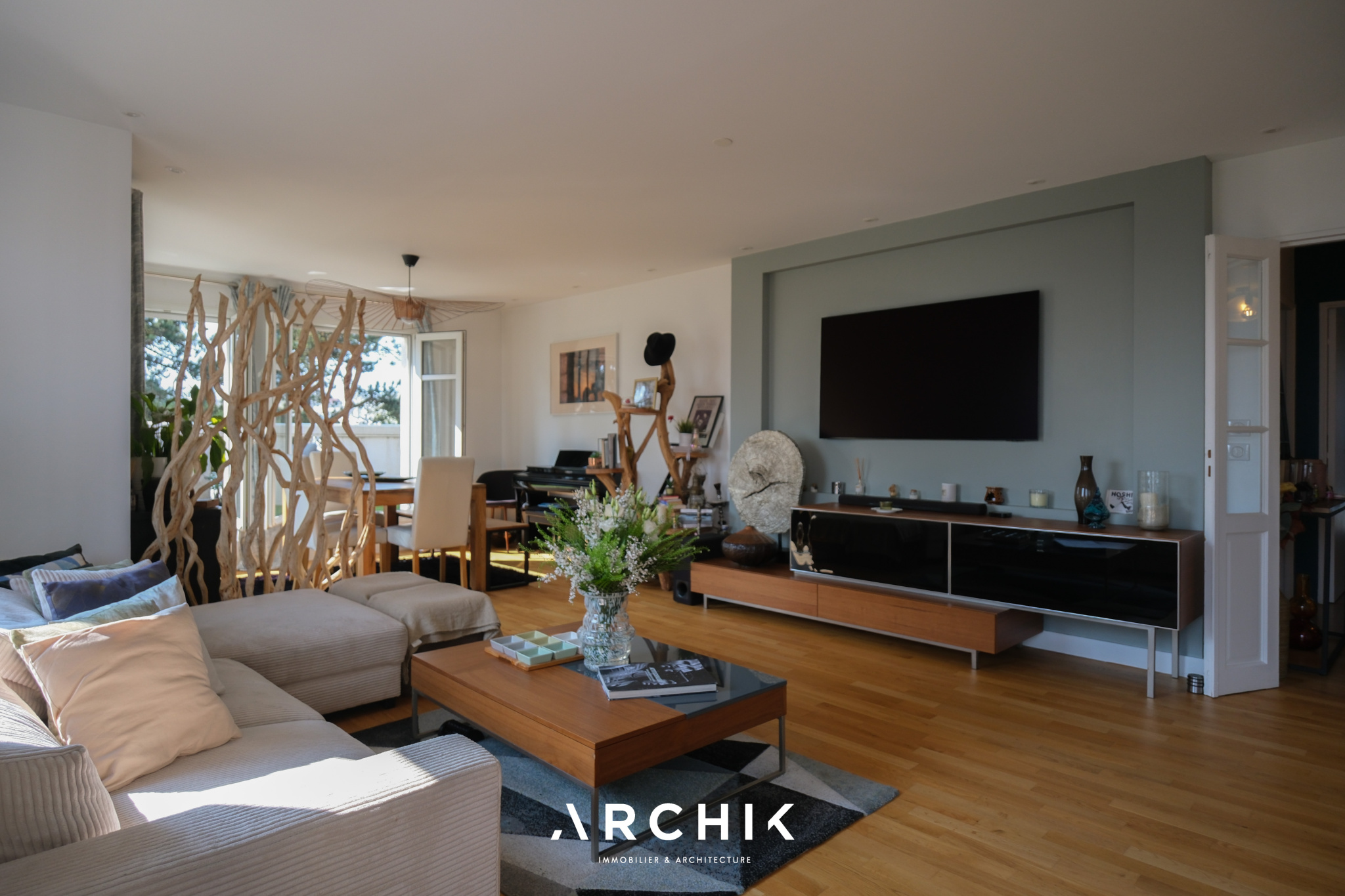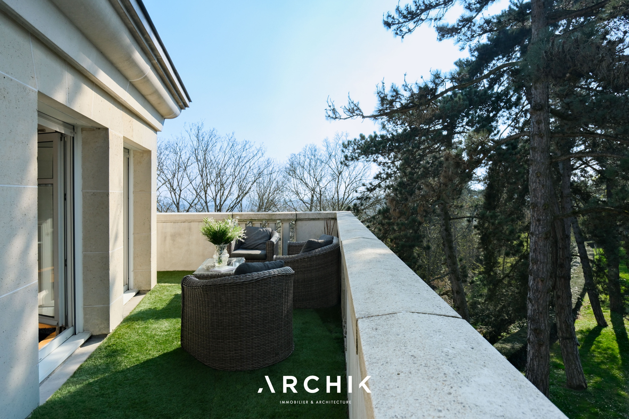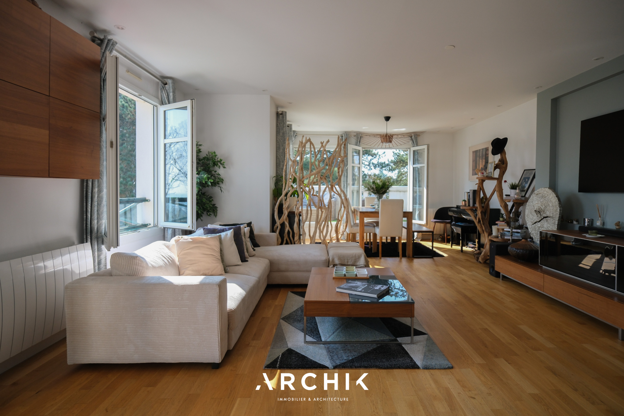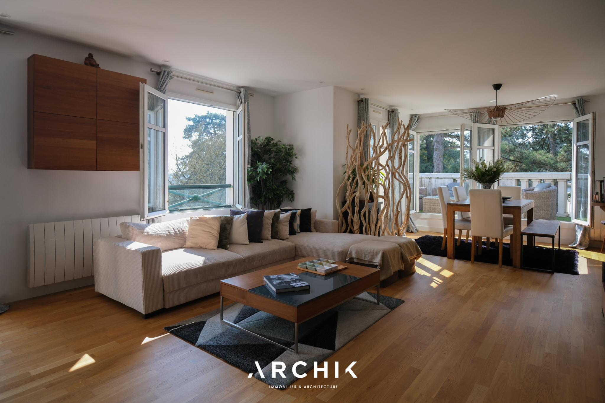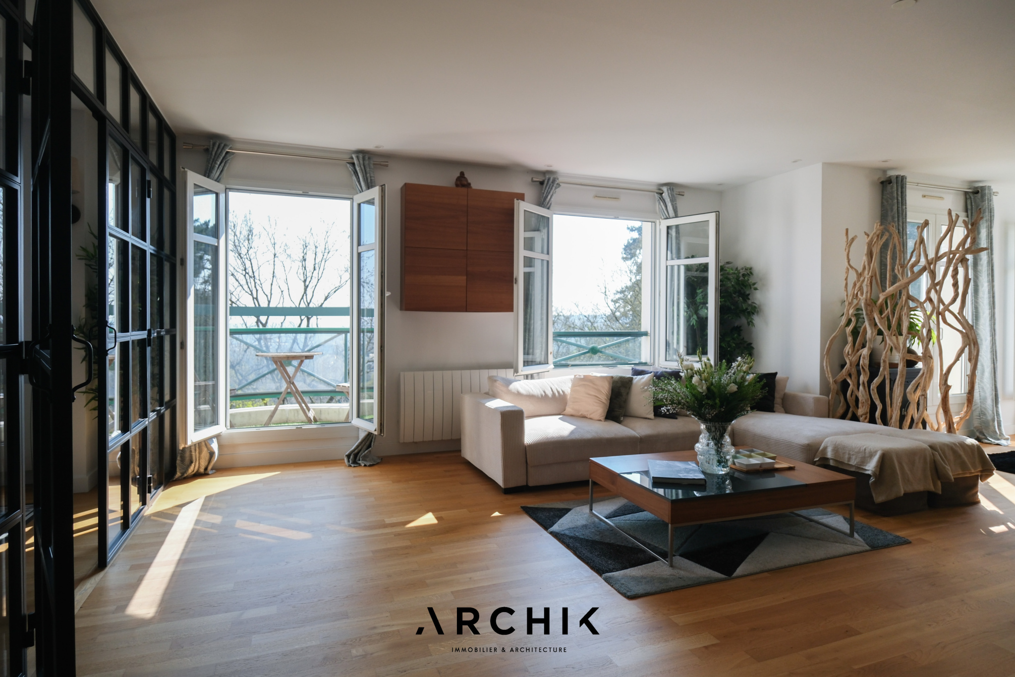 Le salon traversant, exposé Sud-Ouest, bénéficie d'une luminosité exceptionnelle. Il s'ouvre d'un côté sur un balcon et de l'autre sur une vaste terrasse, offrant une sensation d'espace remarquable grâce à une vue panoramique entièrement dégagée sur un parc aux arbres centenaires ainsi que sur la vallée.