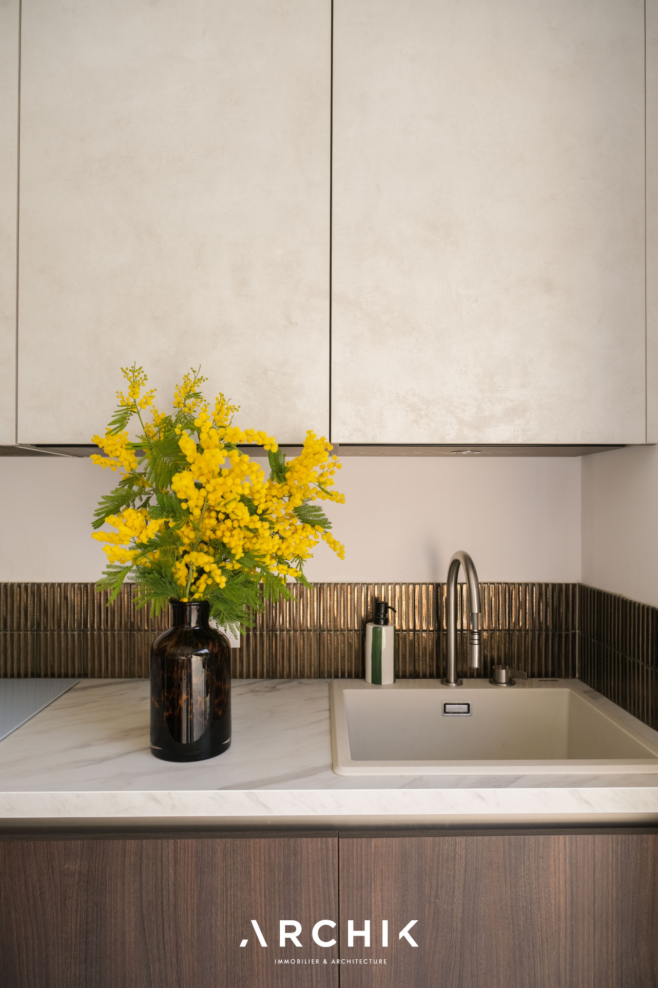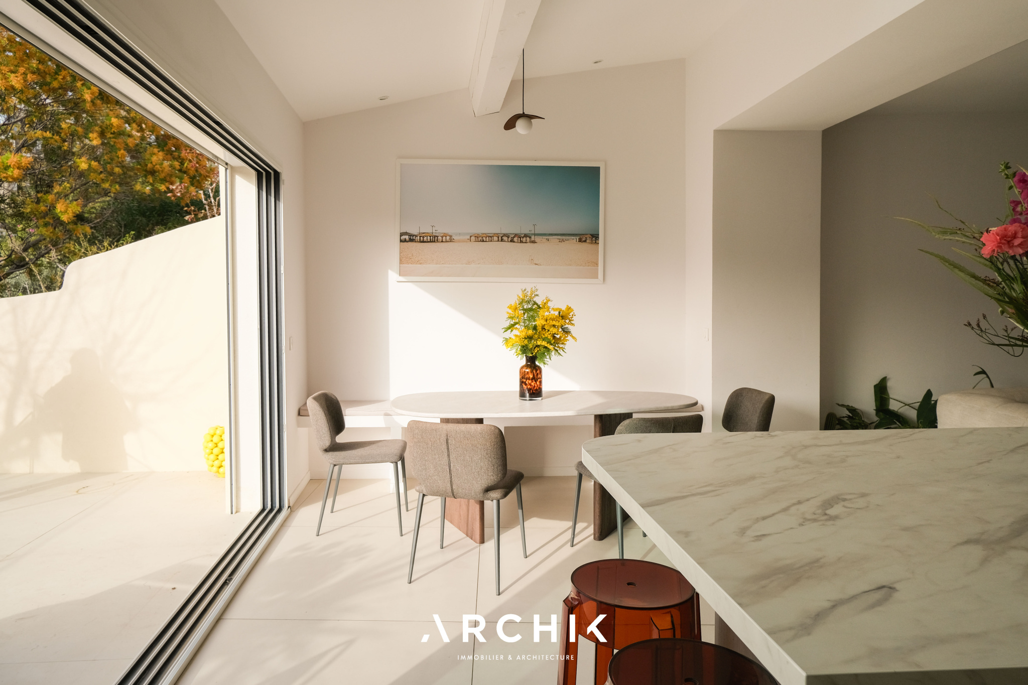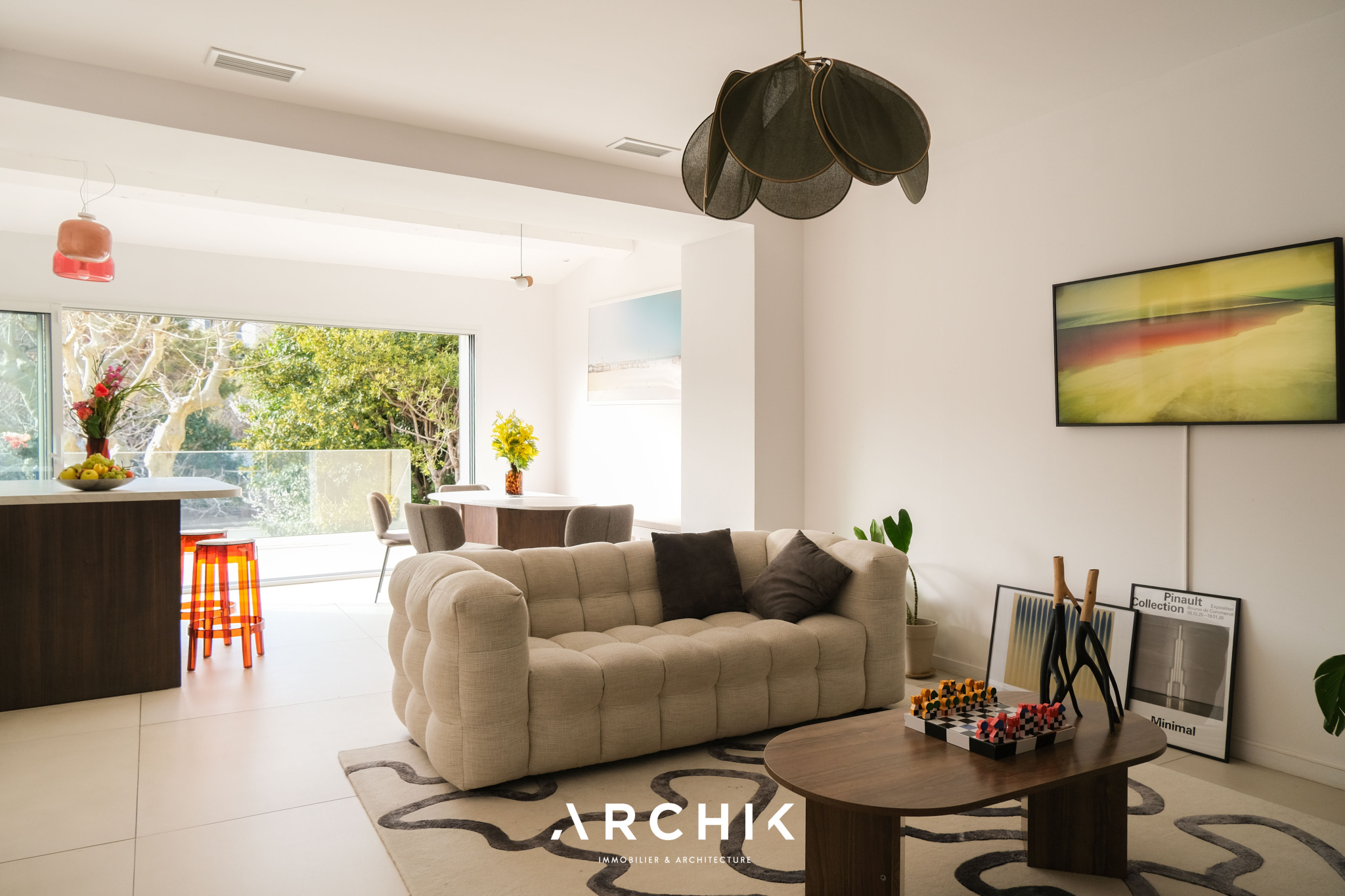 Entièrement repensée par ses propriétaires, dans un esprit contemporain la maison aux inspirations méditerranéennes, se découvre sur 3 niveaux, au gré d'un escalier en bois témoin de l'histoire de la maison. Matières naturelles et minérales, palette de tons sable et terracotta et faïences texturées composent un écrin apaisant en dialogue constant avec l'extérieur. Entièrement ouvert, le rez-de-chaussée offre un espace d'entrée confortable et se prolonge par une pièce de vie largement ouverte sur l'extérieur. D'un côté, la cuisine intégrée sous une double hauteur, s'habille de façades boisées et d'une crédence texturée aux tonalités bronze. Elle s'organise autour d'un îlot central et se prolonge vers un espace repas baigné de lumière. Le salon, aux assises enveloppantes, s'inscrit dans cette continuité. L'ensemble s'ouvre par de larges baies sur une terrasse panoramique d'environ 20 m2, suspendue au-dessus du jardin. En contrebas, le jardin déploie près de 300 m2 arborés. D'un côté, Une terrasse avec cuisine d'été s'habille d'éléments maçonnés égayés d'un large claustra terracotta à l'esprit moucharabieh. Elle domine l'ensemble, qui s'étire jusqu'à une piscine aux lignes épurées, nichée dans la végétation.